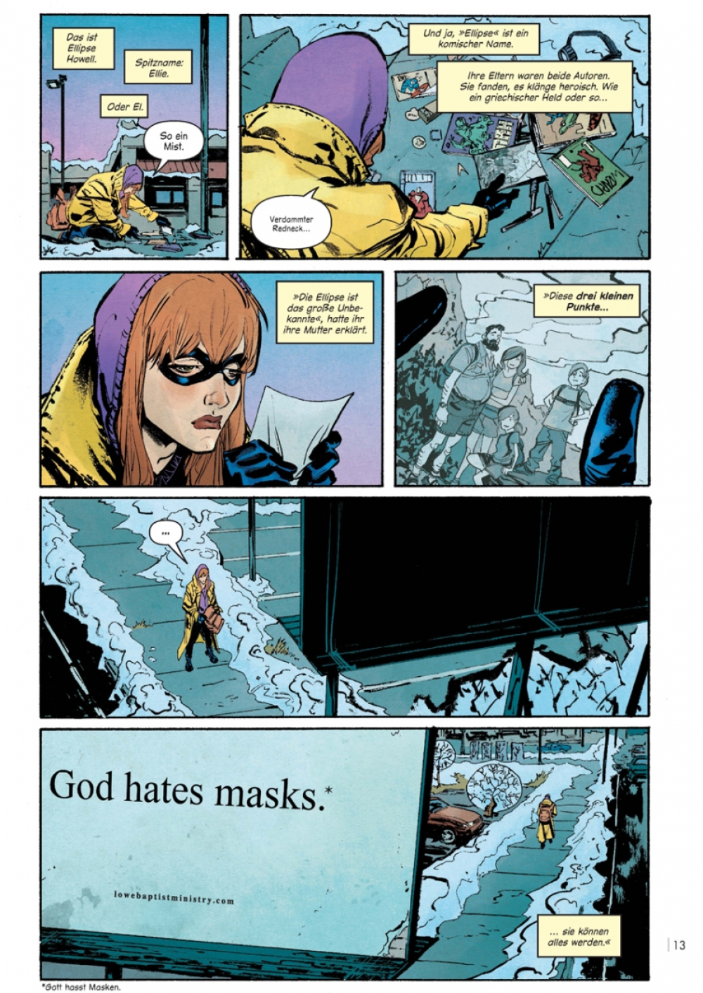 In einer Welt, in der jede Comicfigur, die es jemals gab, Realität ist und in der Superhelden und Erzschurken zur verheerenden Naturkatastrophe wurden, sind Comicleser Ausgestoßene und Comicautoren ernten echten Hass. In dieser Welt begibt sich Cosplayerin Ellie auf eine lange Reise, um ein kleines Mädchen zurück nach Hause zu bringen (und sich dabei vielleicht selbst zu retten).