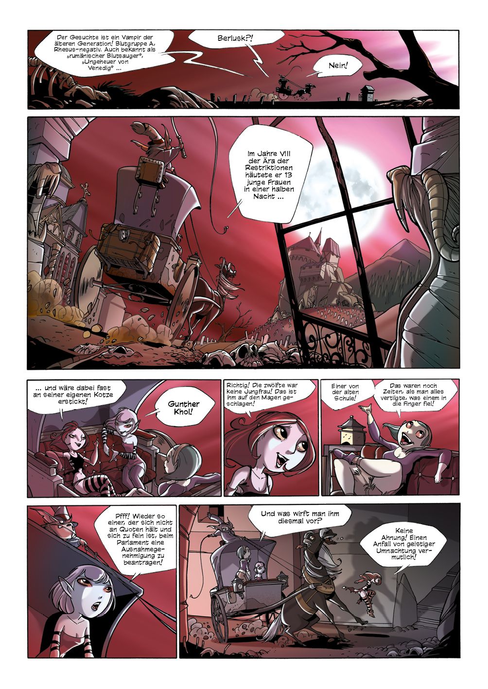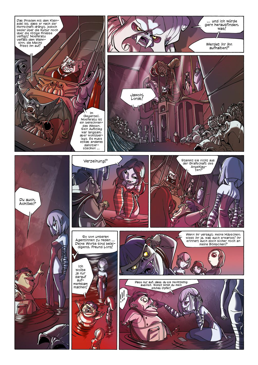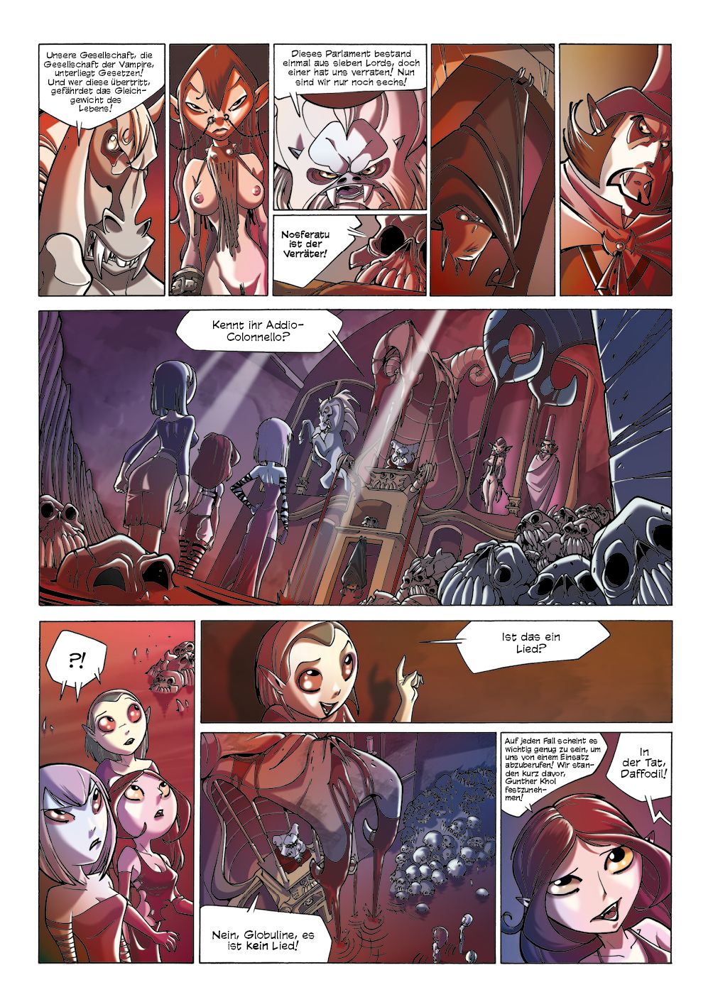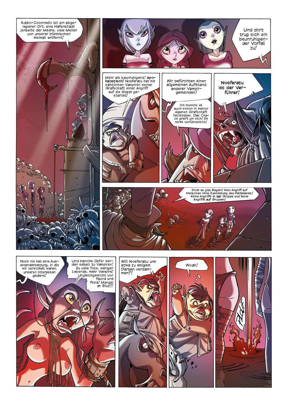 Addio-Colonnello, ein verschlafenes Hafenstädtchen, irgendwo hinter dem großen Meer. Seine Bewohner leben friedlich vor sich hin, bis eines Tages plötzlich Nosferatu mit seiner Vampirlegion bei ihnen einfällt. Doch was sind seine Motive? Das will auch das Vampirparlament herausfinden, das auf die friedliche Koexistenz von Blutsaugern und Menschen Wert legt ... denn zu je mehr Großangriffen einzelner Vampirgruppierungen es kommt - deren Opfer dann womöglich auch noch selbst zu Vampiren werden -, desto weniger Nahrung bleibt letztlich für alle anderen. So werden Daffodil, Globuline und Achilles, die drei besten Agentinnen des Parlaments, losgeschickt, um Nosferatus Plänen auf die Schliche zu kommen. Hat er einfach nur Spaß am Töten oder steckt mehr dahinter?