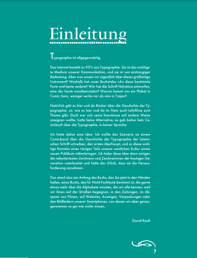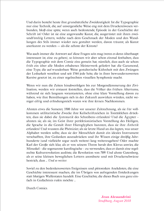 In diesem Buch beschreiben acht Zeichner auf leicht zugängliche und spielerische Weise die großen Etappen ihrer Geschichte, von der Entstehung der lateinischen Schrift bis zum Fotosatz, vom alten Rom bis zum Bauhaus und der DIN 1451