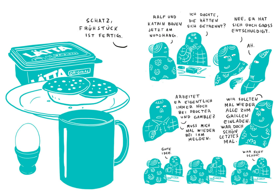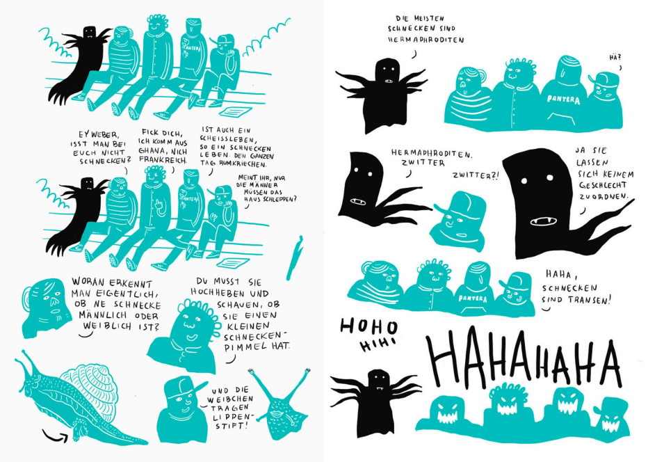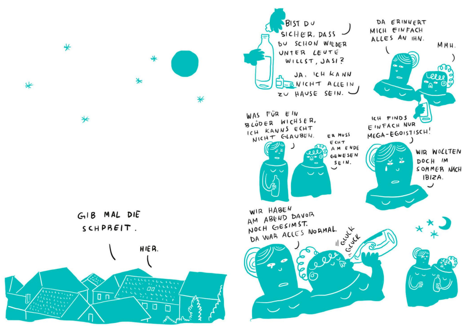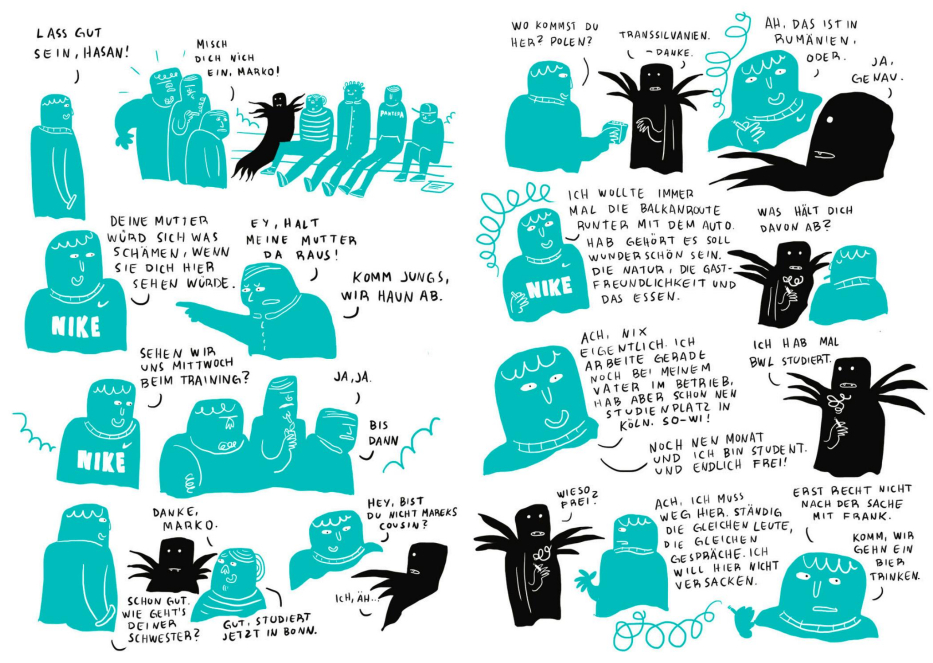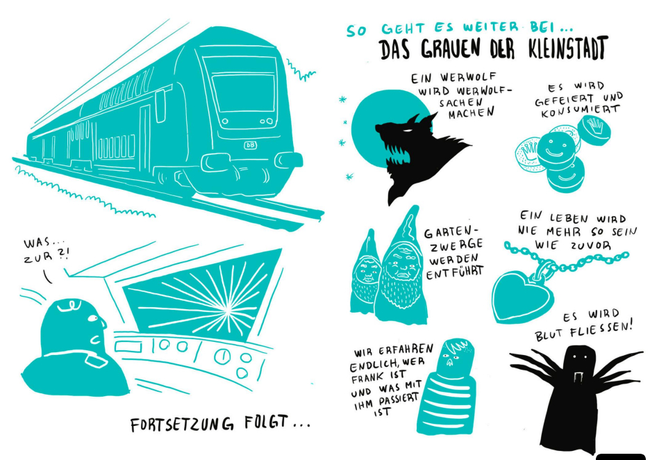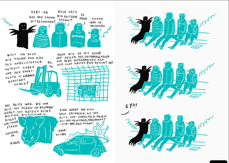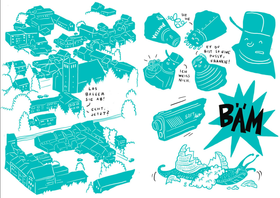 Trotz all der den Geschehnissen innewohnenden Tragik ist Jan Blums Comic ein eher komödiantisches Stück und gar nicht so grauenvoll. Allein die Knuffigkeit seiner Comic-Figuren in Kombination mit den derben Gesprächen im Jugend-Slang, das ist so schön absurd und auch extrem unterhaltsam.