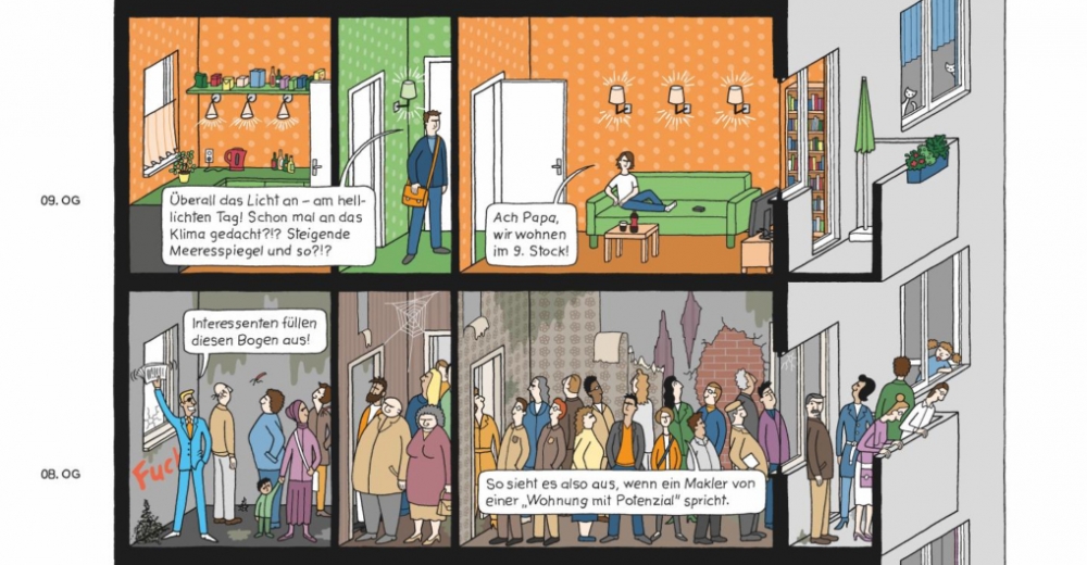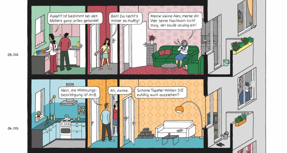 Wie bei einer technischen Zeichnung ist das Haus aufgeschnitten: Der Blick ins Innere der Wohnungen zeigt eine Momentaufnahme des Lebens der Bewohner.