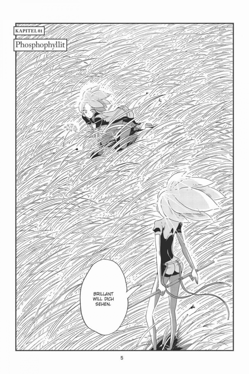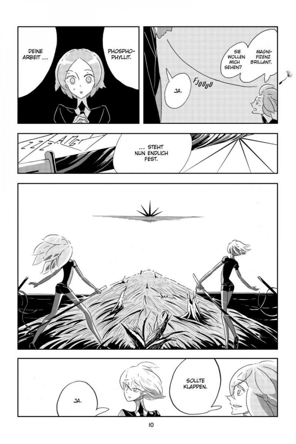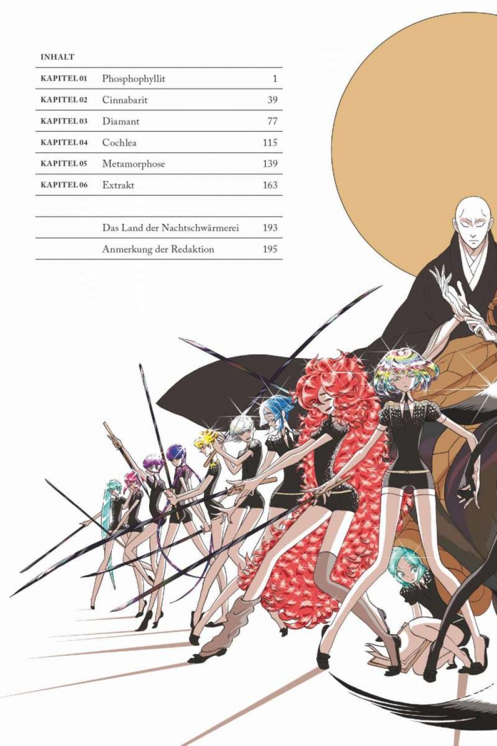 Phosphophyllit, besser bekannt unter dem Namen Phos, ist ein junger Edelstein, der davon träumt, seinen Freunden im Kampf gegen die Lunarianer beizustehen. Doch Phos ist zerbrechlich und nicht für den Kampf geeignet. Er wird stattdessen beauftragt, eine Enzyklopädie über die Natur und Geschichte der Welt zu erstellen. Auf der Suche nach Einträgen für sein Werk trifft er auf Cinnabarit, einen giftigen Edelstein, der nachts einsam Wache über das Land hält. Schon bald werden die beiden Freunde in die Wirren des uralten Krieges verwickelt …