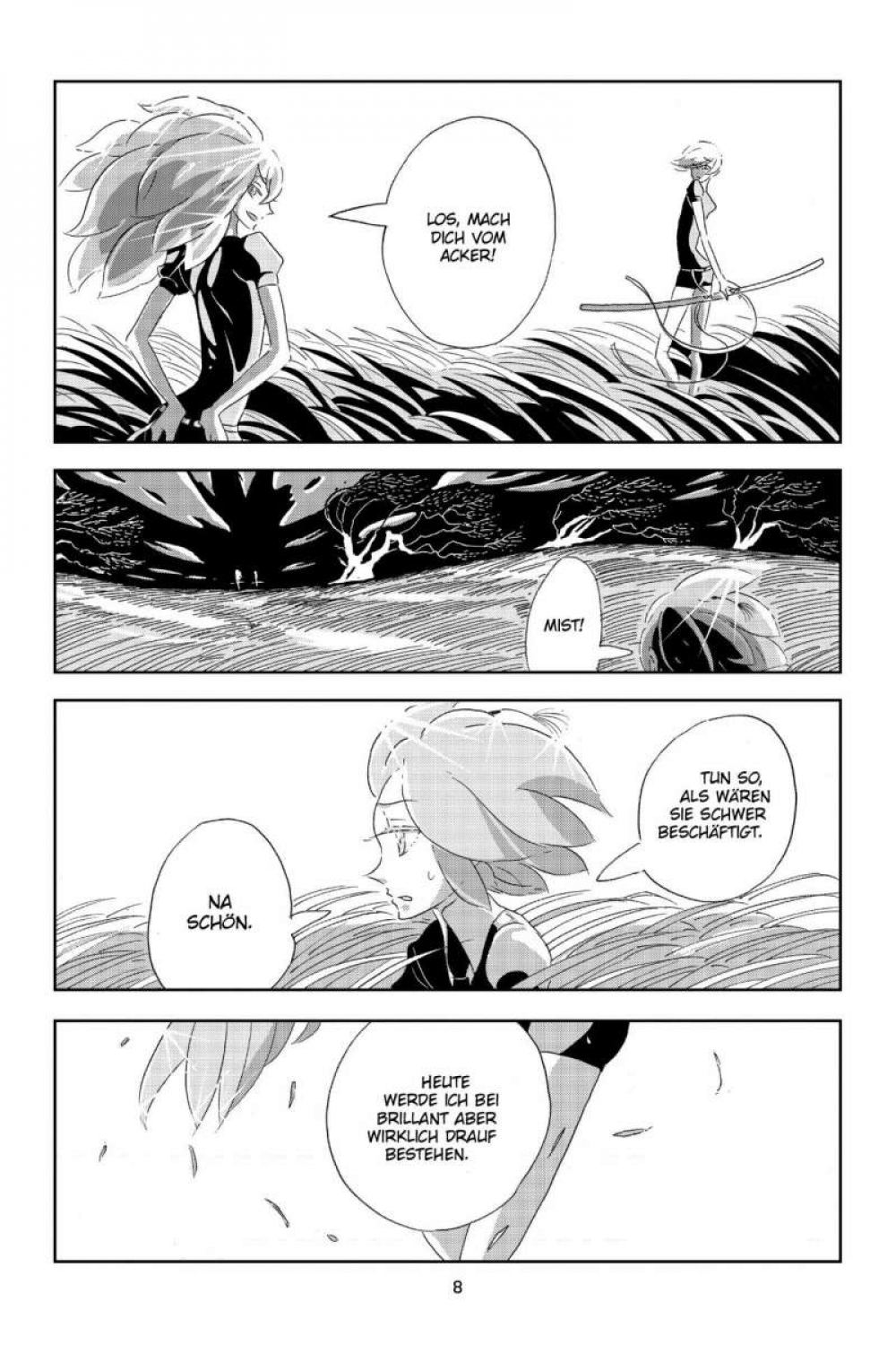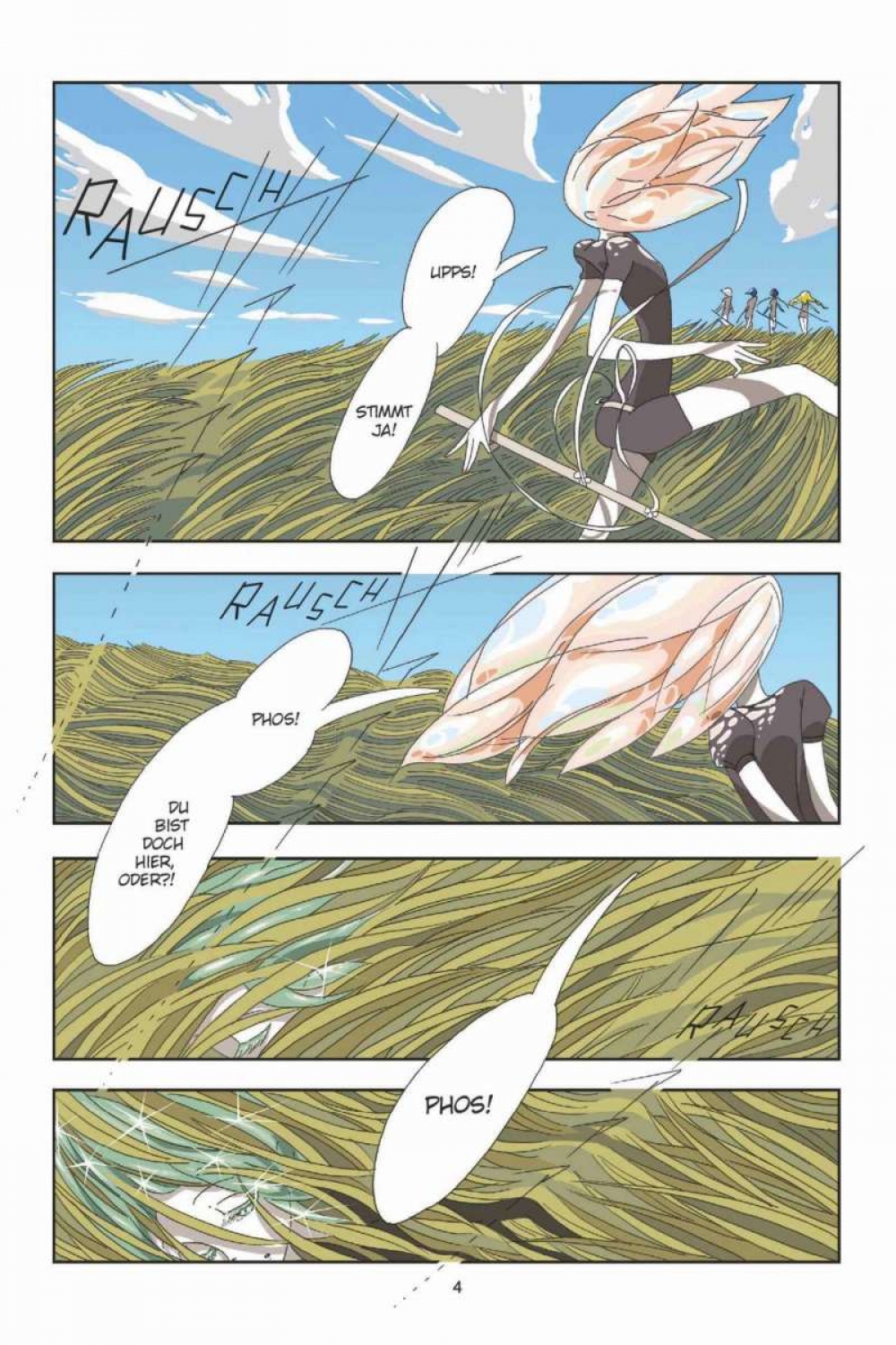 Sechs Meteoriten verwüsteten die Welt. Sechs Monde umkreisen nun das spärliche Land. Umgeben vom Ozean kämpft eine Handvoll Edelsteine in menschlicher Gestalt um ihr Überleben – gejagt von den niederträchtigen Bewohnern der Monde, die aus ihren Körpern Schmuck herstellen wollen.