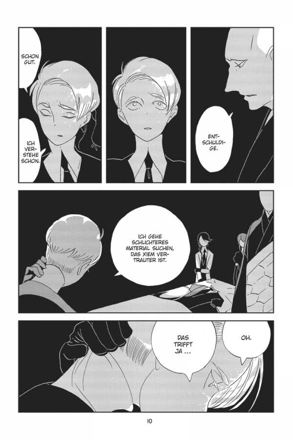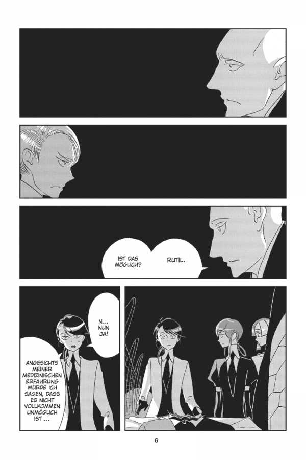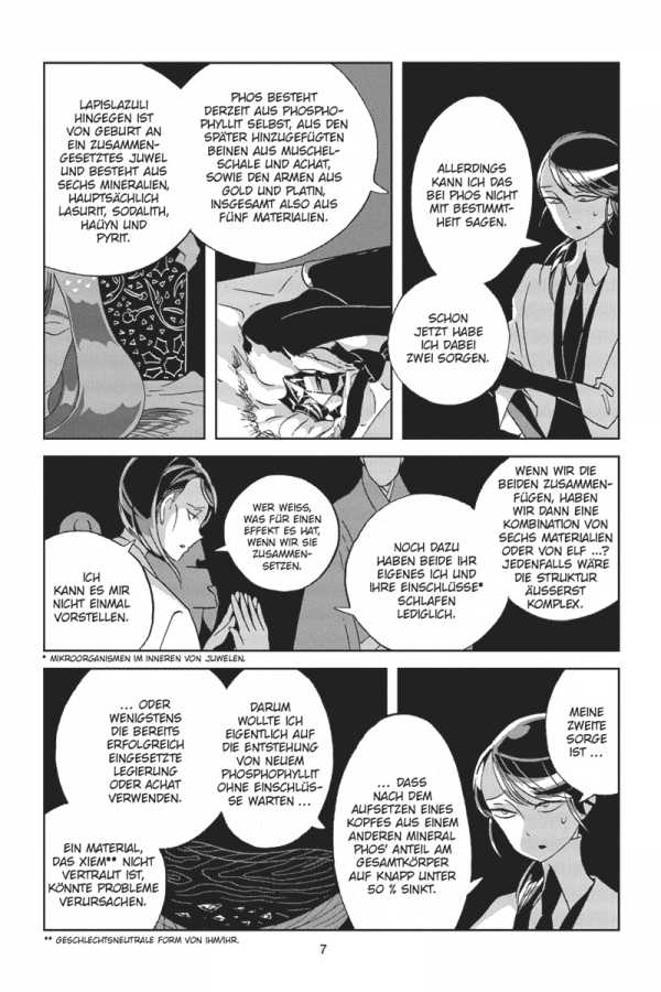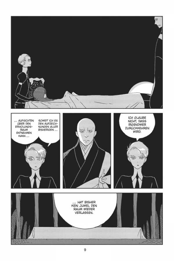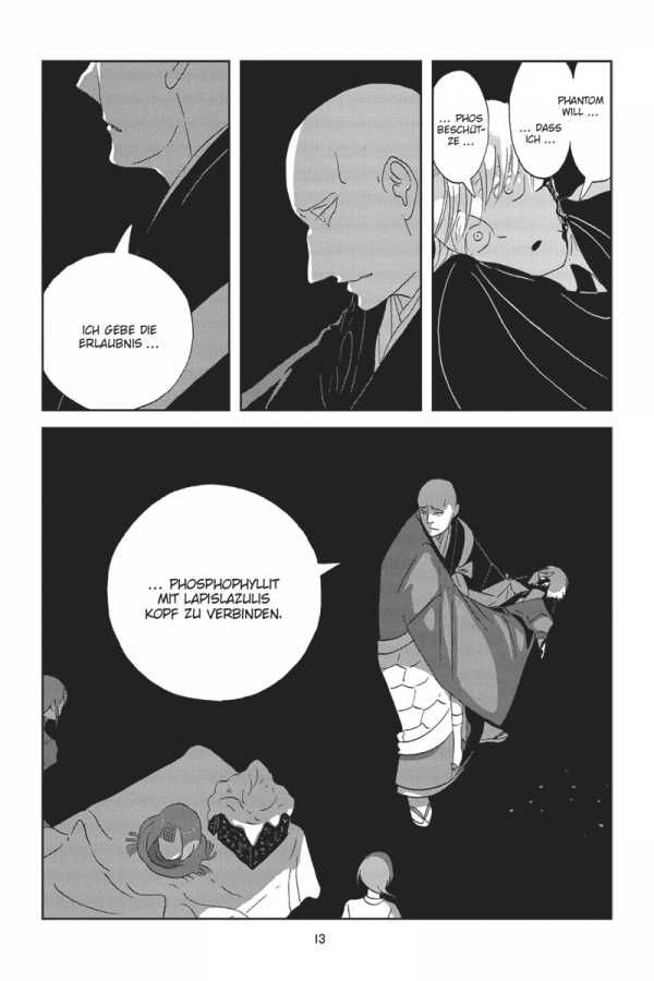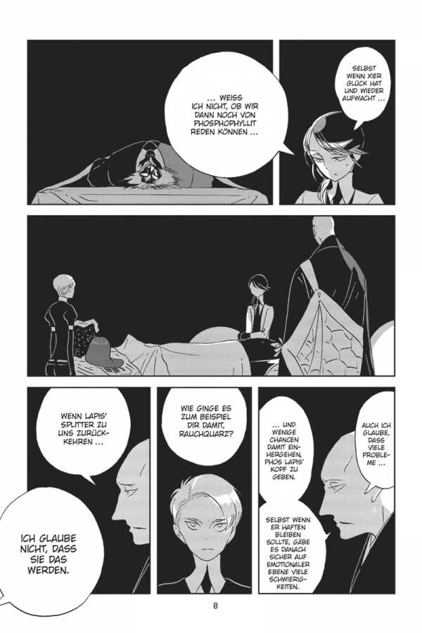 Phos hat bei der Suche nach der Wahrheit über den Krieg mit dem Mondvolk alles riskiert – und wurde dabei nicht nur schwer verwundet, sondern auch in Teilen auf die Monde entführt. Um Phos zu retten, transplantieren die anderen Juwelen den Kopf von Lapislazuli. Doch hundert Jahre vergehen, bis Phos wieder erwacht …