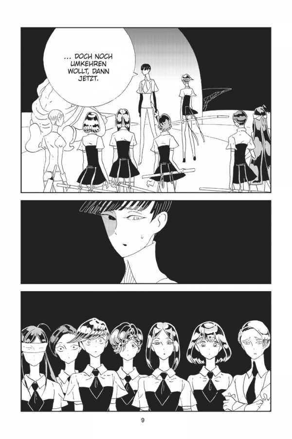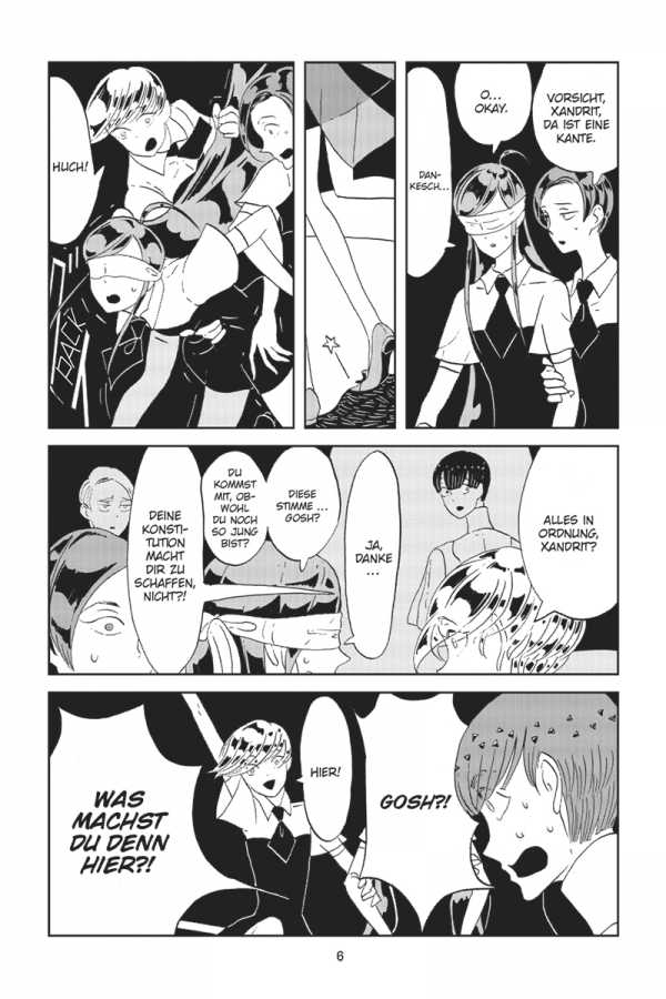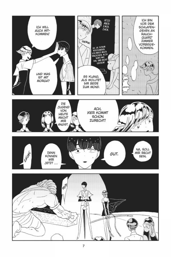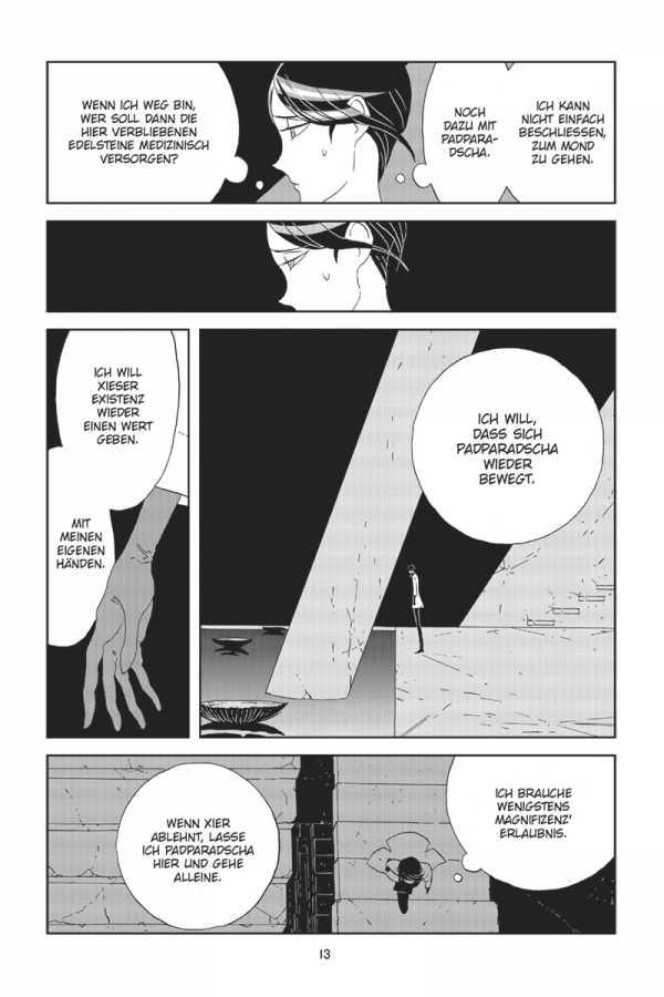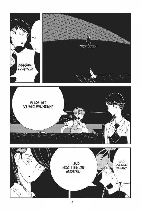 Auf dem Mond hat Phos endlich die Wahrheit über Brillant erfahren. Um die anderen Juwelen vor dem ewig andauernden Konflikt zwischen dem Mondvolk und Brillant zu bewahren, kehrt Phos mit einer kleinen Gruppe von Juwelen erneut auf die Monde zurück. Doch für die zurückgebliebenen Juwelen auf der Erde ändert diese Entscheidung alles …