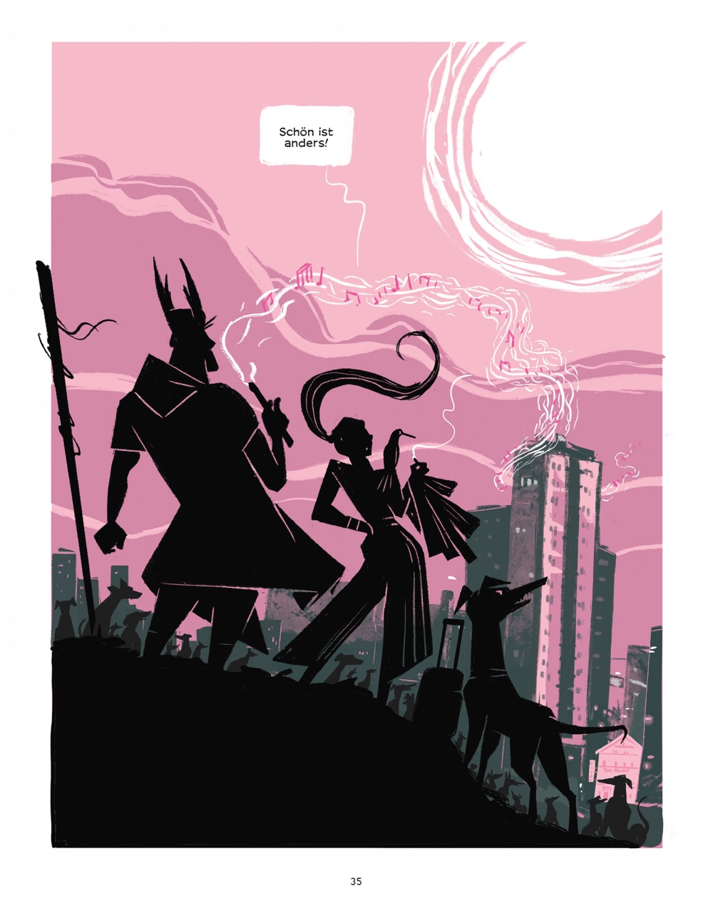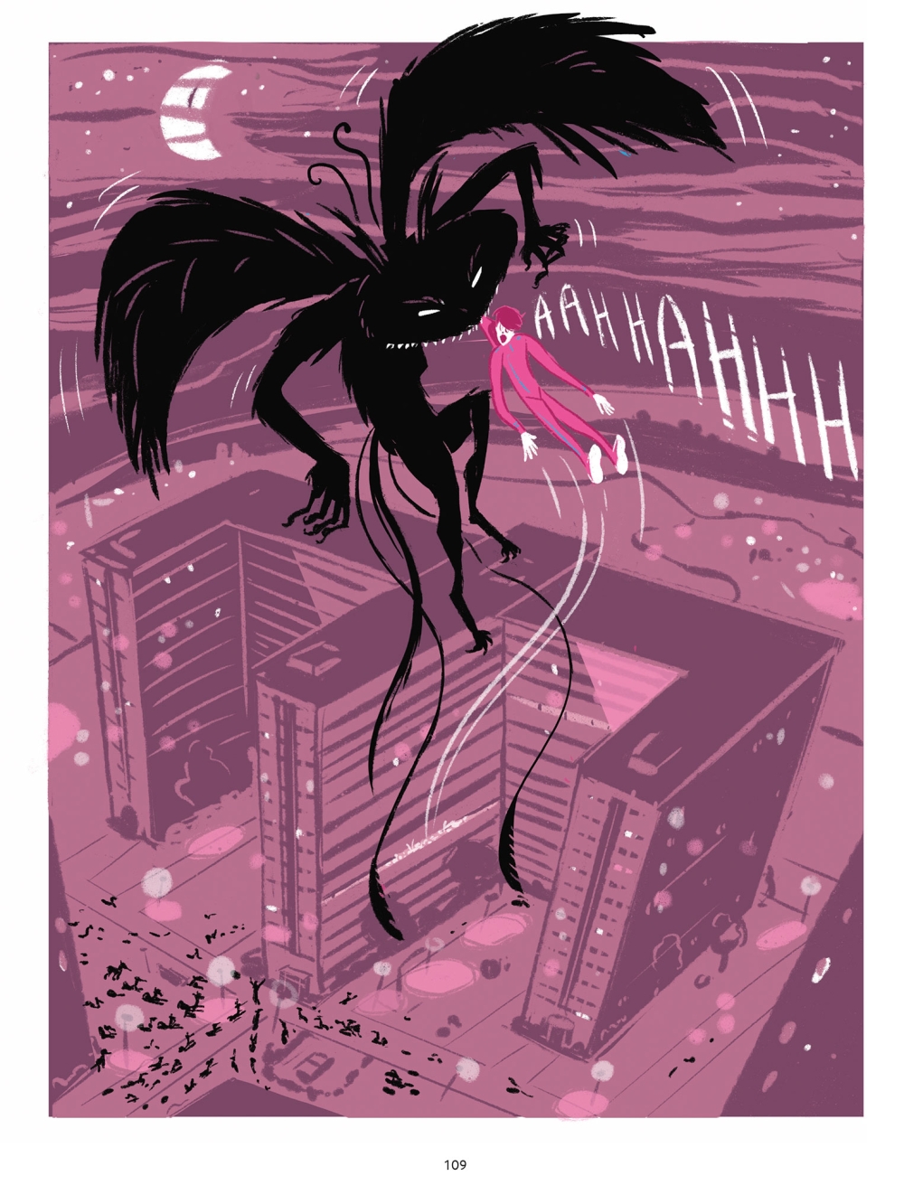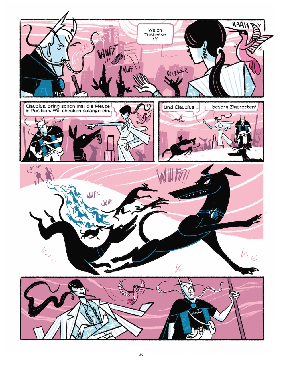 Die zeichnerische Darstellung konzentriert sich auf das Wesentliche: Legrons stilisierte Figuren und Monster handeln vor fast monochromen, reduzierten Hintergründen. Im richtigen Moment verlieren seine Bilder das Gleichgewicht und ziehen uns in einen Strudel aus expressiven schwarzen Linien und gezielter Zweifarbigkeit und bringen damit Emotionen auf den Punkt. Dann wieder bricht er aus dem Erzählfluss aus und setzt singuläre Stimmungsbilder ein – als Zwischenruf oder Schrei – und schafft so insgesamt eine dichte, eindringliche Atmosphäre durch den ganzen Band.