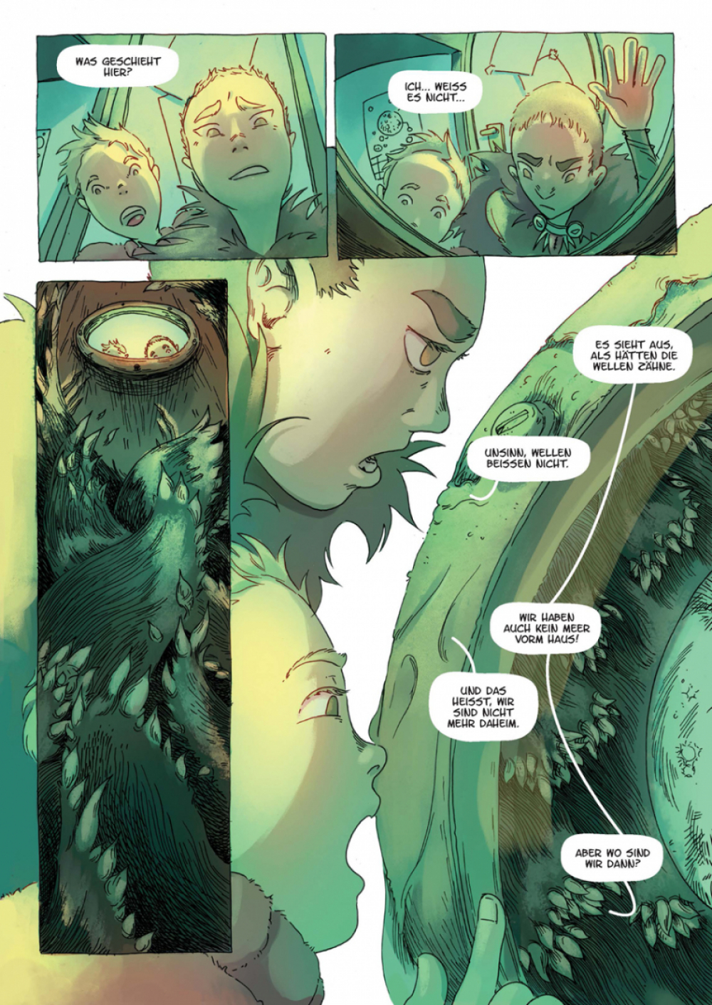 Nach einem Streit mit ihren Eltern werden die Brüder Leo und Felix auf ihr Zimmer geschickt. Die Tür schlägt zu – und plötzlich sind sie nicht mehr zu Hause: Das Fenster verwandelt sich in ein Bullauge, draußen herrscht Nacht und ein gewaltiger Vollmond hängt tief am Himmel. Ein schwarzes Meer reicht bis zum Horizont, die heranrollenden Wellen scheinen Zähne zu haben. Notdürftig mit Taschenmesser und Schleuder bewaffnet treten die Brüder vor die Tür und finden sich in einem verlassenen Gang wieder, der von zahlreichen Türen gesäumt wird. Wo sind sie hier nur gelandet? Und wie? Als sie ein unheimliches Heulen hören, fragen sie sich, wer außer ihnen noch an diesem Ort ist…