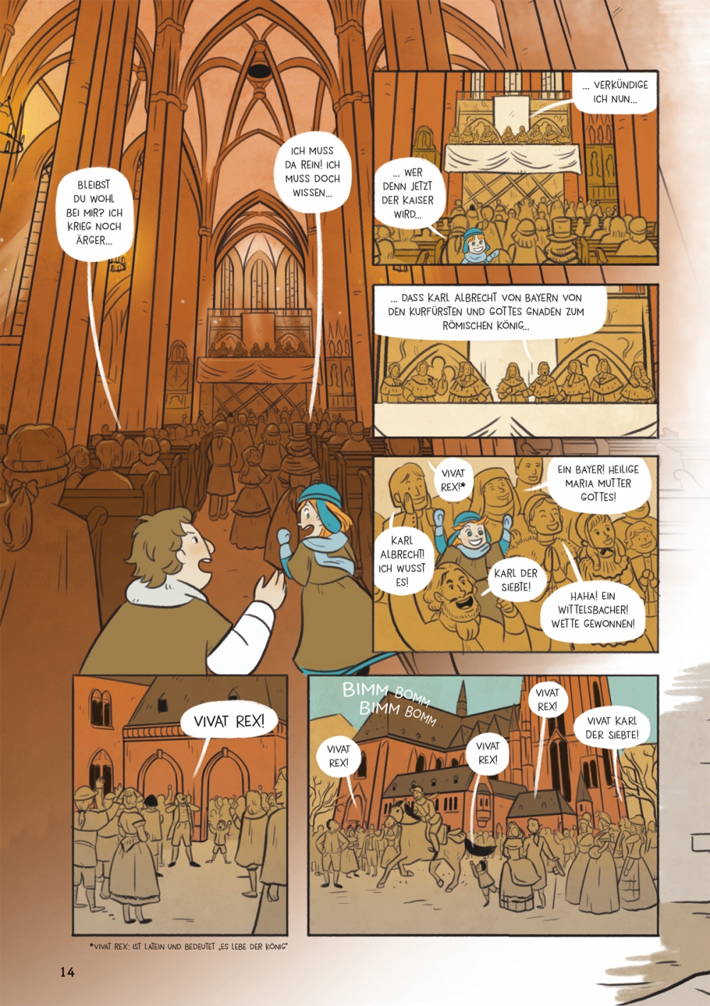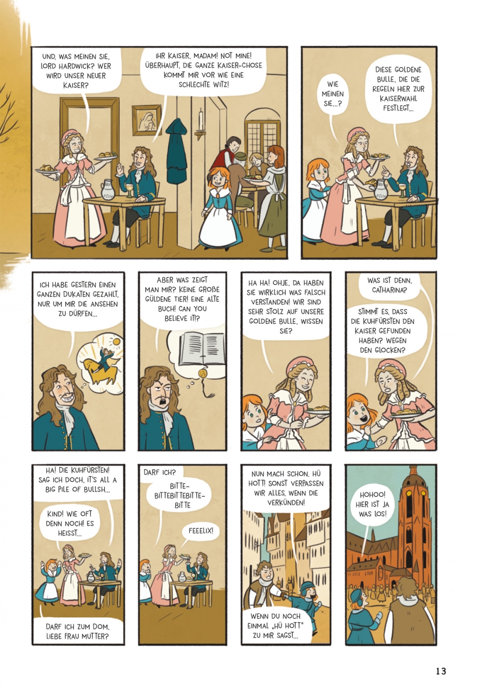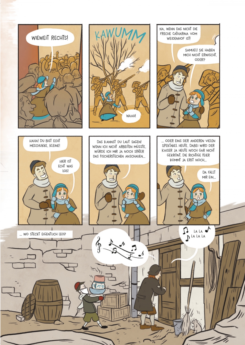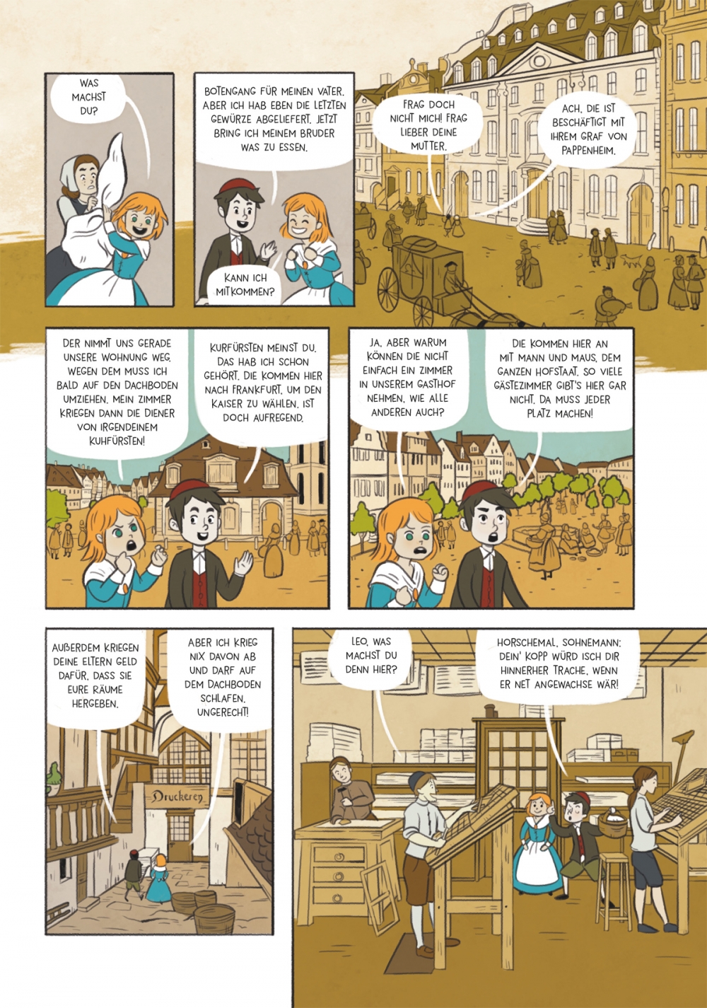 So auch für den schmächtigen Leo; er ist -um es mit heutigen Worten auszudrücken- ein regelrechter Kaiser-Fan. Der clevere und belesene Junge ist begeistert von dem bunten Treiben in seiner Stadt und wie viele andere Frankfurter auch will er nach dem Höhepunkt der Krönung ein Erinnerungsstück von der Feier mitnehmen. Das einzige Problem: Als Angehöriger des jüdischen Glaubens ist es ihm nicht gestattet, der Zeremonie beizuwohnen. Leo hadert mit diesem ungerechten Schicksal und auch das Versprechen seiner Freundin Catharina, ihm ein Andenken vom Römer zu sichern, kann ihn nicht wirklich trösten. Als Leo sich schon beinahe mit seinem Schicksal abgefunden hat, lernen er und Catharina die selbstbewusste Lucia kennen. Damit Leo doch noch in den Genuss der „Party“ wird, stürzen sie sich gemeinsam in ein Abenteuer, das aufregender zu werden verspricht, als das größte Fest der Welt selbst.