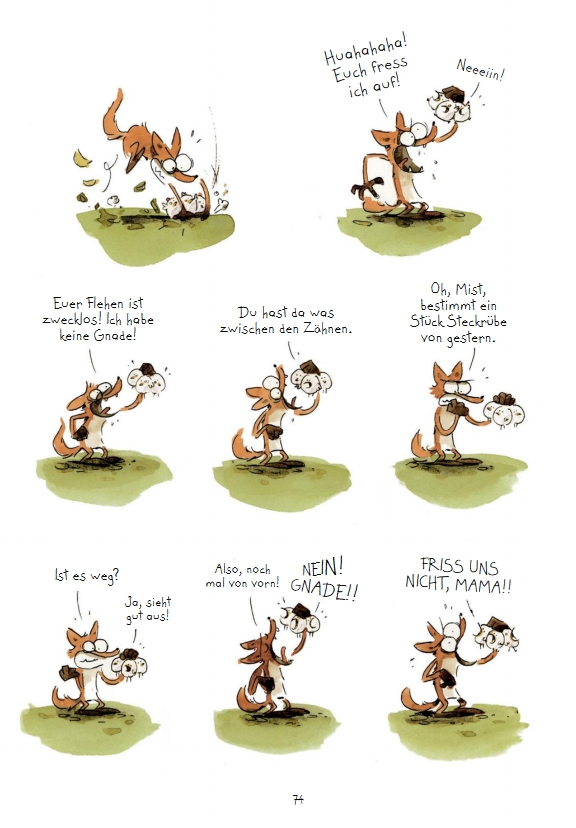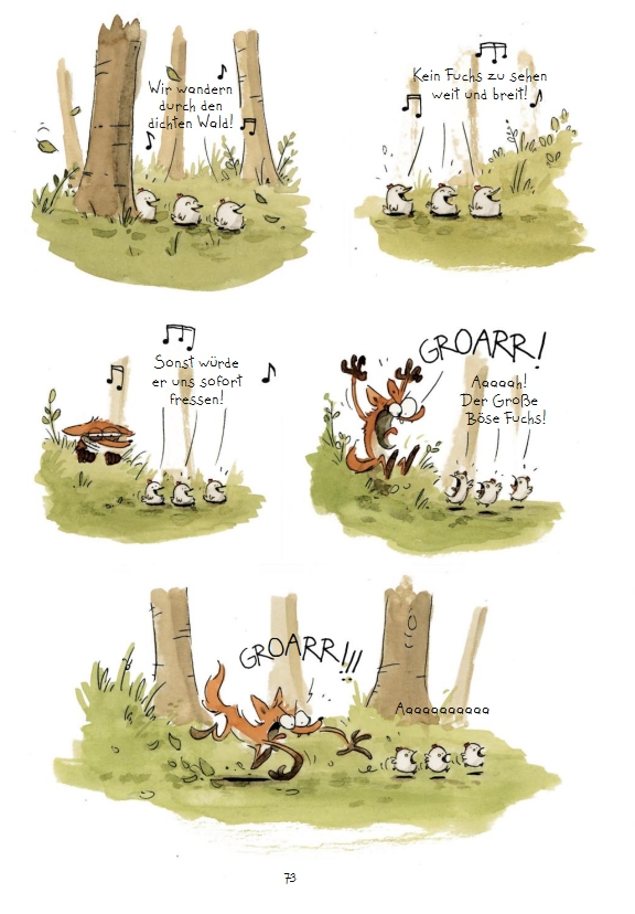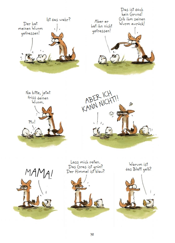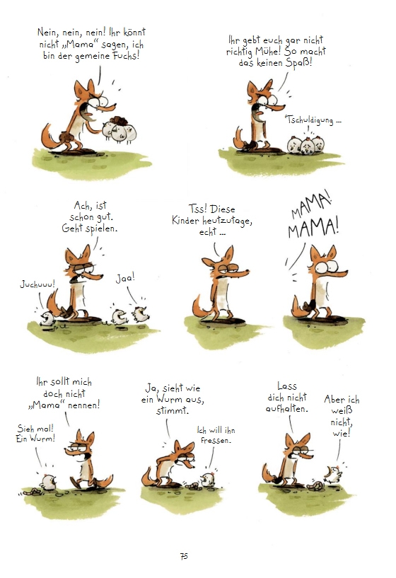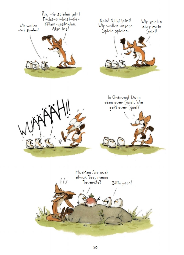 Eigentlich ist der große böse Fuchs eher ein kleiner, schwächlicher Fuchs. Die Hennen vom Bauernhof haben eher Mitleid mit ihm, als dass sie sich vor ihm fürchten; er geht ihnen meistens einfach nur auf die Nerven mit seinen ständigen Versuchen, sich ein Häppchen Huhn zu ergaunern. Doch sein finsterer Kumpel, der Wolf, hat eine Idee: Warum nicht den Hühnern die Eier klauen, warten bis die Küken schlüpfen und sich das Hühnerfleisch einfach selbst züchten? Das perfekte Verbrechen. Wenn nur die Küken nicht so wahnsinnig anhänglich wären ...