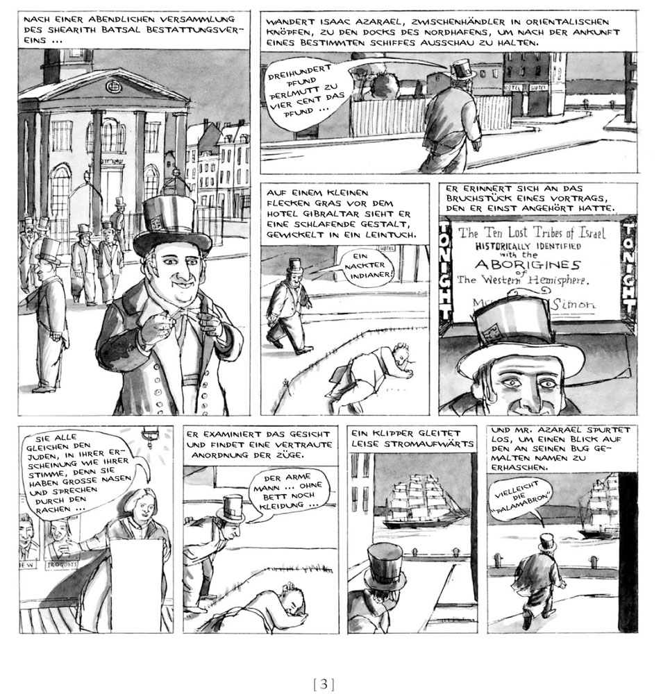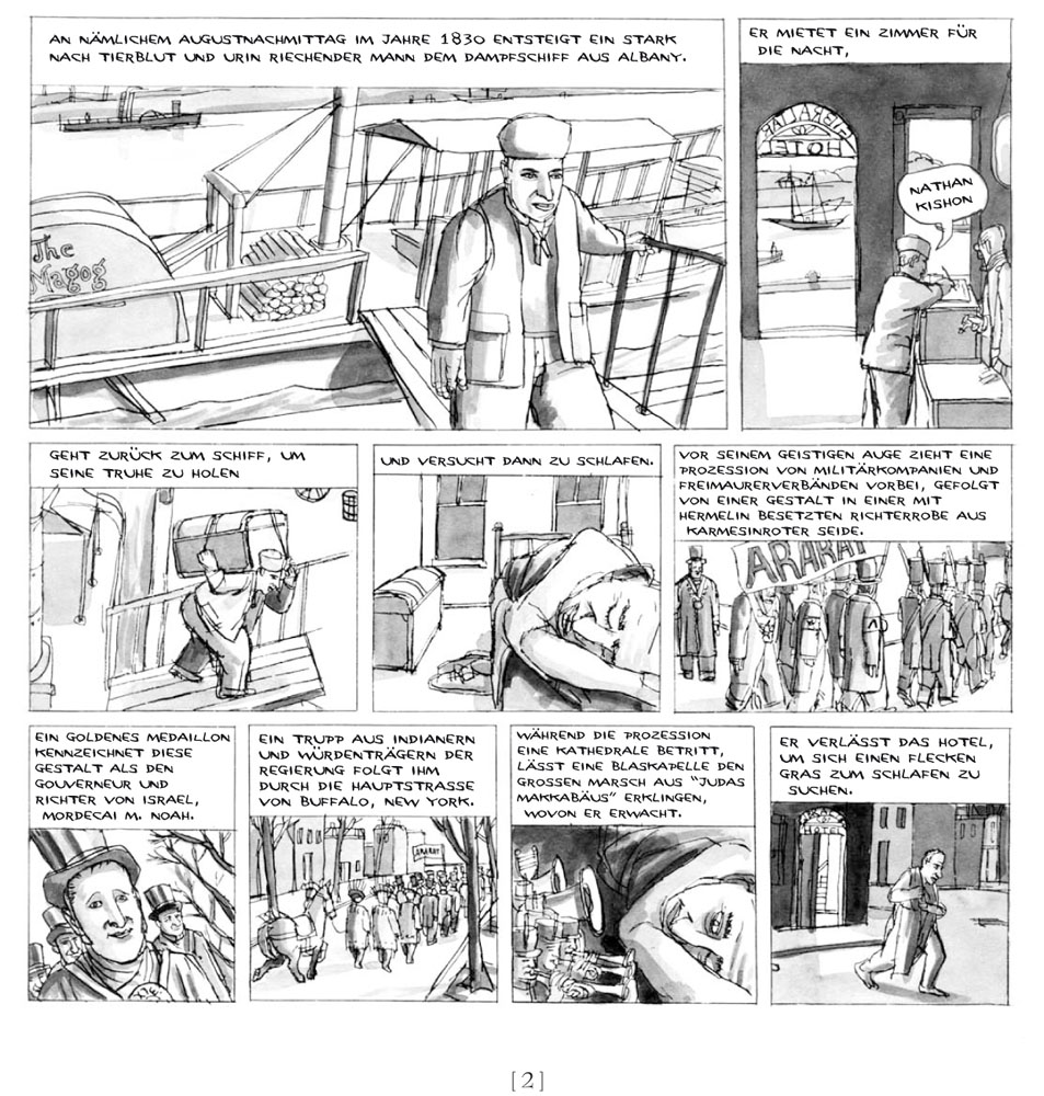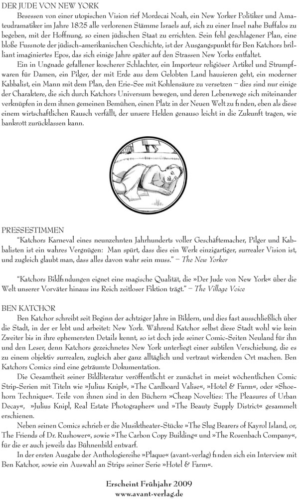Der New Yorker Politiker und Amateurdramatiker Mordecai Noahrief 1825, besessen von eine utopischen Vision alle verlorenen Stämme Israels auf, sich zu einer Insel nahe Buffalo zu begeben. Seine Hoffnung ist es dort einen jüdischen Staat zu errichten. Dieser fehlgeschlagene Plan, ist der Ausgangspunkt für Ben Katchors brillant imaginiertes Epos, dass sich einige Jahre später auf den Strassen New Yorks entfaltet.