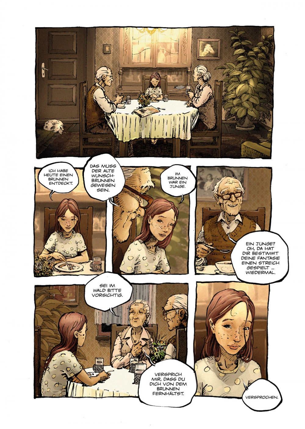 Ein Mädchen entdeckt auf einem seiner Streifzüge durch den Wald einen alten Wunschbrunnen, in dem ein Junge lebt. Ein einfühlsames Buch über Liebe und Freiheit - und darüber, dass es im Leben das Wichtigste ist, jederzeit abhauen zu können.