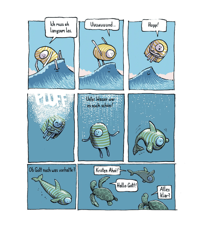 Mit »DER MENSCH UND GOTT« legt Aike Arndt den dritten Band seiner Reihe um den rundlich gezeichneten Gott vor, die mit »DIE ZEIT UND GOTT« (soeben neu aufgelegt) 2010 begann und in »DAS NICHTS UND GOTT« 2015 ihre Fortsetzung fand. In diesem Band trifft Gott Adam und Eva, kitzelt Krebse, fährt mit seinen Rollerblades über‘s Meer, erschafft einen Golem, damit seine WG (die er mit Luzifer bewohnt) endlich mal ordentlich aufgeräumt ist, und zeigt uns sein Innenleben. Dieses Mal komplett in Farbe!