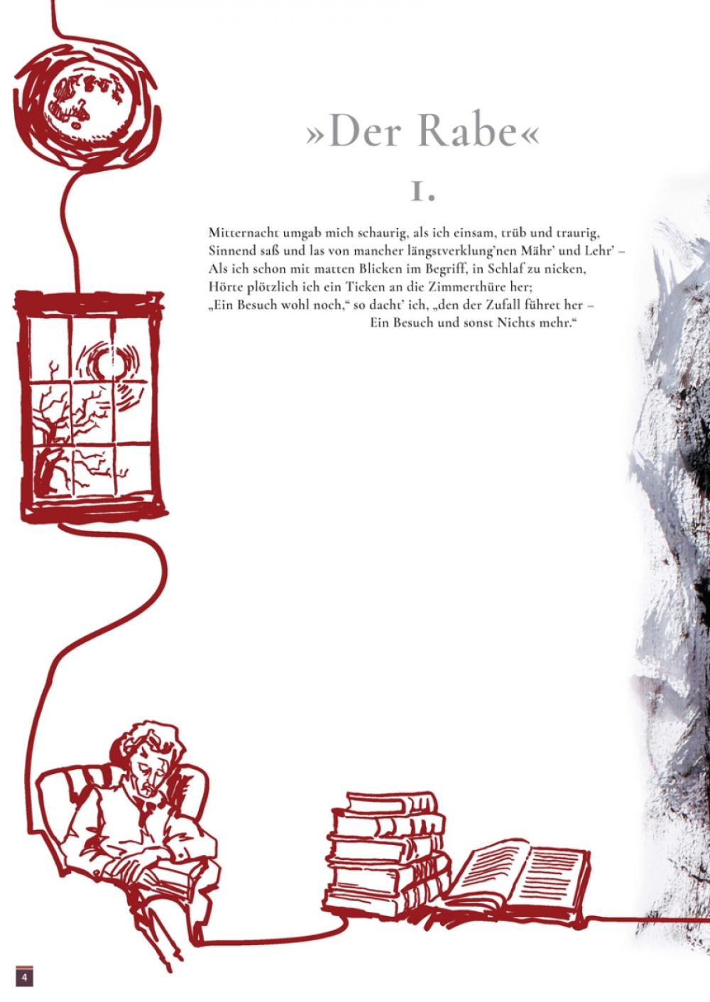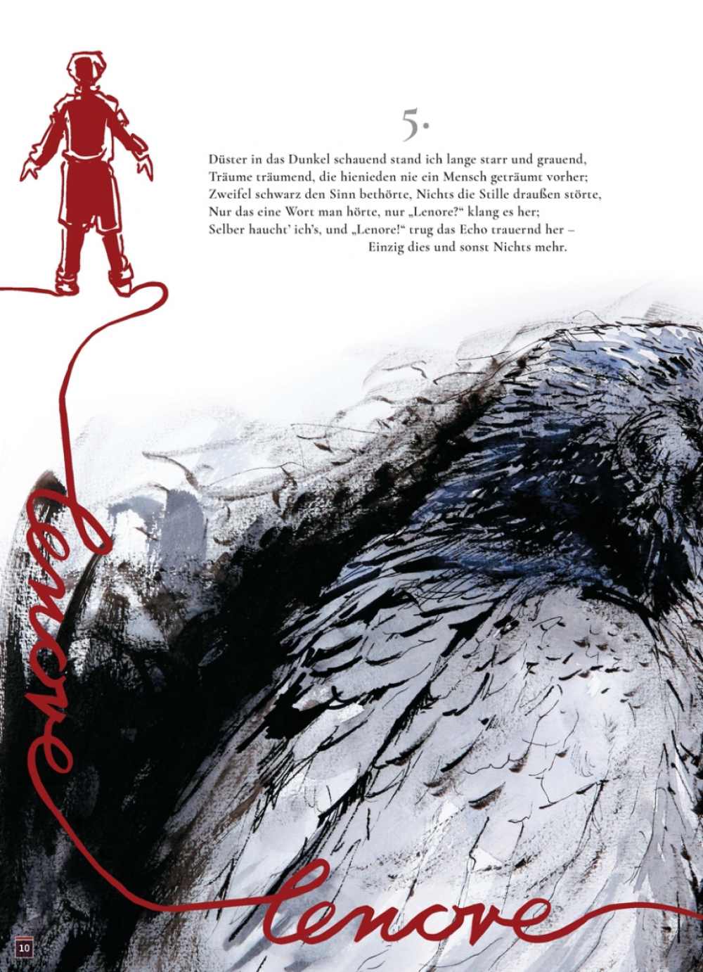 Heute gehört Poes Werk zur Weltliteratur. Nach dem Buch »Heinrich Heine – eine Lebensfahrt« widmen sich Gaby von Borstel und Peter Eickmeyer mit ihrer illustrierten Ausgabe dieses schauerlichen Klassikers einem weiteren Schwergewicht der Lyrik. Die Strophen werden auf Doppelseiten in großformatigen Bildern opulent in Szene gesetzt und die Geschichte wird entlang eines roten Fadens visuell begleitet. Der Gedichttext liegt dabei sowohl in deutscher Übersetzung als auch in der englischen Originalfassung vor. Edgar Allen Poes unerreichte Meisterschaft in Klang und Rhythmus kann so in ihrer ursprünglichen Form wirken, ohne dass ihr inhaltliches Verständnis eingeschränkt wird.