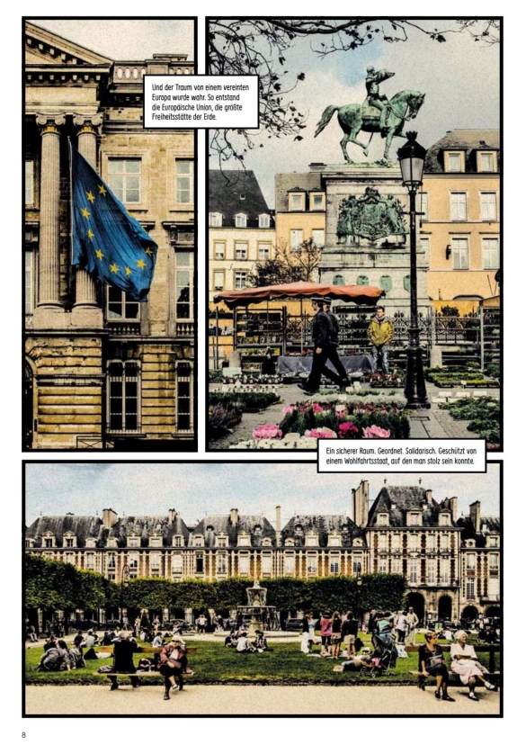 Für das spanische Magazin El País Semanal machen sich der Fotograf Carlos Spottorno und der Journalist Guillermo Abril auf den Weg an die Außengrenzen der EU: Von Melilla, der spanischen Enklave in Marokko, schwer bewacht und durch einen schier unüberwindbaren Zaun geschützt bis in den Norden Finnlands und die Wälder Weißrusslands, wo NATO-Truppen für einen Grenzkonflikt mit Russland trainieren. Die Autoren merken schnell, dass die europäische Grenze sehr viel komplexer ist, als dass man sie an einem einzigen Ort vollständig begreifen könnte. Sie treffen Flüchtende, Grenzsoldaten und Kommunalpolitiker, und halten ihre Erlebnisse in Wort und Bild fest. Ein einmaliges Dokument der Herausforderungen, welche tagtäglich an den Grenzen der EU auftreten.