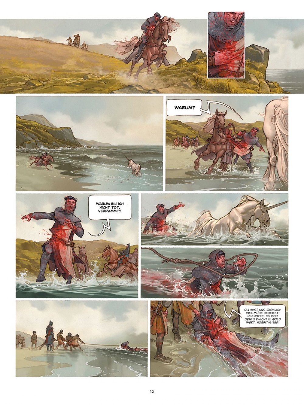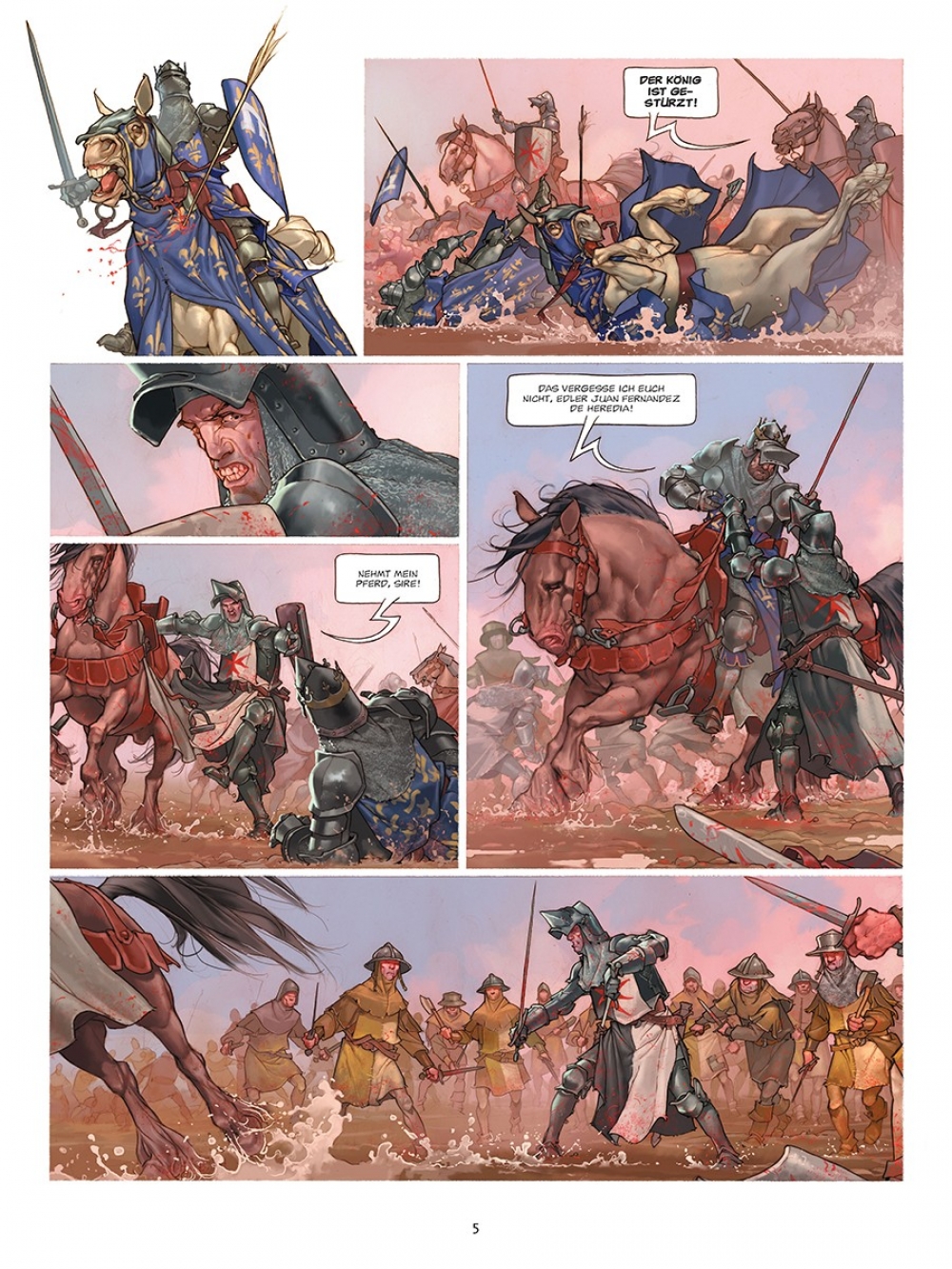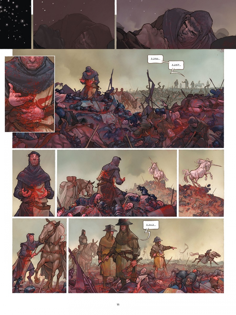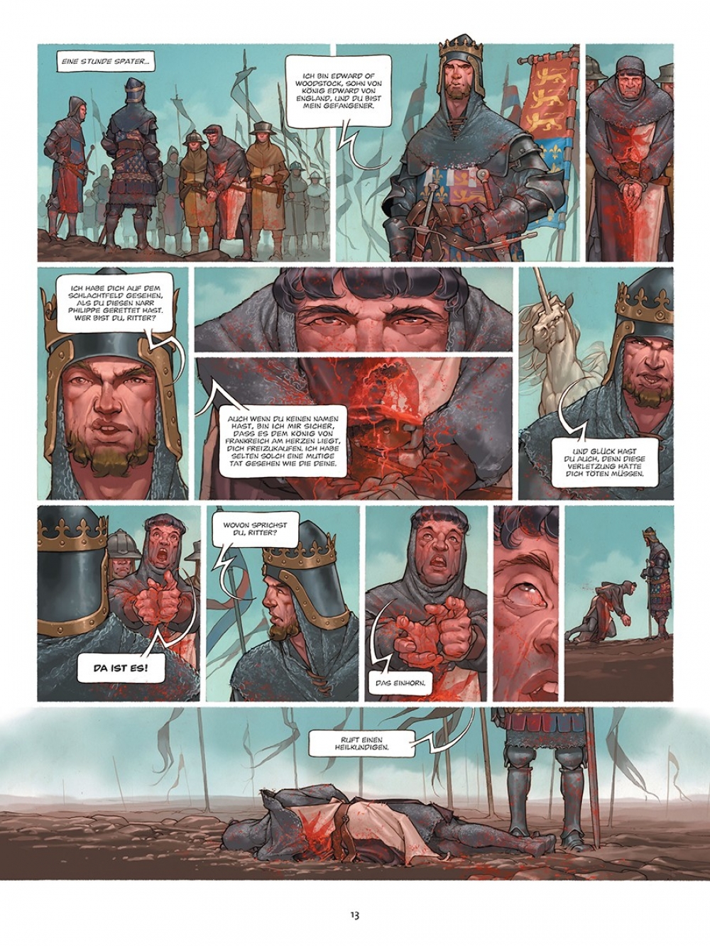 Im August 1346 erleiden die Franzosen und ihre Verbündeten bei dem Örtchen Crécy eine verheerende Niederlage. Selbst König Philipp VI. gerät im Schlachtengetümmel in Bedrängnis, und als sein Pferd unter ihm zusammenbricht, überlässt ihm der Ordensritter Juan Fernandez de Heredia sein eigenes Reittier. Nur steht er jetzt allein auf dem Schlachtfeld, umzingelt von Feinden, und trotz berserkerhafter Gegenwehr bricht er schließlich unter den Hieben seiner zahllosen Angreifer zusammen. Kurz bevor er das Bewusstsein verliert, hat er jedoch eine Vision: Er wähnt sich von einem Einhorn durchbohrt! Eine Schlacht mit weitreichenden Folgen. Zum einen ist sie der Auftakt eines Konflikts, der sich noch über hundert Jahre hinziehen wird. Zum anderen wirft sie Heredia völlig aus der Bahn. Besessen von seiner verstörenden Erscheinung, macht er sich auf die Suche nach dem Einhorn. Oder vielmehr nach einer Erklärung, warum er noch lebt.