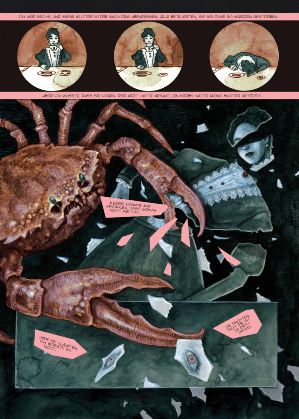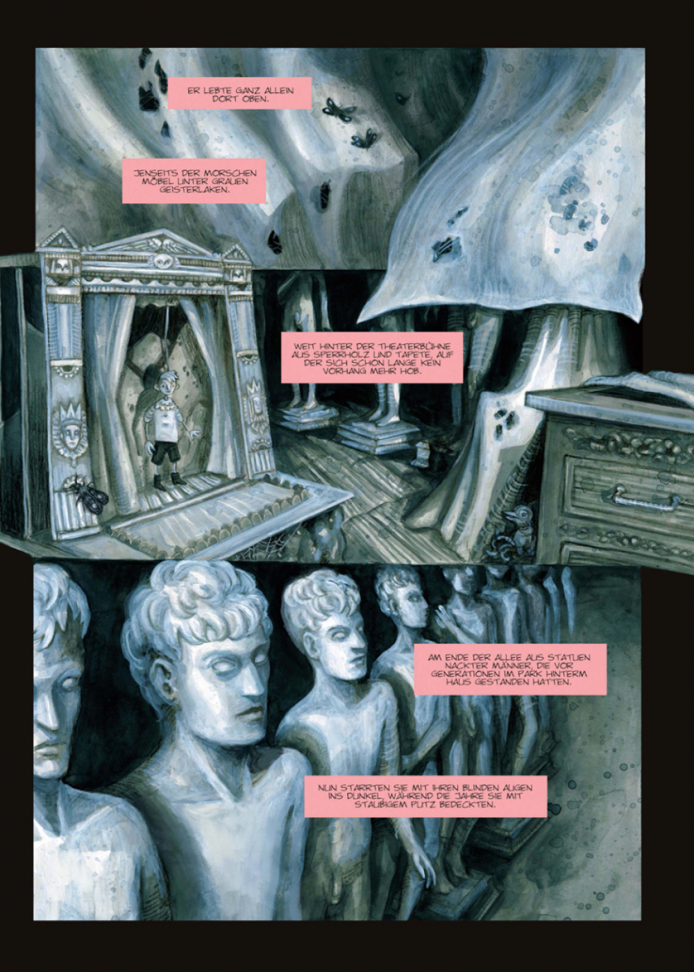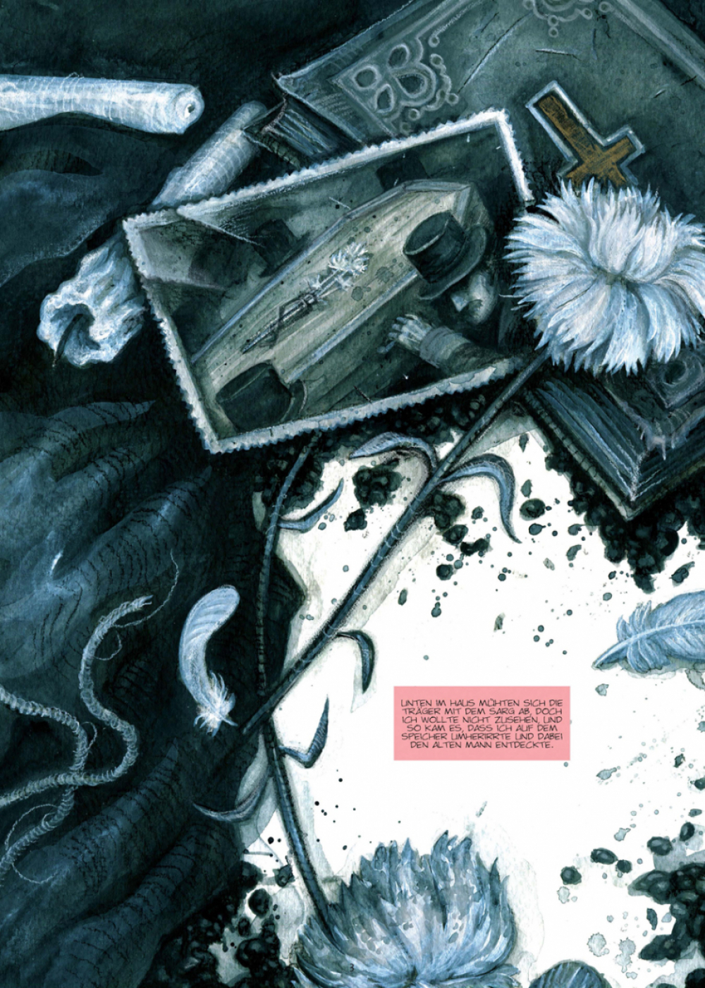 „Unten im Haus mühten sich die Träger mit dem Sarg ab, doch ich wollte nicht zusehen, und so kam es, dass ich auf dem Speicher umherirrte und dabei den alten Mann entdeckte. Er lebte ganz allein dort oben.“