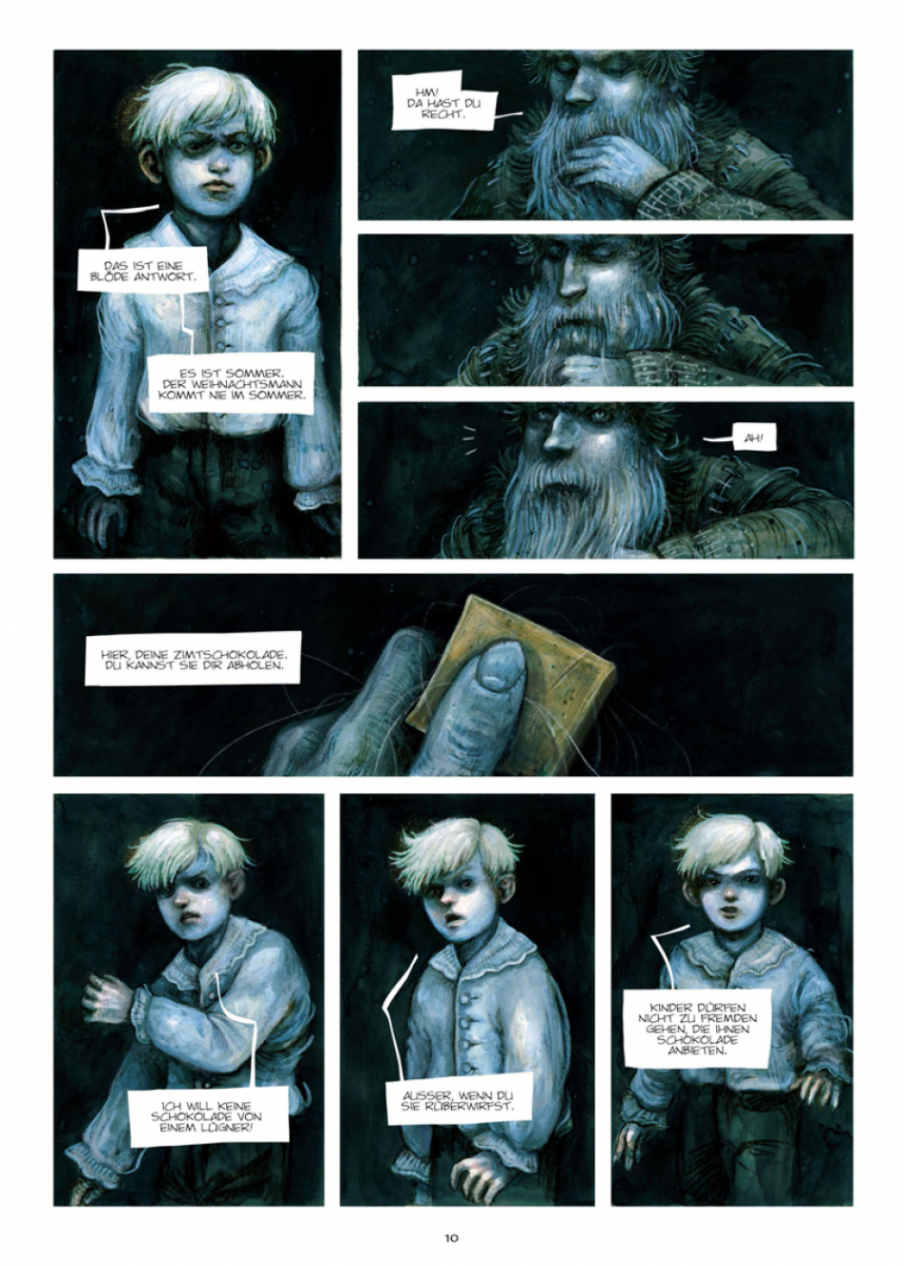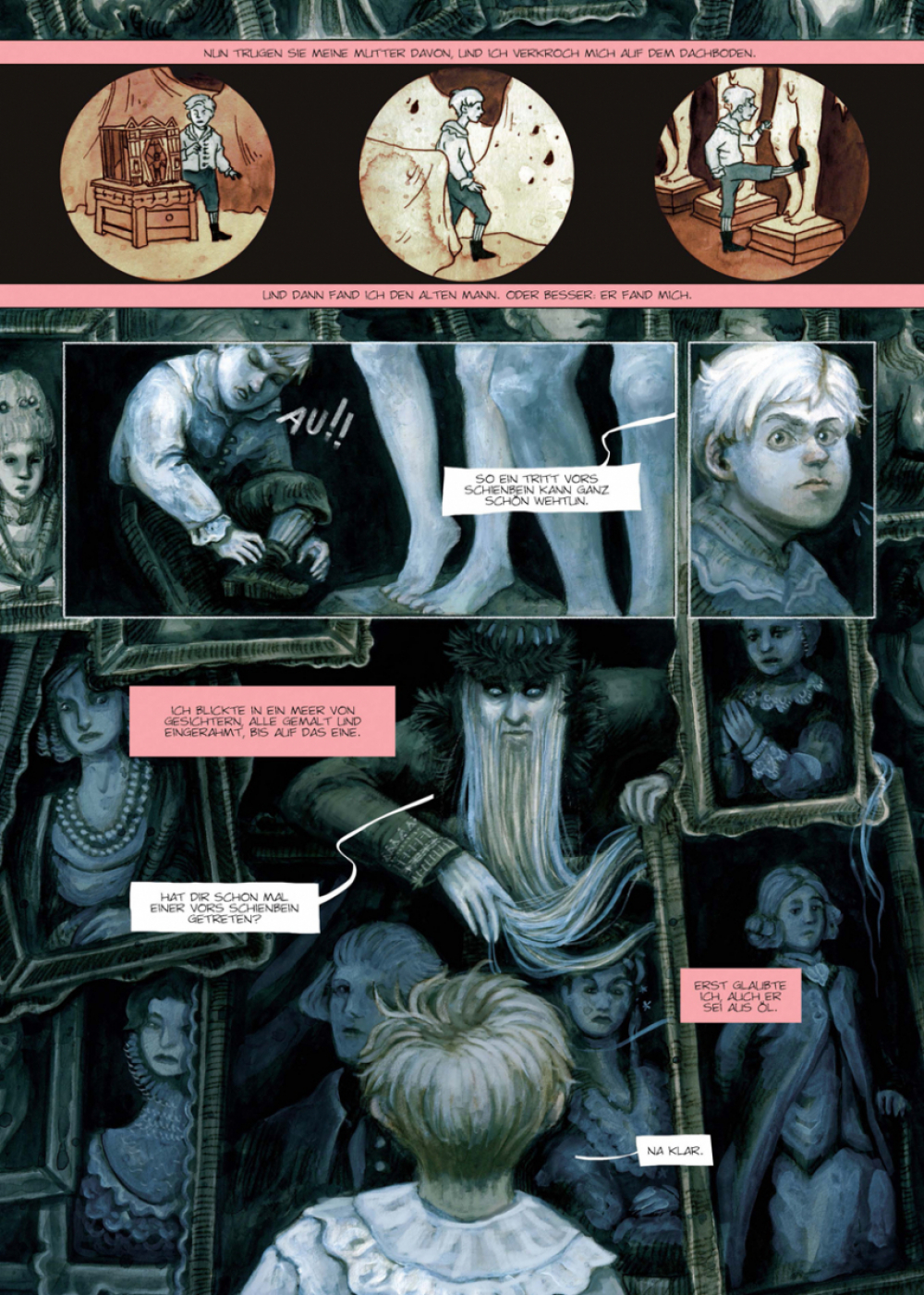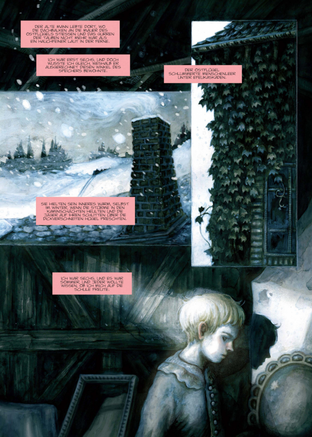 Ein uralter Landsitz hinter schneebedeckten Hügeln. Ein verwunschener Dachboden voller Wunder und Schrecken. Und ein kleiner Junge, der bei seinen Expeditionen in die verwinkelte Speicherlandschaft eine unheimliche Entdeckung macht: Die Familie war nie allein im Haus. Ein rätselhafter Mann haust seit Generationen hinter einer Wand aus Ölgemälden, und er lockt mit Schokolade …