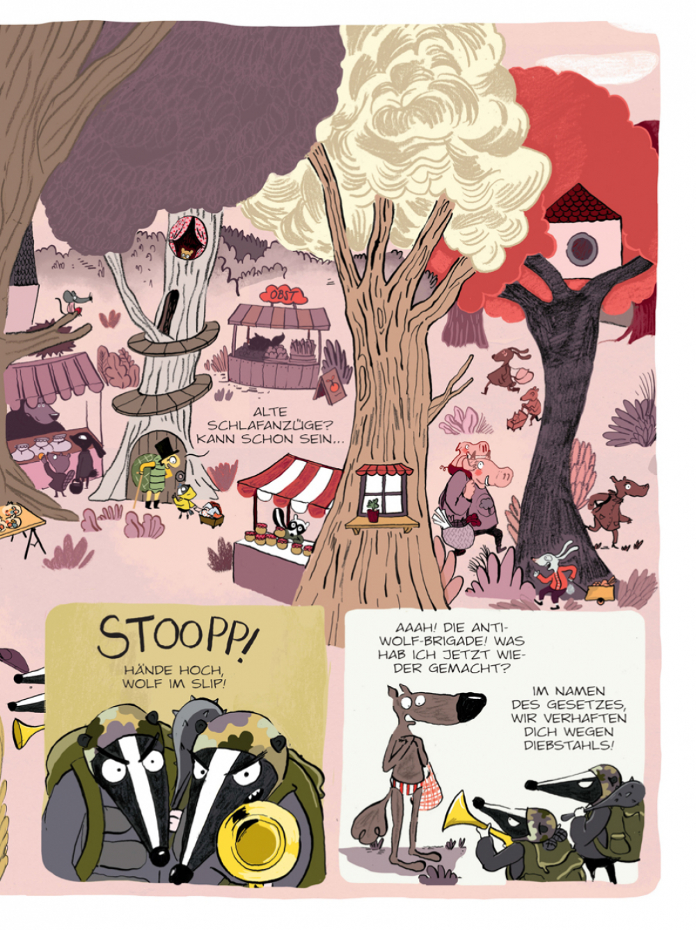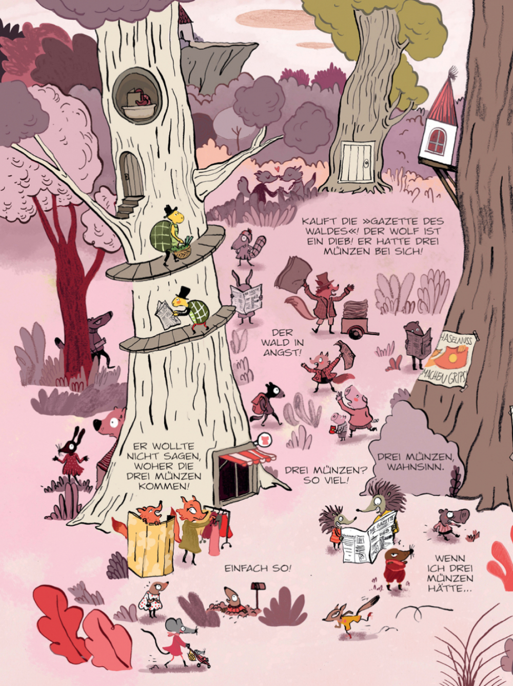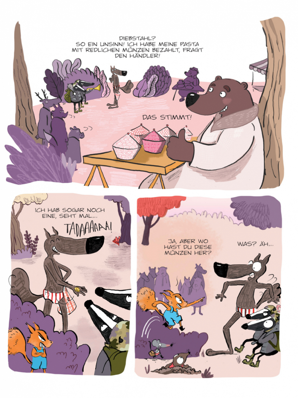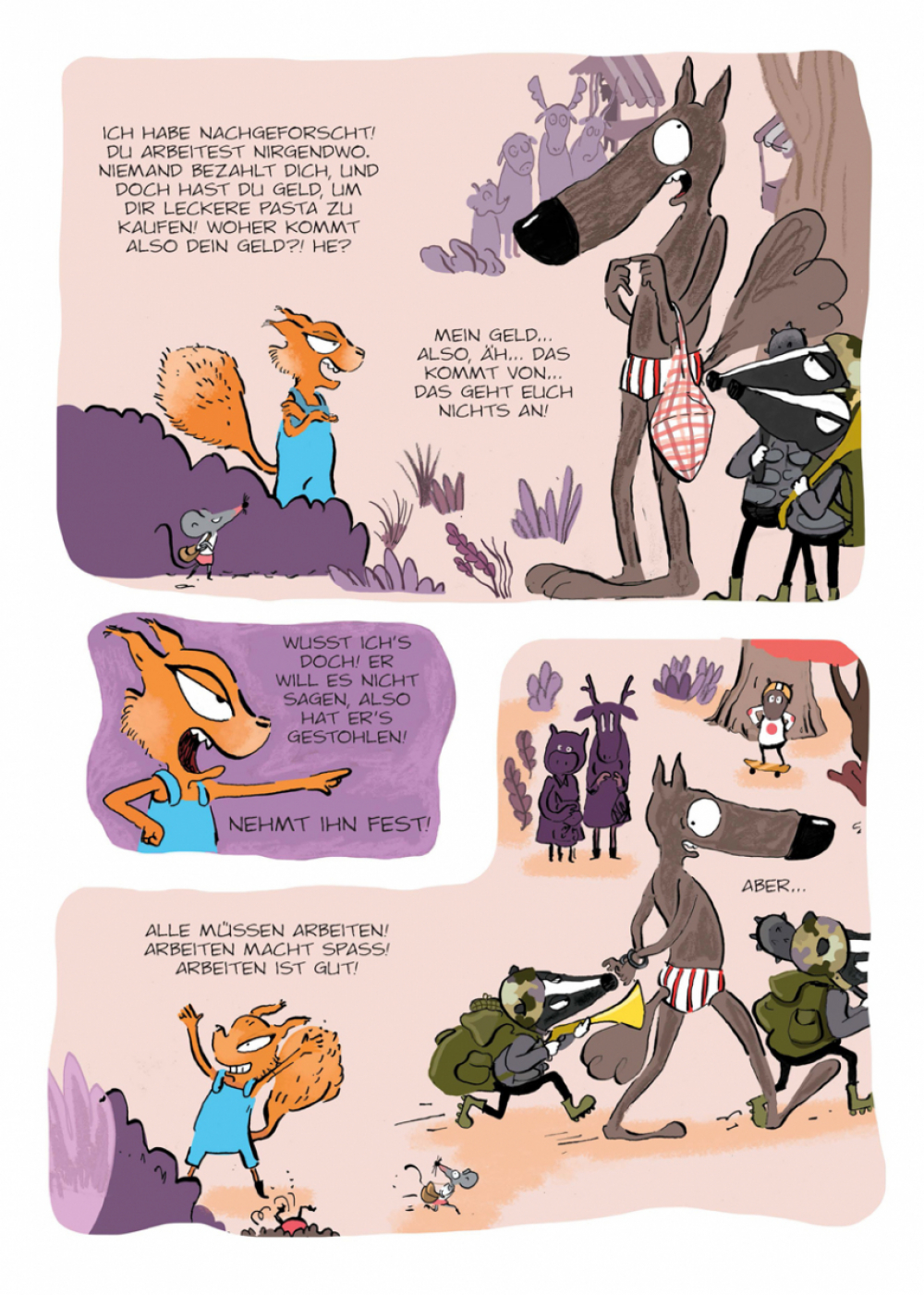 Auch im Wald gibt es Regeln: Um zu kaufen, braucht man Geld, und um Geld zu haben, muss man arbeiten. Aber wenn das so ist, woher hat dann der Wolf das Geld zum Einkaufen? Er hat immerhin drei Münzen, dabei tut tut er ja gar nix... Er muss ein Dieb und Faulenzer sein! Ab ins Gefängnis mit ihm! Jetzt muss die Anti-Wolf-Brigade nur noch herausfinden, woher das Geld stammt – denn im Gegensatz zum Wolf sind sie schließlich fleißig!