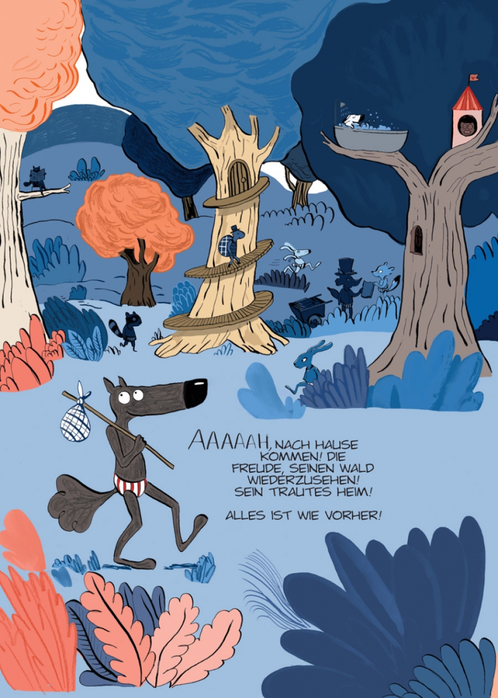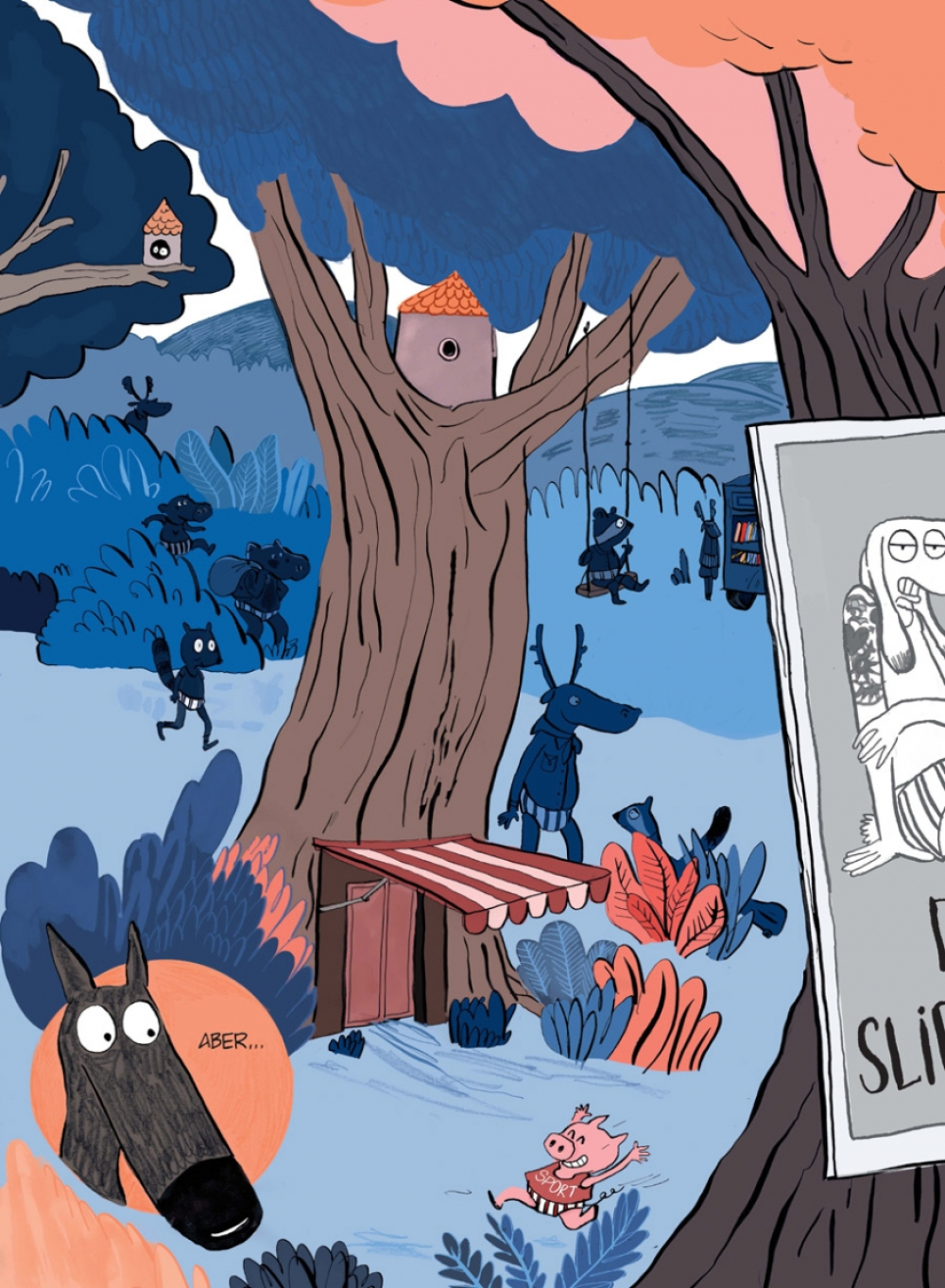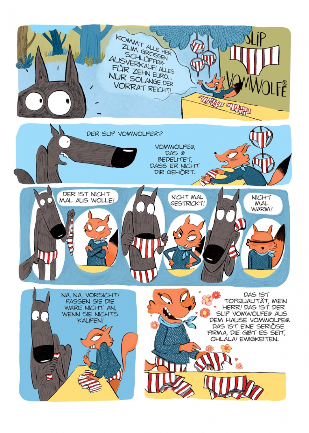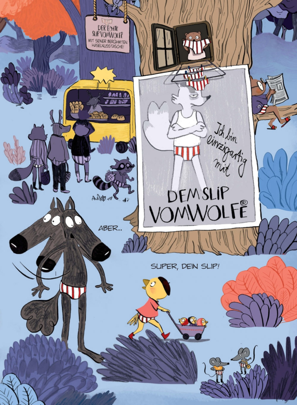 Der Wolf im Slip kommt aus dem Urlaub zurück und stellt fest, dass – oh Schreck – seine Unterhose im Wald schwer in Mode ist! Alle Tiere tragen den gleichen Slip wie er! Wie ungerecht, denn normalerweise ist er der einzige Slipträger im Wald. Aber jetzt, wo die Unterhosen wie Pilze aus dem Boden schießen, ist er dann überhaupt noch der Wolf im Slip? Er fühlt sich seiner Identität beraubt und trifft eine Entscheidung: lieber frieren als diese gestreifte Unterhose tragen! Aber was wird aus dem Wolf ohne Slip, und was wird aus dem Slip ohne Wolf?