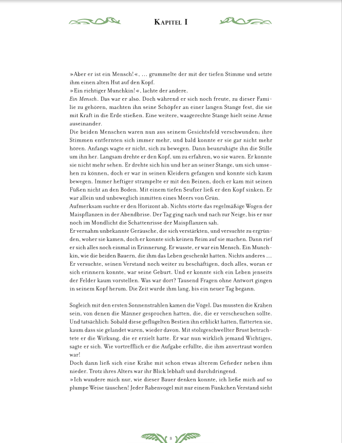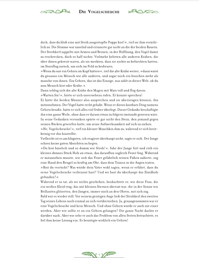 Sébastien Perez hat die berühmte Geschichte in einem leichten und poetischen Stil neu gefasst; er erzählt sie aus der Perspektive der Vogelscheuche, die sich fälschlich für dumm hält. Denn sie beschützt nicht nur Dorothy, sondern hält auch die Gruppe um Dorothy, deren Hund Toto, den Blechmann und den Löwen zusammen und findet in gefährlichen Situationen stets eine Lösung. Und trotzdem ist es ausgerechnet die kluge Vogelscheuche, die von dem Zauberer mit Verstand ausgestattet werden möchte, so wie der beherzte Blechmann mit einem Herzen und der tapfere Löwe mit Mut …