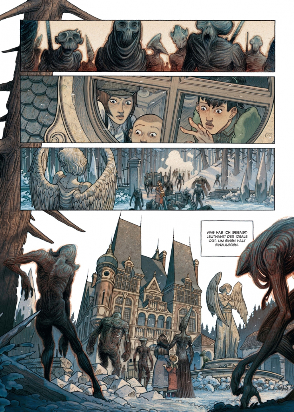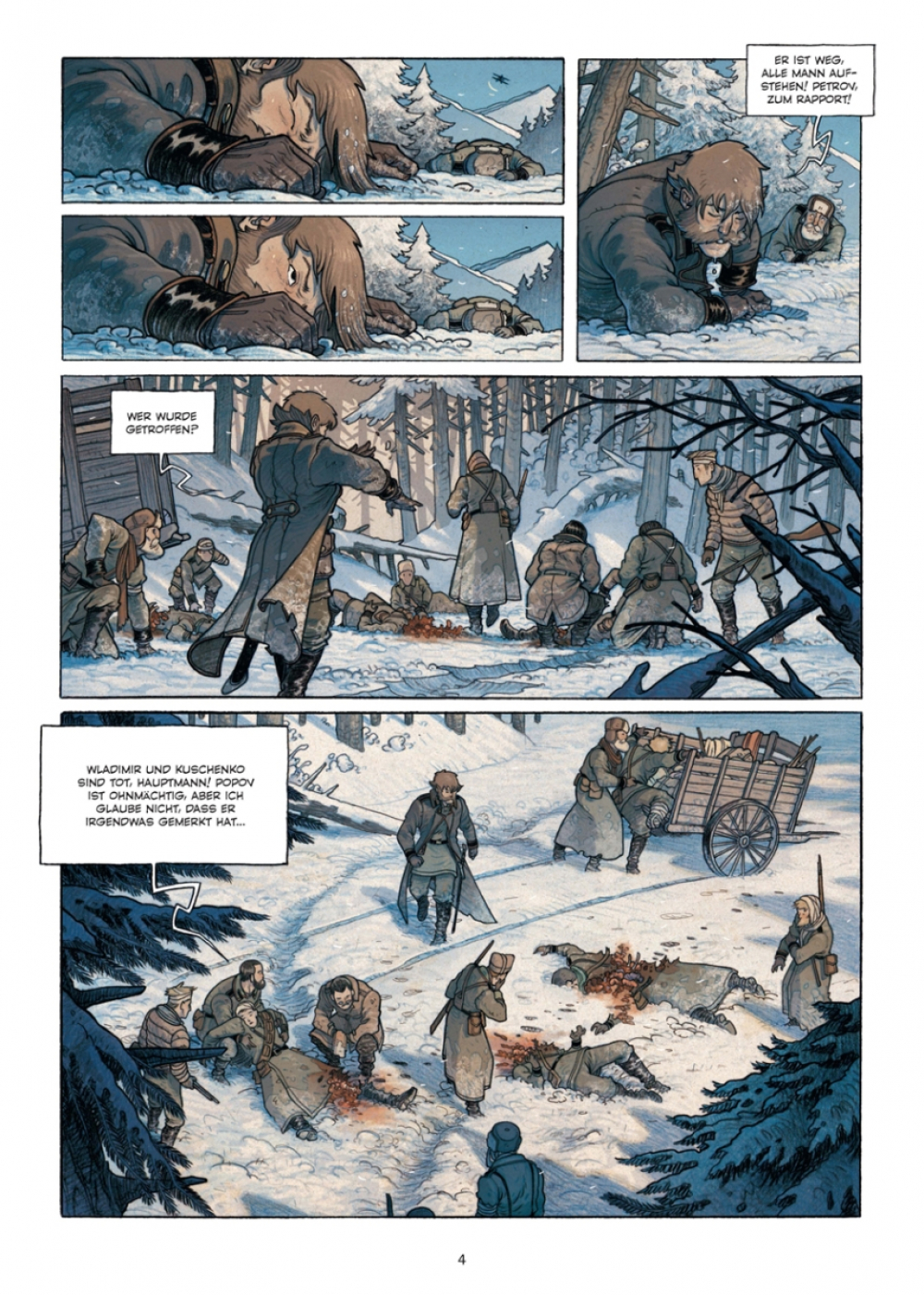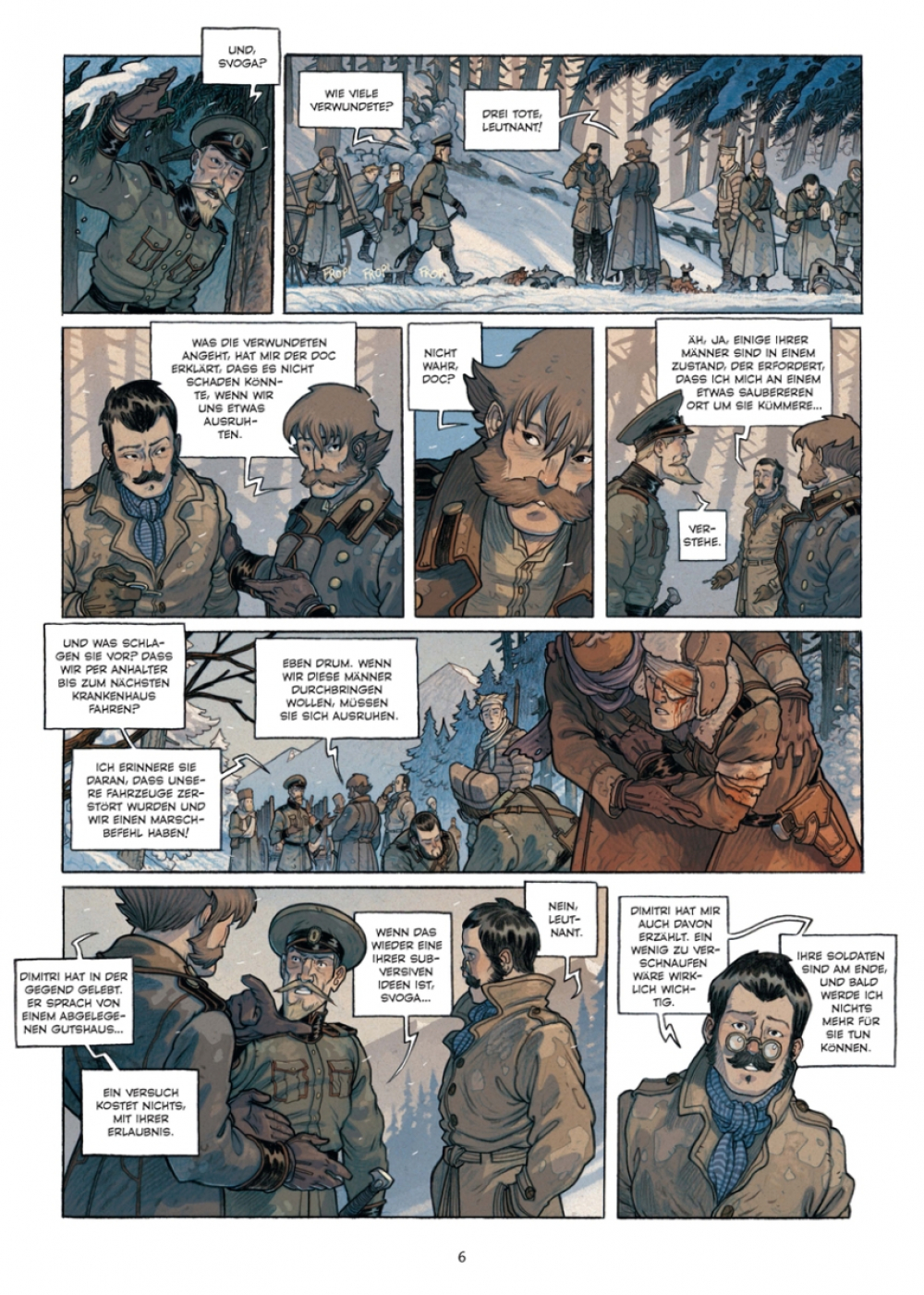 Mit letzter Kraft schleppt sich eine zusammengewürfelte Gruppe russischer Soldaten und Zivilisten durch den Schnee, egal wohin, bloß weg von der Front des Ersten Weltkriegs. Um die Moral zu heben und die Verwundeten versorgen zu können, machen sie Rast bei einem entlegenen Gutshof. Die Baronin empfängt sie mit offenen Armen, verbirgt jedoch zugleich ein Geheimnis: sie beherbergt eine Gruppe Kinder, die sie vor den Verwüstungen des Krieges schützen will. Schnell freunden sich die Töchter des Truppenarztes mit ihnen an, und für einen Moment können sie den Krieg vergessen. Doch schon bald werden die Soldaten unruhig, denn eine grausige Kreatur taucht in ihrer Mitte auf…