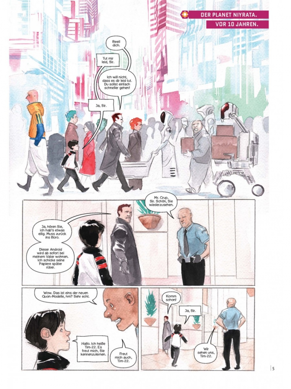 Als Jeff Lemire (»Sweet Tooth«) sich daran machte, sein neues Science Fiction Epos »Descender« zu entwerfen, nahm er an, dass die Story um den einsamen, von allen Kopfgeldjägern der Galaxie verfolgten Roboterjungen TIM-21 ihn in die entferntesten Winkel des Weltalls führen würde. Stattdessen landete er in Hollywood. Denn kaum hatten er und Zeichner Dustin Nguyen ihr Projekt im letzten Sommer erstmals öffentlich in groben Zügen umrissen, gaben sich die Filmstudios bei ihnen die Klinke in die Hand.