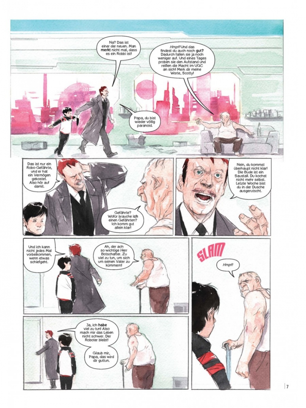 Eine Verfilmung von Sony Pictures ist bereits in Planung. Eine bewegende Geschichte über die emotionale Zweischneidigkeit künstlicher Intelligenz, von Dustin Nguyen in atmosphärisch dichte Aquarelle umgesetzt, deren Einflüsse von Miyazaki und Otomo bis Stanley Kubrick (»2001«) reichen. Und schon jetzt einer der SF-Comics des Jahres! Der kleine Roboter TIM-21 und seine mechanischen Gefährten kämpfen ums Überleben – in einem Universum, in dem alle Roboter verboten sind und von Kopfgeldjägern verfolgt werden! Eines Tages erscheinen sie wie aus dem Nichts über den neun wichtigsten Planeten des Vereinten Galaktischen Rats und beginnen ihr Werk der Zerstörung. Die Harvester – gigantische Roboter – legen Welten in Schutt und Asche, und dann verschwinden sie so plötzlich, wie sie gekommen sind.