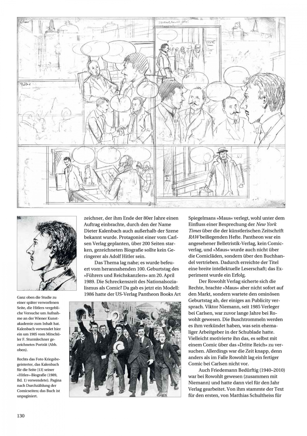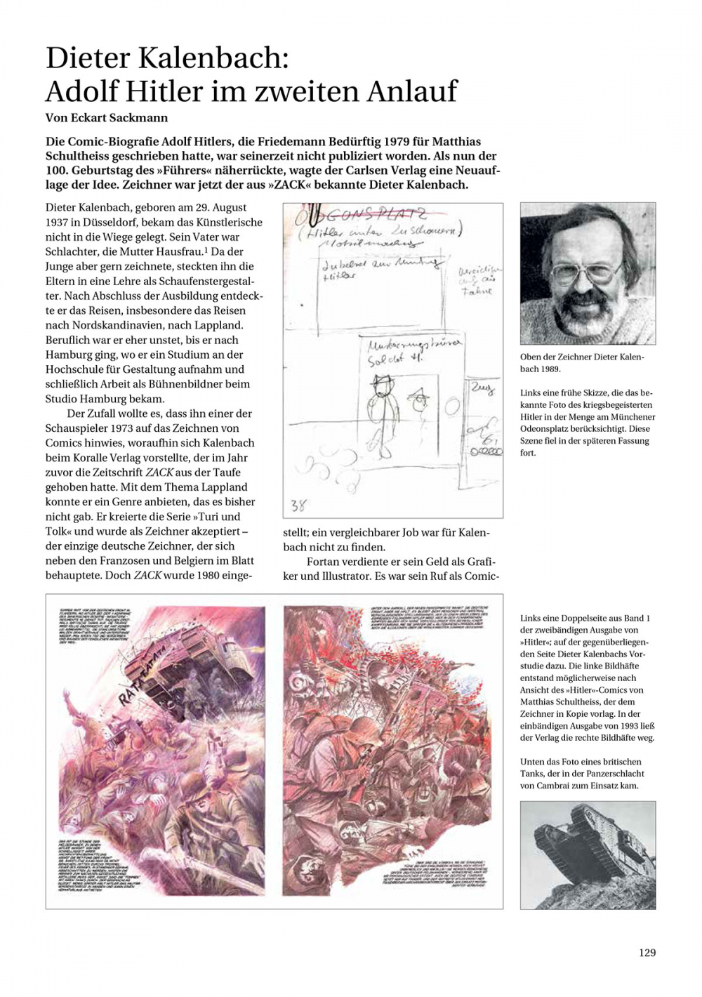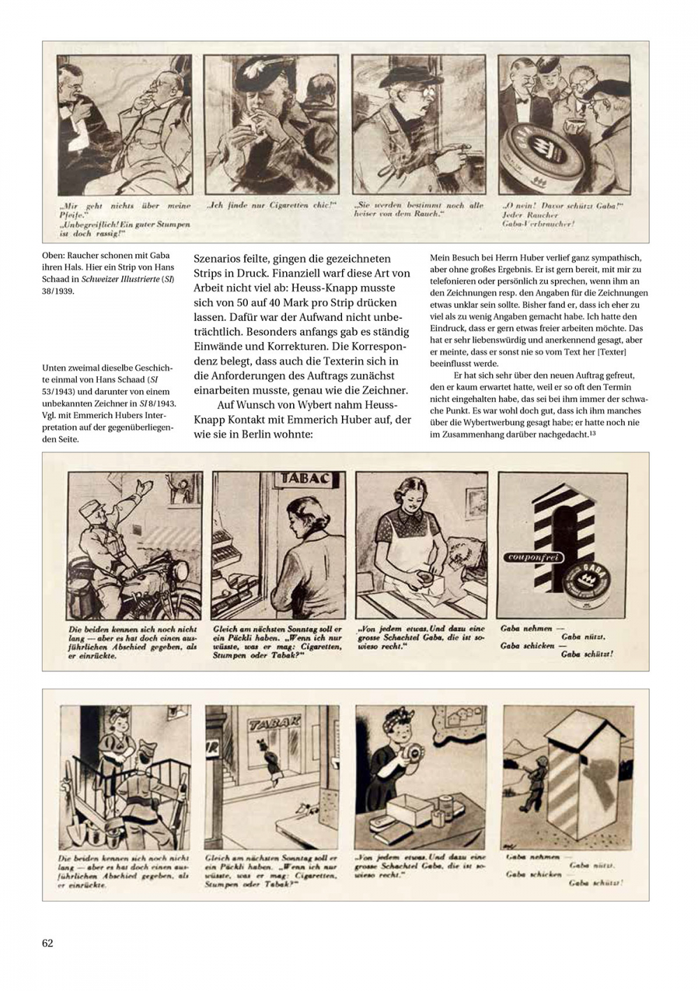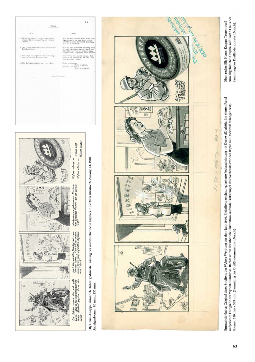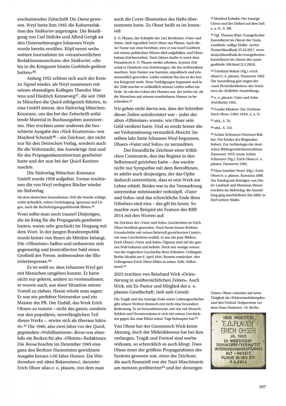 Hervorzuheben ist insbesondere der Artikel über die Wybert-Werbung von Elly-Heuss-Knapp (in Deutschland gezeichnet von Emmerich Huber), die mit zehn Millionen Abdrucken pro Strip vielleicht der auflagenstärkste deutsche Comic war und noch dazu auch international vermarktet wurde. Des weiteren eine detaillierte Aufarbeitung des Lebens von Erich Ohser, die diesen Zeichner in ein neues Licht rückt: »Vater und Sohn« war nicht als Kindercomic geplant und war auch nicht Ohsers Hauptwerk. Das war vielmehr die Nazi-Propaganda, durch die Ohser zu einem der meistgeachteten – und meistverdienenden – Zeichner seiner Zeit wurde. Ohser war ein Täter und nicht das unschuldige Opfer der Nazis, als der er von denen hingestellt wurde, die nach dem Krieg mit »Vater und Sohn« Kasse machen wollten.