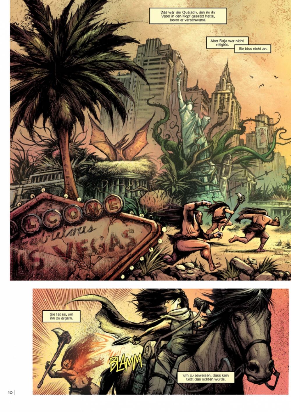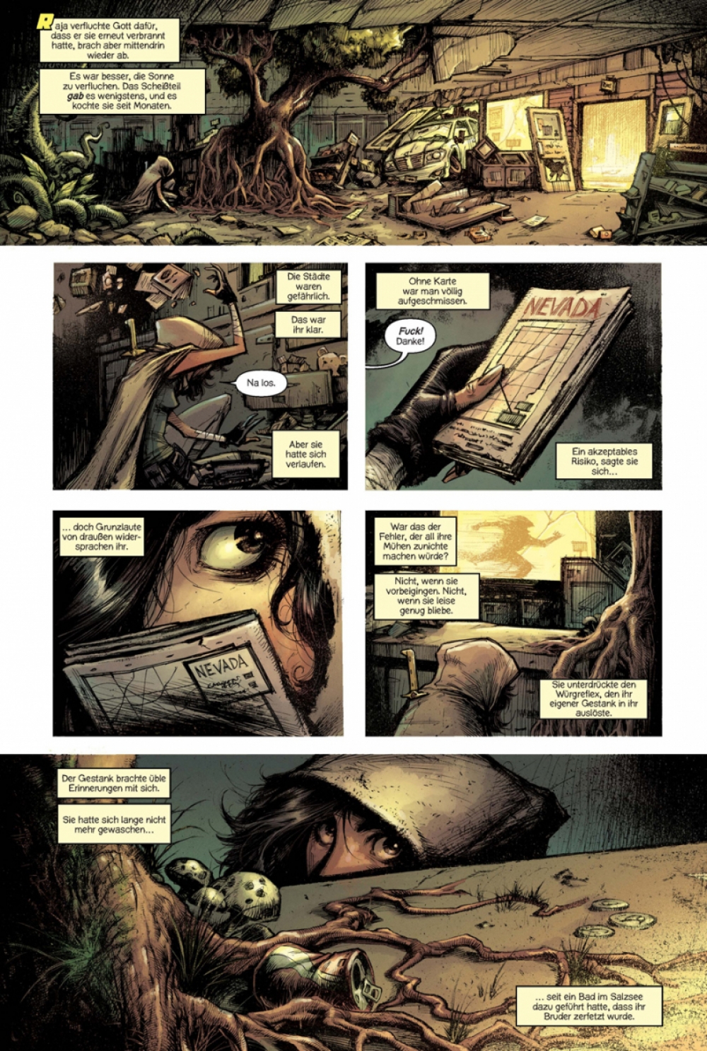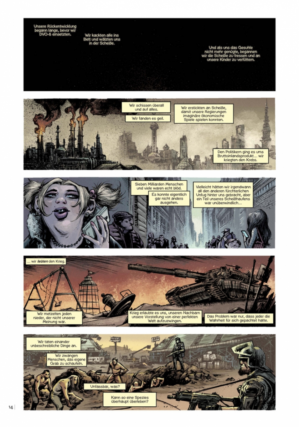 Das konnte nur schiefgehen. Dabei liegen die Probleme der Menschheit auf der Hand: Ressourcenvergeudung, Umweltzerstörung, Genpfuscherei. Und immer wieder Krieg, Terror, Mord und Totschlag. So kamen einige Oberschlaue mit unterentwickeltem Verantwortungsgefühl zu dem Schluss, das Problem des Menschen sei einzig der Mensch und vor allem sein Hang zu religiöser Intoleranz. Man müsse nur das dafür zuständige Hirnareal ausschalten, und alles wird gut. Wie gesagt, eine hirnrissige Idee. Innerhalb kürzester Zeit schraubt sich die menschliche Evolution zurück auf Neandertalerniveau Rick Remender hat reichlich Gelegenheit, seinen gallig schwarzen Humor von Jonathan Wayshak und Jordan Boyd so brillant wie drastisch in Szene setzen zu lassen. Ein wahrhaft endzeitliches Vergnügen!