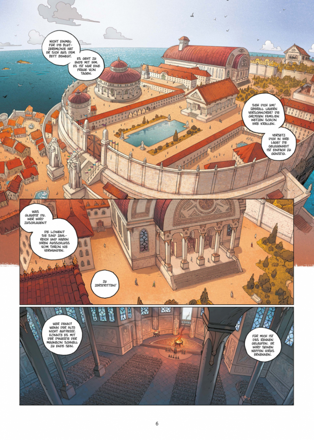 Ein Epos startet hier mit dem 1. Band. In weit verzweigter Handlung und in wunderschöner Optik! Ausgangspunkt ist das Geschachere um den bald frei werdenden Thron eines fantastischen Reiches. Gleich drei Autoren schrieben das Szenario (Künstlername: Lewelyn).
