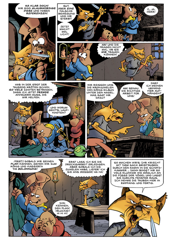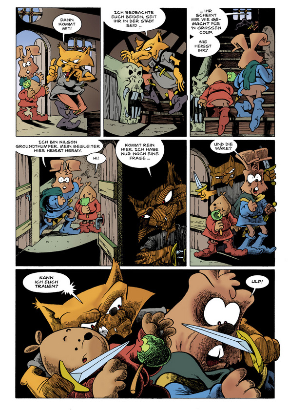 Bevor Miyamoto Usagi im Japan der Edo-Zeit auf Pilgertour zur Vervollkommnung seiner Fähigkeiten als Krieger gegangen ist, gab es, im mittelalterlichen Europa, schon einen anderen wandernden Hasenkrieger auf Abenteuersuche: Nilson Groundthumper! Ausgestattet mit dem Herzen eines Helden und den geistigen Fähigkeiten eines Narren, trifft er … erst einmal auf den schlichten, ganz und gar unschuldigen Hermy. Aber dann geht’s rund! Zu zweit werden die beiden keine Ruhe geben, bis sie gefunden haben, wonach sie suchen – ihre eigene Queste!