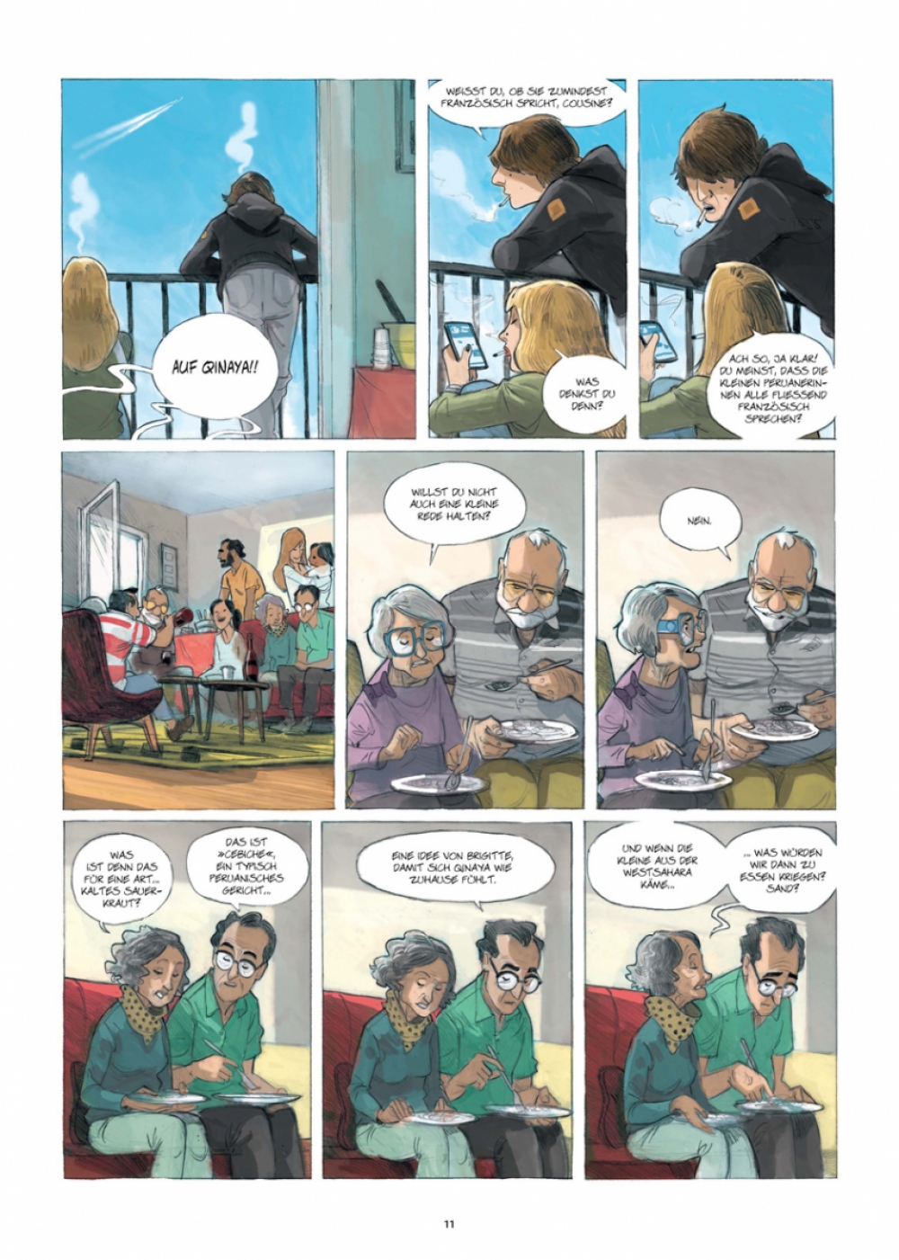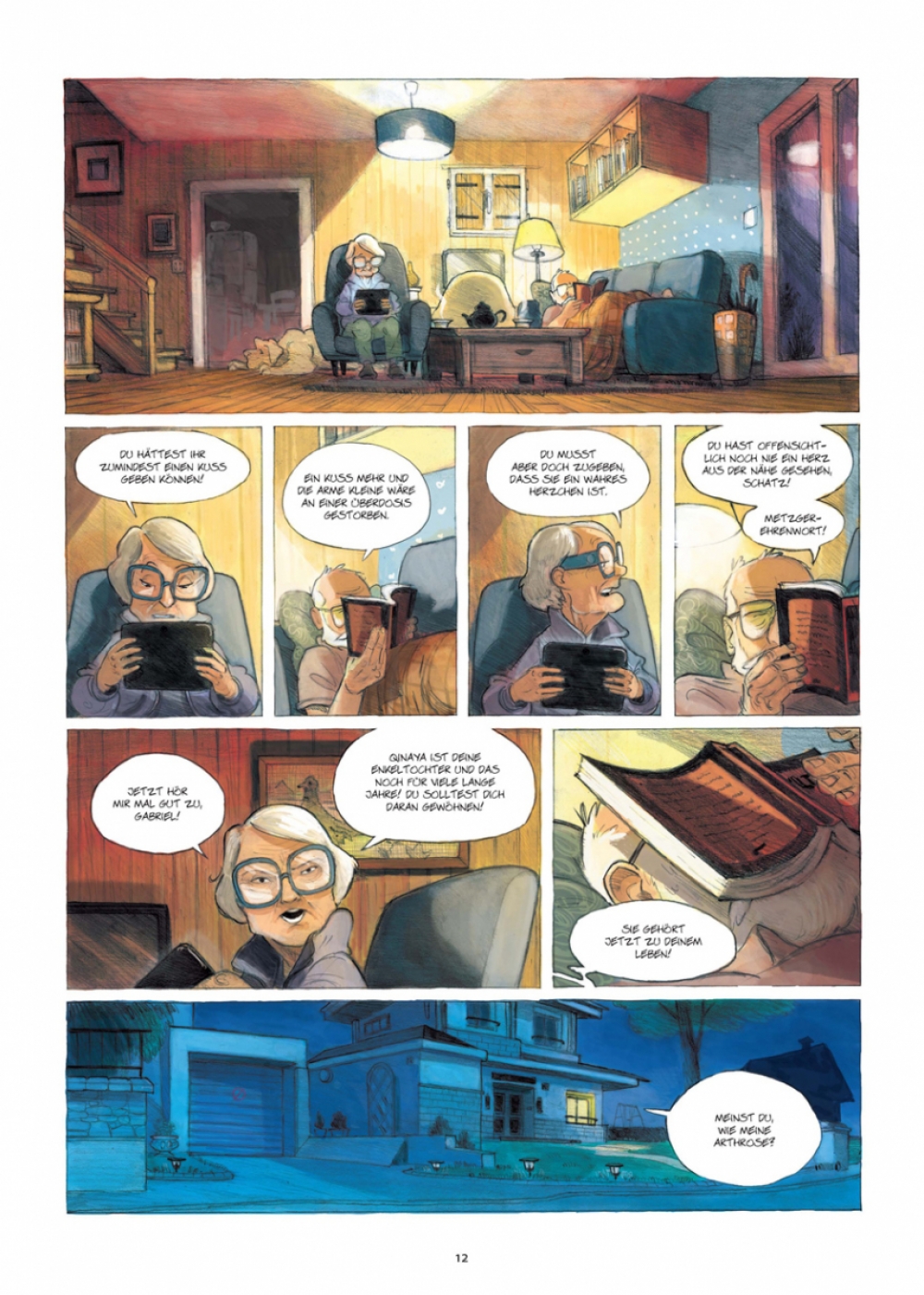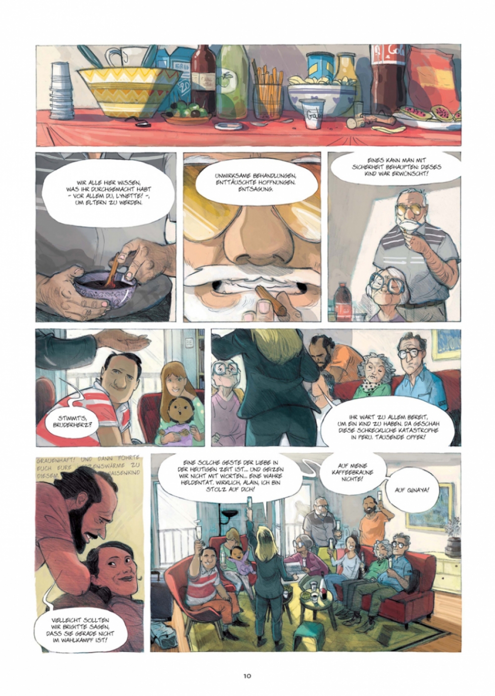 Wozu Weihnachten, wenn man kein Kind hat, mit dem zusammen man dieses Familienfest schlechthin feiern könnte? Für Lynette und Alain, Mitte vierzig, gehört diese Frage der Vergangenheit an. Nach einem verheerenden Erdbeben in Peru hoffen zahllose Waisen auf ein neues Zuhause, und das bis dahin kinderlose Paar adoptiert die kleine Qinaya. Die Ankunft der aufgeweckten Vierjährigen mit den großen, staunenden Augen wirbelt natürlich sofort das Leben aller Beteiligter durcheinander. Aber während sich einige mit Begeisterung in ihre neuen Rollen als Eltern oder Großmutter stürzen, erweckt bei Gabriel der Umstand, plötzlich Opa zu sein, allenfalls gemischte Gefühle. Ob es daran liegt, dass er nie die Zeit gefunden hatte, ein richtiger Vater zu sein? Die liebevoll erzählte und illustrierte Geschichte einer allmählichen Annäherung zweier Charaktere, wie sie unterschiedlicher kaum sein können, und eines alten Griesgrams an sich selbst.