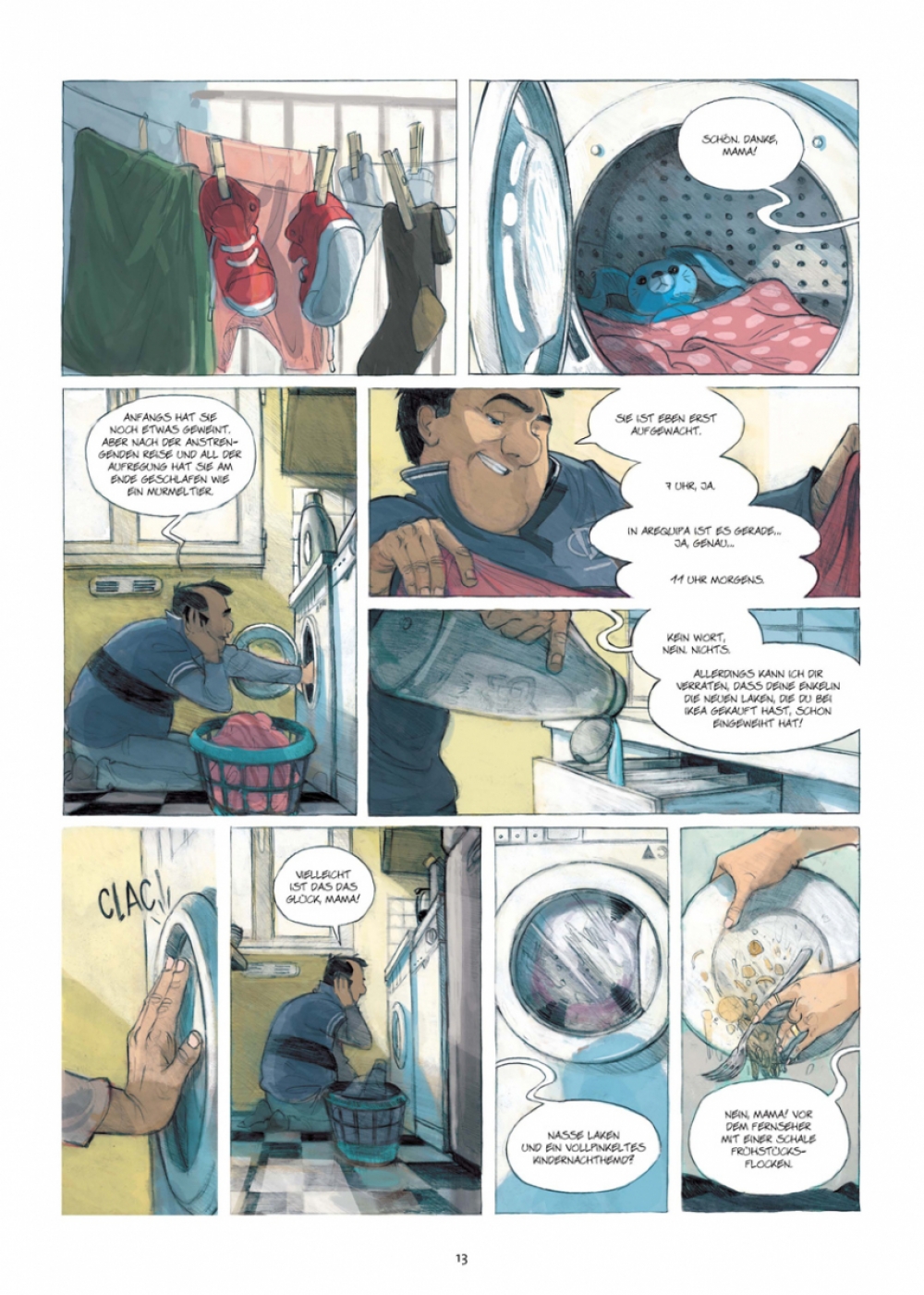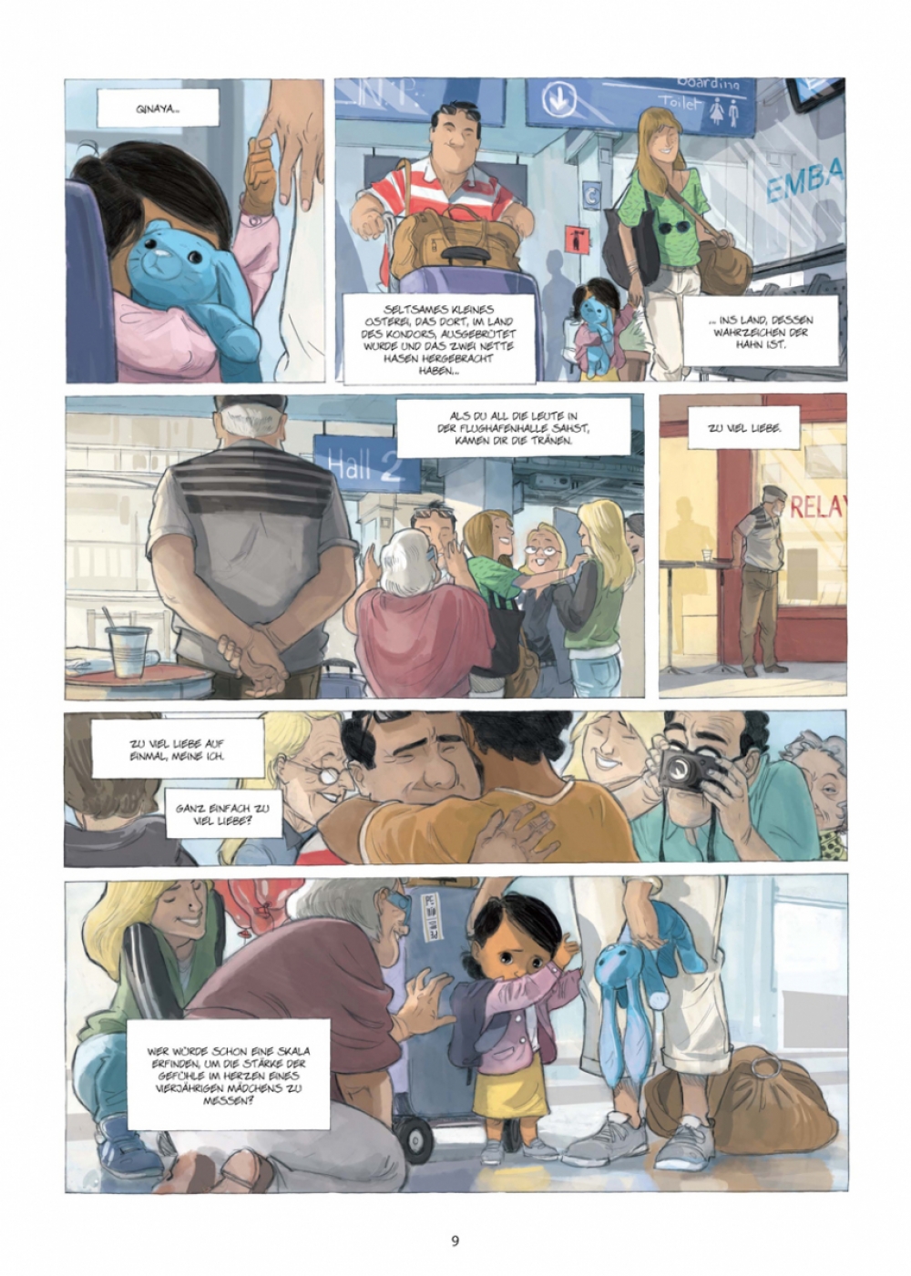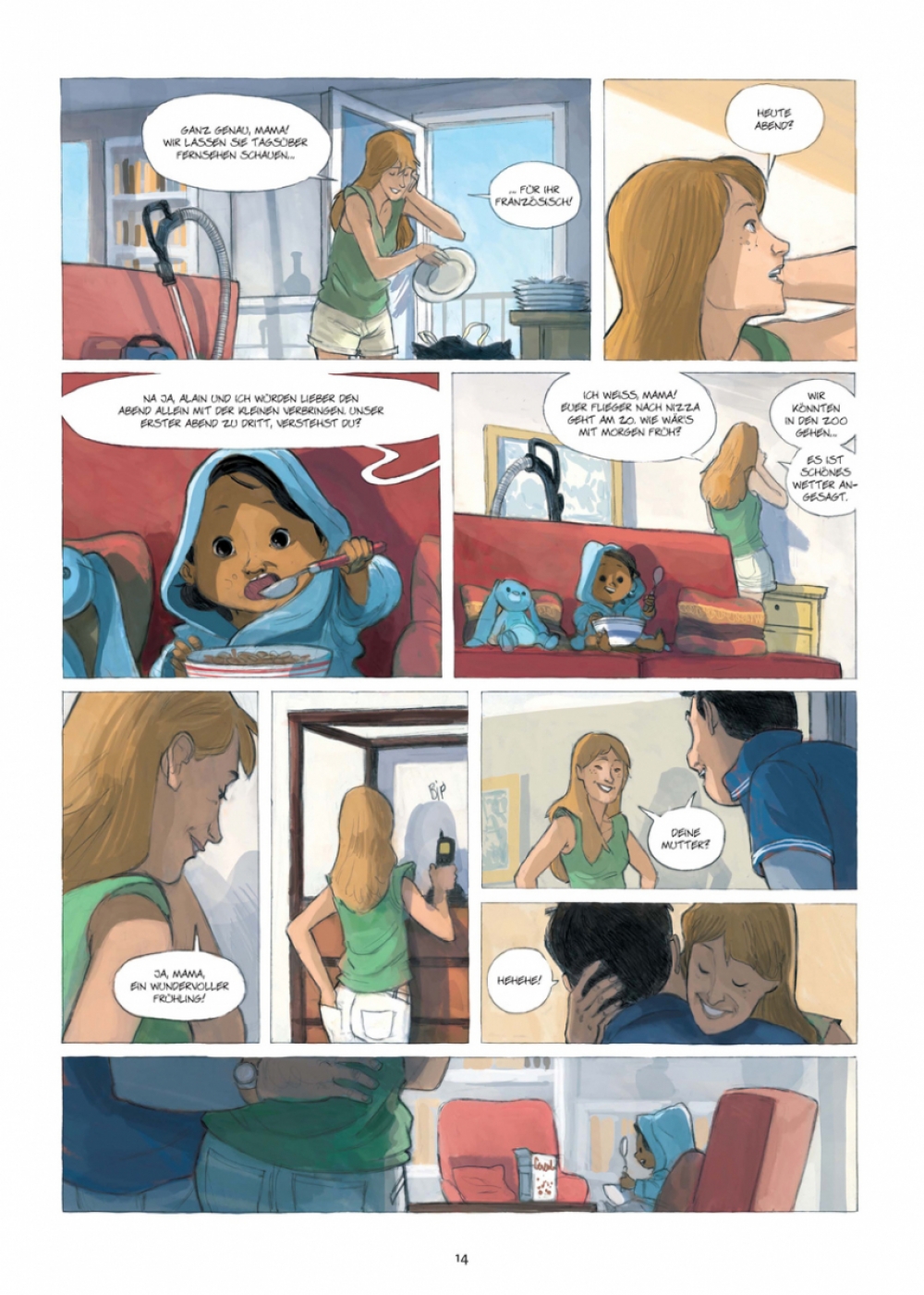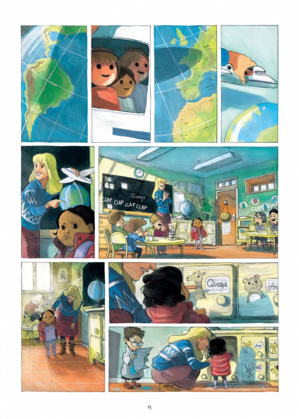 Wozu Weihnachten, wenn man kein Kind hat, mit dem zusammen man dieses Familienfest schlechthin feiern könnte? Für Lynette und Alain, Mitte vierzig, gehört diese Frage der Vergangenheit an. Nach einem verheerenden Erdbeben in Peru hoffen zahllose Waisen auf ein neues Zuhause, und das bis dahin kinderlose Paar adoptiert die kleine Qinaya. Die Ankunft der aufgeweckten Vierjährigen mit den großen, staunenden Augen wirbelt natürlich sofort das Leben aller Beteiligter durcheinander. Aber während sich einige mit Begeisterung in ihre neuen Rollen als Eltern oder Großmutter stürzen, erweckt bei Gabriel der Umstand, plötzlich Opa zu sein, allenfalls gemischte Gefühle. Ob es daran liegt, dass er nie die Zeit gefunden hatte, ein richtiger Vater zu sein? Die liebevoll erzählte und illustrierte Geschichte einer allmählichen Annäherung zweier Charaktere, wie sie unterschiedlicher kaum sein können, und eines alten Griesgrams an sich selbst.