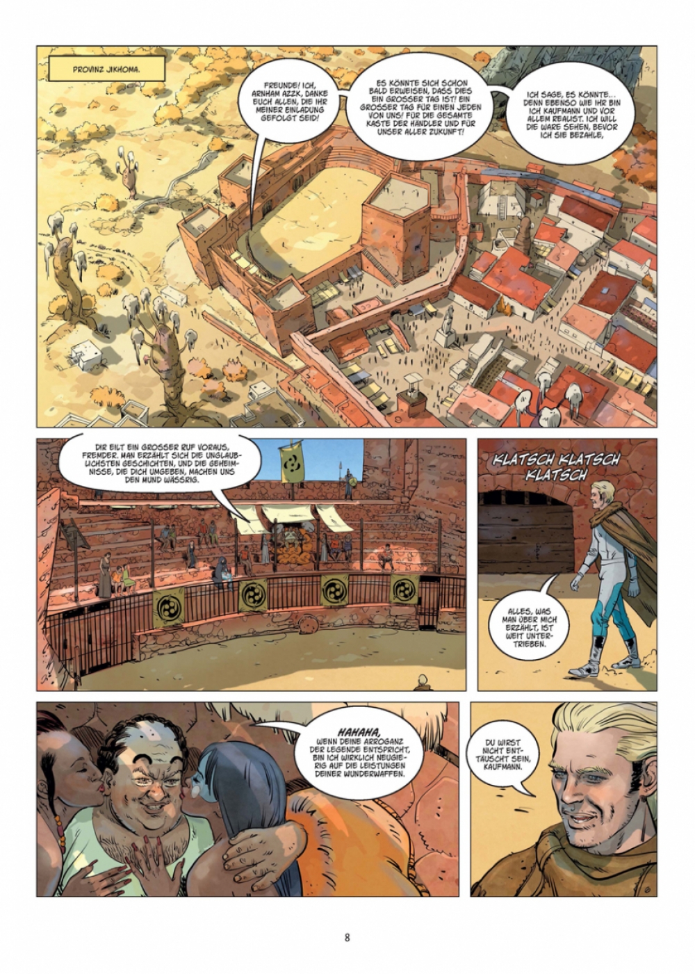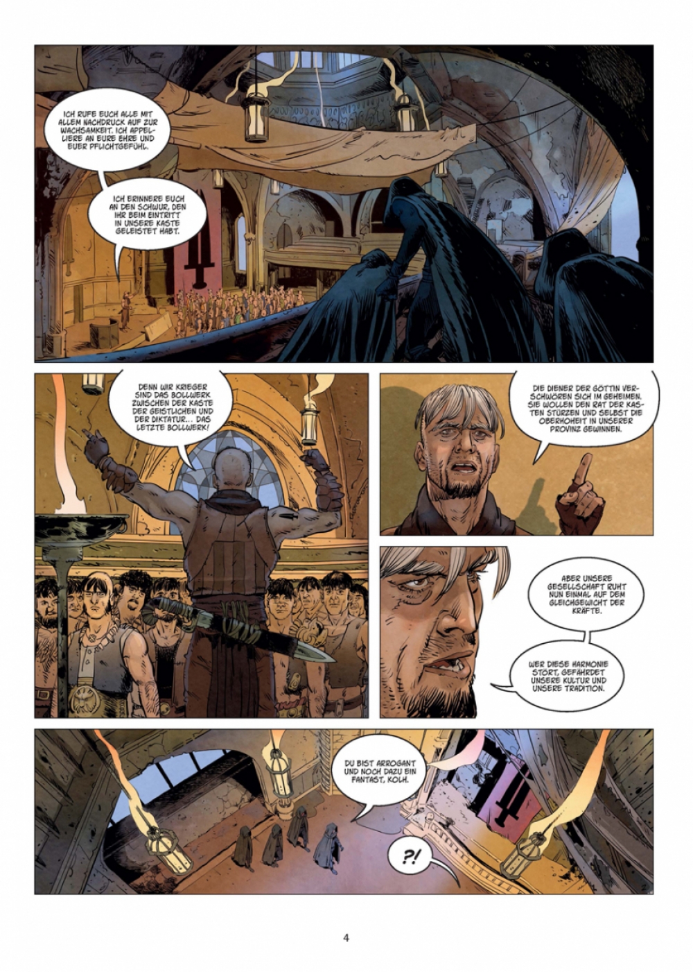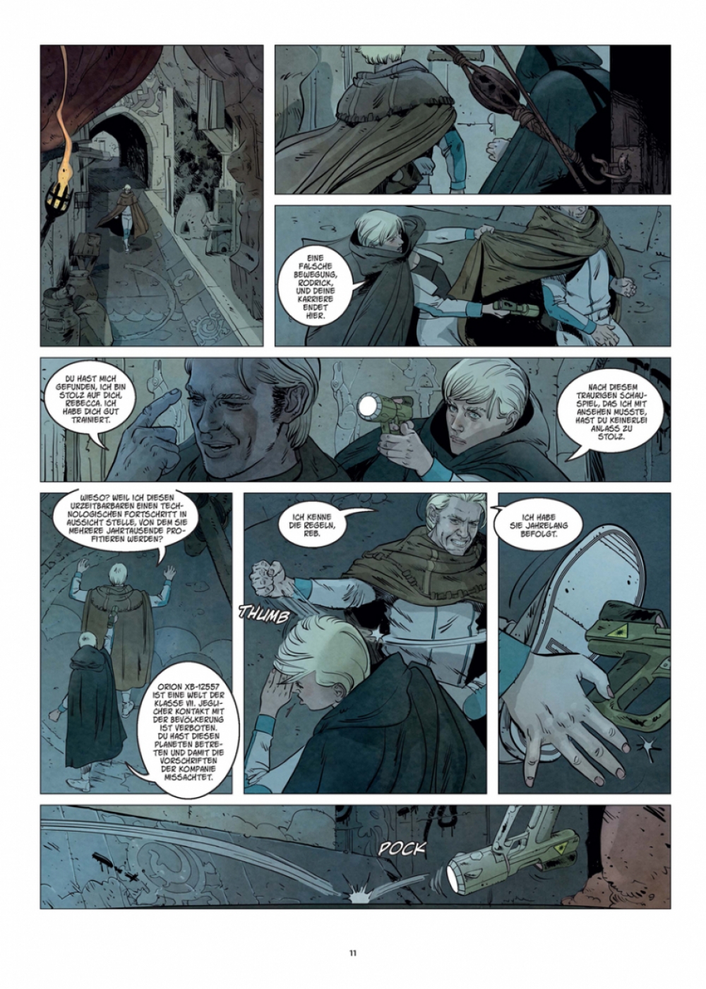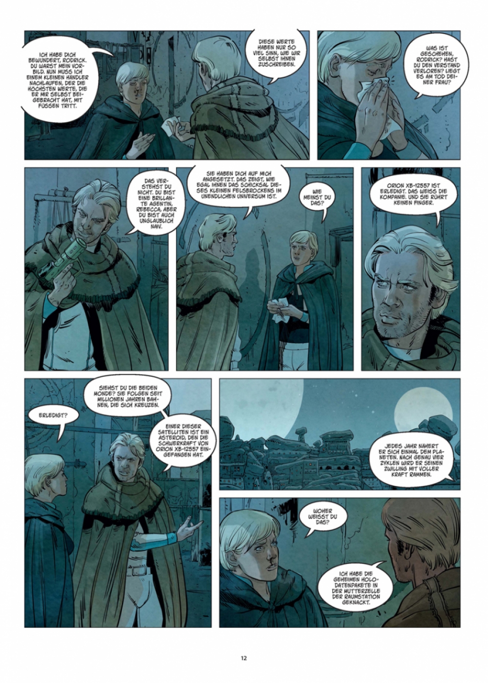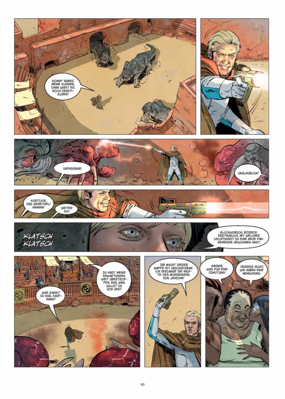 Auf einem kleinen Planeten im Sternbild Orion hat sich eine mittelalterlich anmutende Zivilisation von Menschen entwickelt, die ihre irdische Herkunft schon lange vergessen haben. Der Ex-Krieger Kolhen wird in die Machenschaften eines mysteriösen Mannes hineingezogen, der vom Himmel gekommen sein soll und über eine todbringende Technologie verfügt, die den gesamten Planeten ins Chaos zu stürzen droht. Aber davon lässt sich Kolhen keinesfalls abschrecken – einmal Krieger, immer Krieger. Und auch wenn er bei der Gelegenheit erfährt, dass seine Heimat mit ihren bizarren Tierwesen und rätselhaften Raumschiffrelikten gar keine Scheibe ist, sondern nur eine Kugel im grenzenlosen All, er wird diesen Unbekannten in seine Schranken weisen. Um sich dann endlich an denen zu rächen, die mit einer infamen Intrige für seine Verstoßung gesorgt haben.