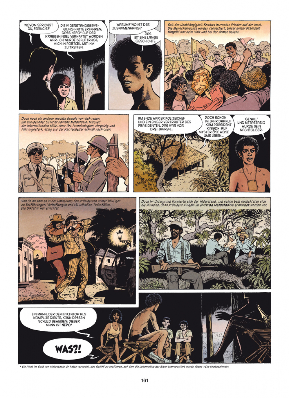 In den beiden ersten Abenteuern, die von MiTacq sowohl geschrieben als auch gezeichnet wurden, reisen die Pfadfinder in den Indischen Ozean auf die Krabbeninsel, wo sie einem von einem Diktator unterdrückten Volk zu Hilfe kommen wollen. Das dritte Album spielt in den belgischen Ardennen, das Szenario dafür stammt von Marc Wasterlain, Autor und Zeichner der Serie Monika Morell.