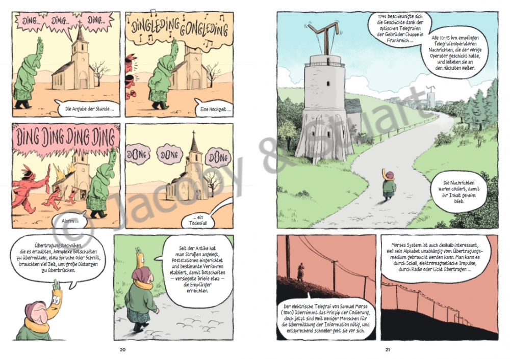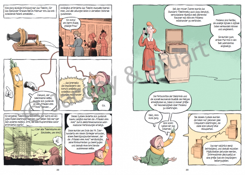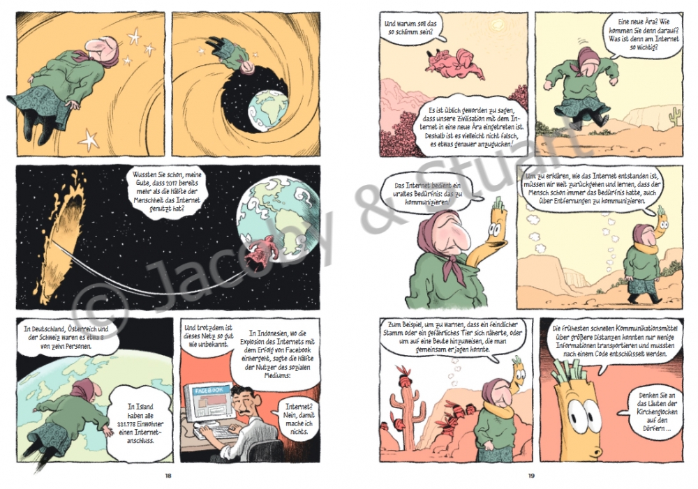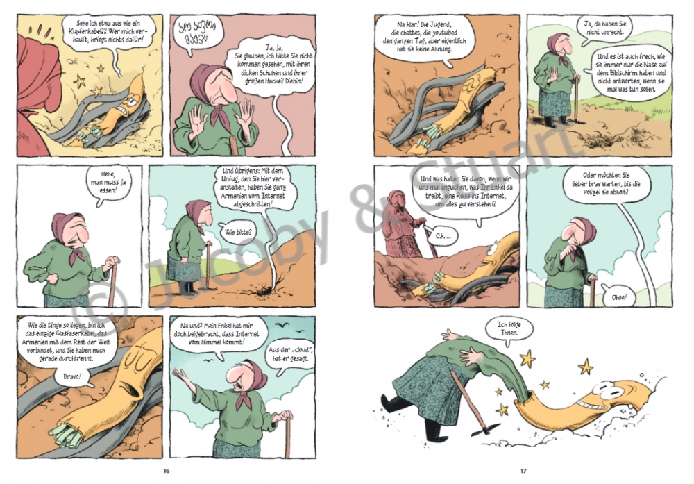 Der Wissenschaftler und Blogger Lafargue führt uns vor Augen, gerade auch mithilfe der anschaulichen Illustrationen, dass das Internet auch eine nicht-digitale Infrastruktur hat, die immer mal wieder komplett ausfallen kann. So stieß etwa 2011 eine georgische Rentnerin in einem Feld auf ein Glasfaserkabel, das sie für ein Kupferkabel hielt, und grub es aus, um es zu verkaufen. Daraufhin gab es in halb Georgien und einem Nachbarland kein Internet mehr. Es ist dieses Kabel, das der alten Frau im Comic deutlich macht, was sie angerichtet hat, und es führt durch die Geschichte sowie die ganze Gegenwartswelt des Internet.