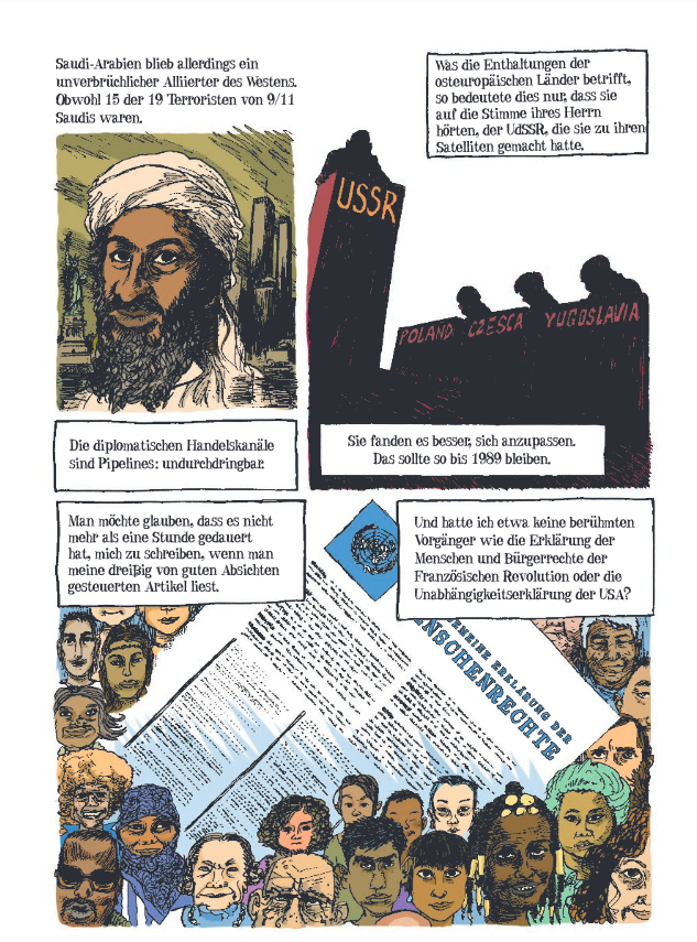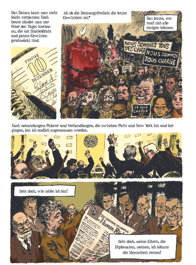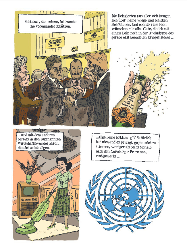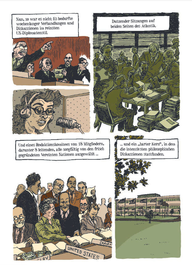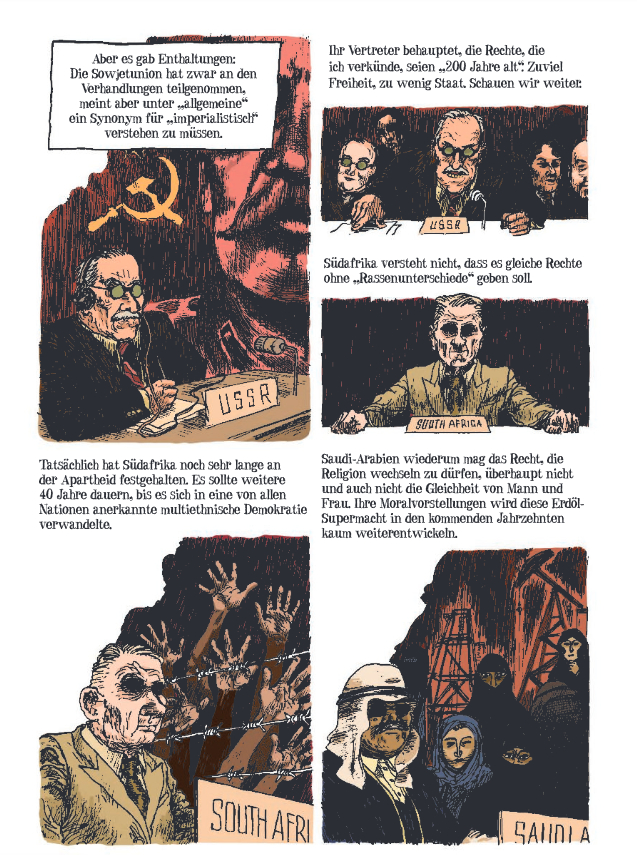 1948, nach den Erfahrungen der Gräuel des Zweiten Weltkriegs und vor allem des Holocaust, formulierten die Vereinten Nationen unter der Federführung von Eleanor Roosevelt und René Cassin die Allgemeine Erklärung der Menschenrechte. Diese ist kein verbindliches Völkerrecht, sondern ein Modell, das längst nicht allen Staaten passte. Die Sowjetunion sah die sozialen Rechte nicht genug betont, der südafrikanische Apartheitsstaat fand gar nicht, dass alle Menschen dieselben Rechte haben sollten, die Saudis wollten Frauen keine gleichen Rechte geben und den Menschen keine freie Wahl ihrer Religion zugestehen; auch die USA haben die Folter legitimiert, und gleicher Zugang zur Bildung ist nicht einmal in Deutschland durchgesetzt. Also muss an der Formulierung und vor allem der Durchsetzung der Menschenrechte weitergearbeitet werden.
