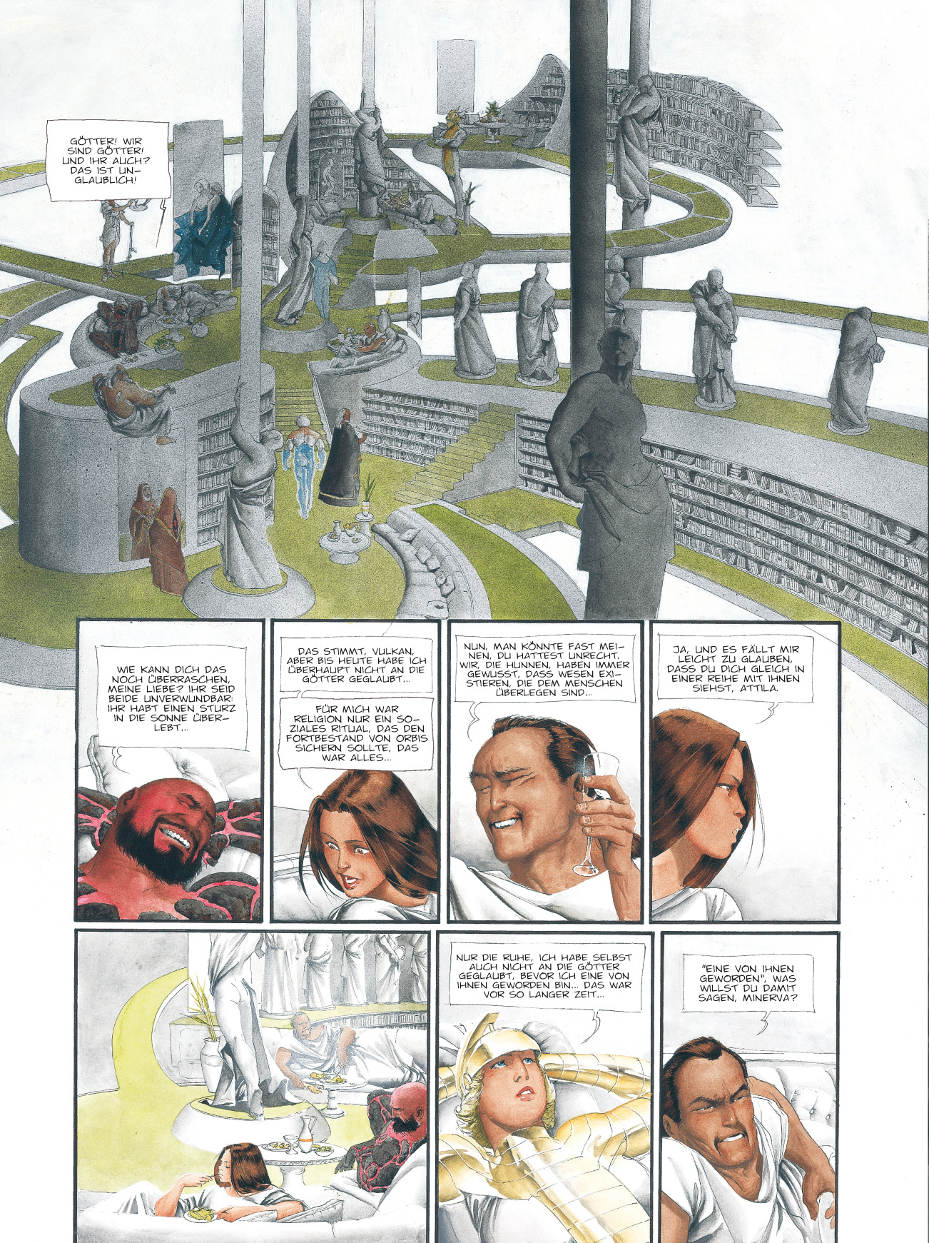 In diesen Kampf greifen sogar die Götter selbst ein: Dei ex machina beschreibt, wie Flavia und Attila (auch bekannt als Venus und Mars) sich stellvertretend mit dem Rest des Pantheons anlegen. Exit schließlich beschreibt das Ende der titanischen Auseinandersetzung.