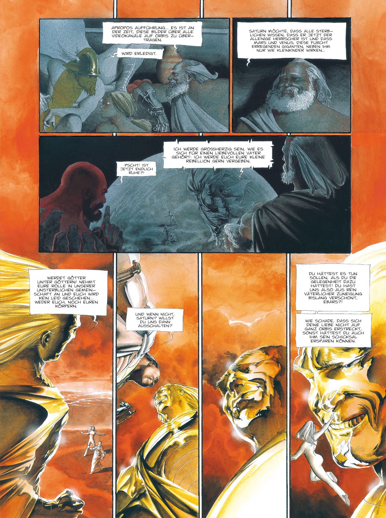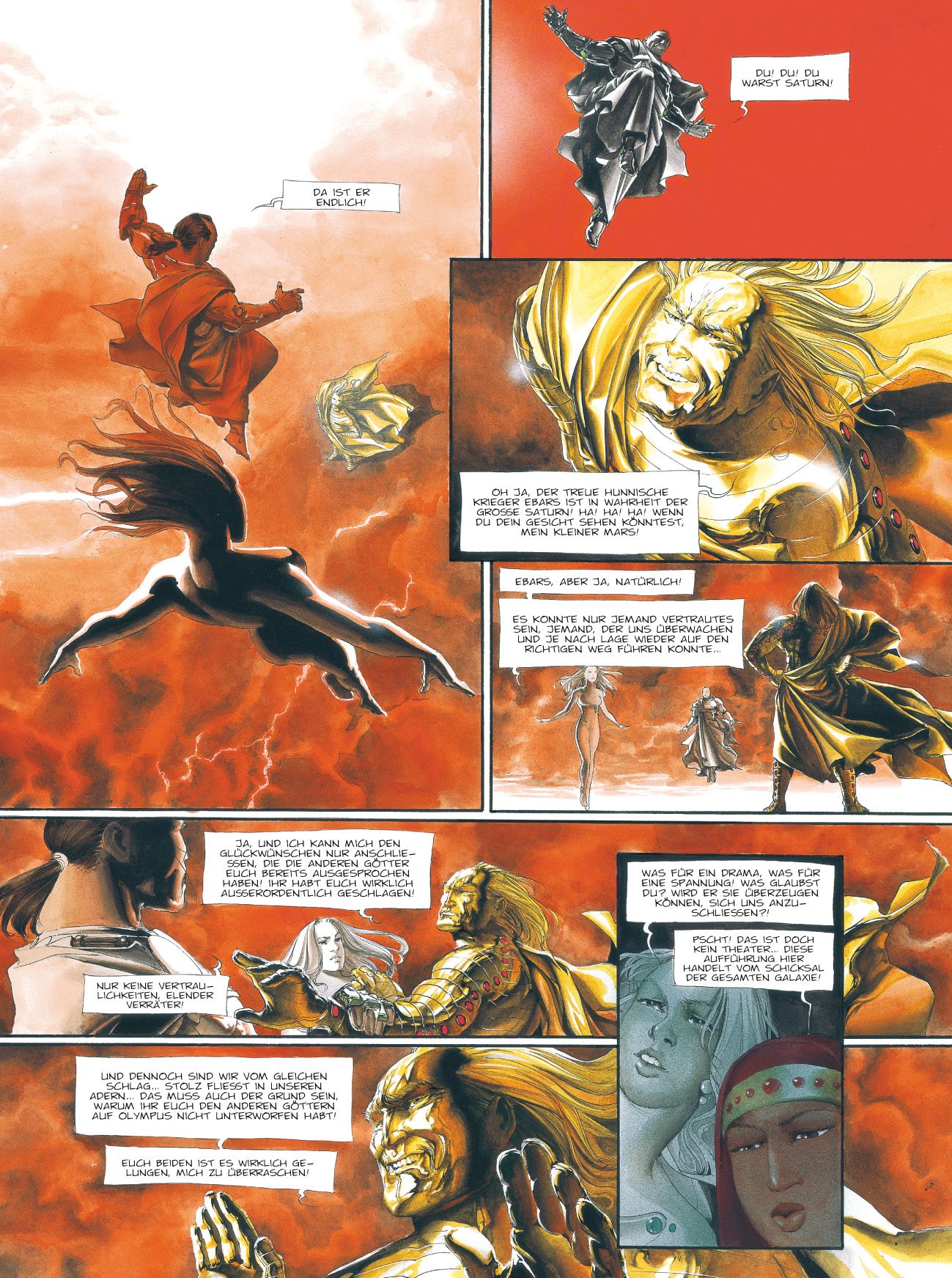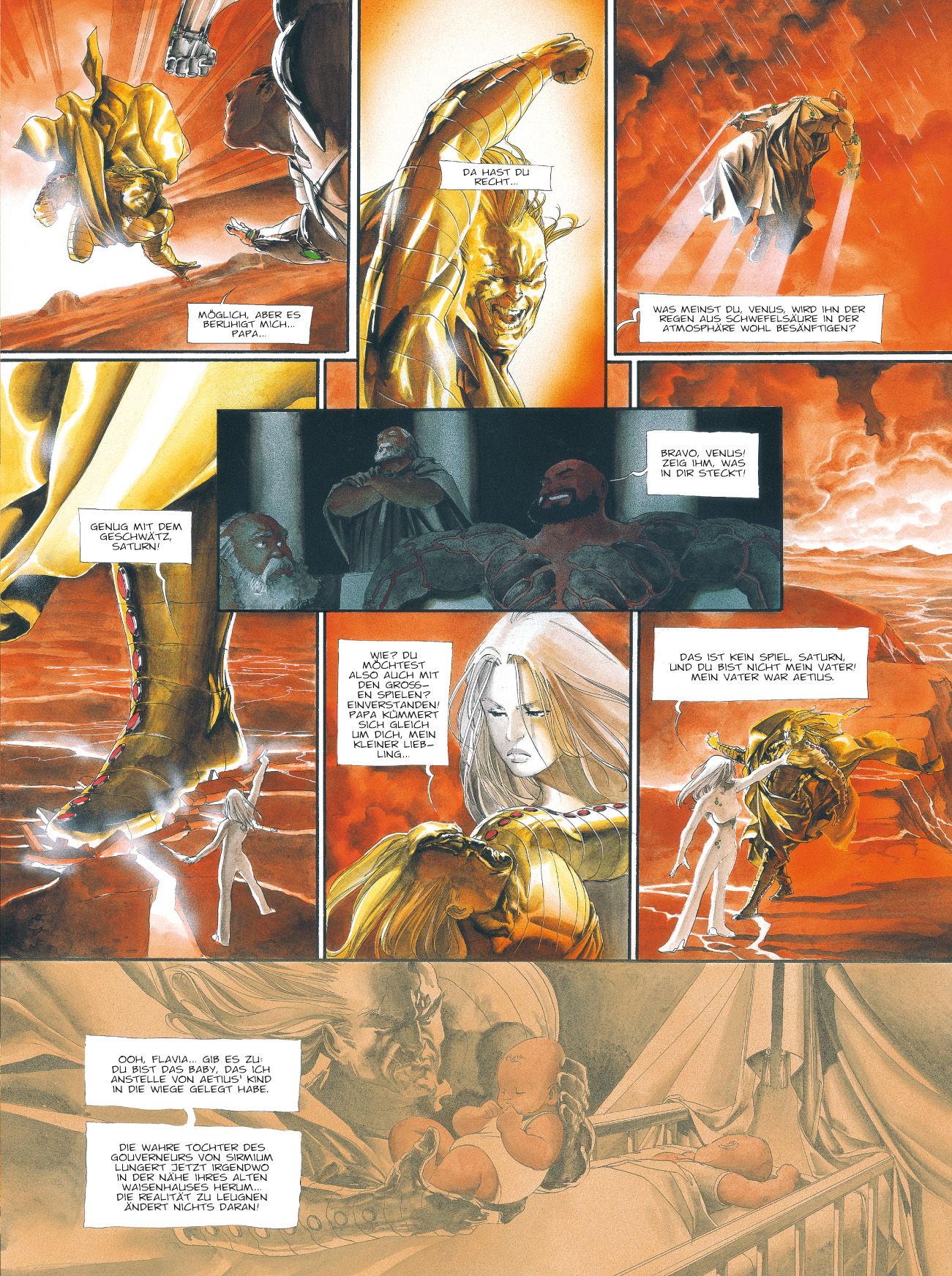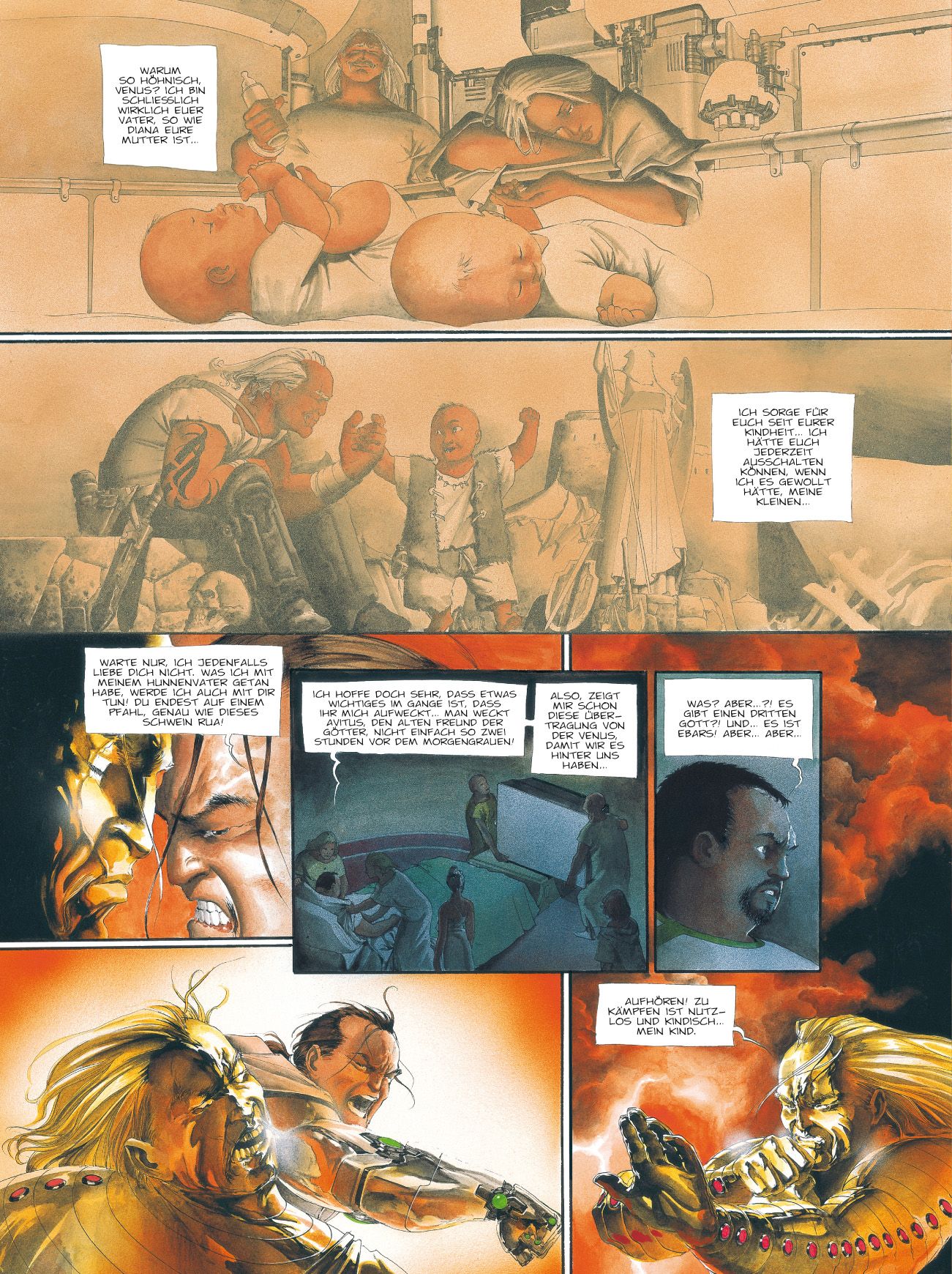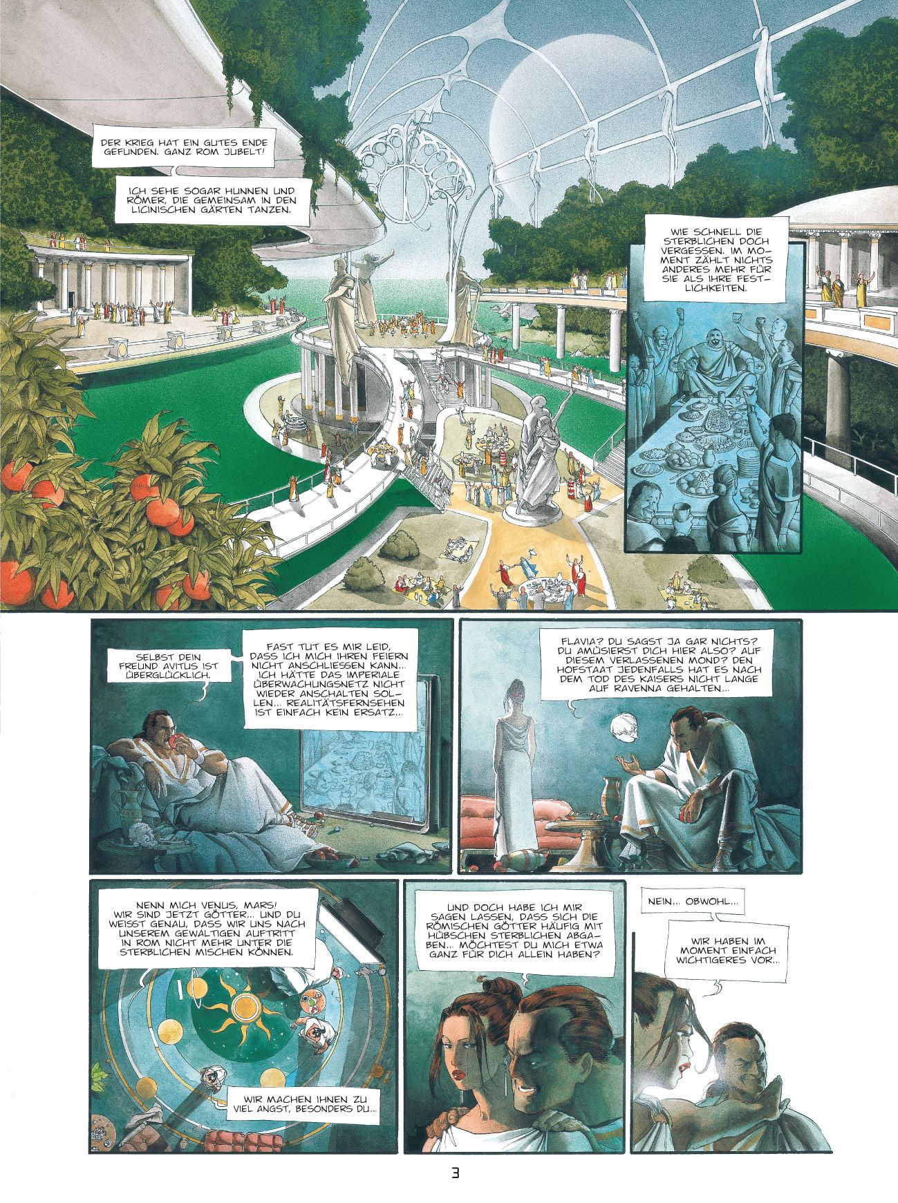 In diesen Kampf greifen sogar die Götter selbst ein: Dei ex machina beschreibt, wie Flavia und Attila (auch bekannt als Venus und Mars) sich stellvertretend mit dem Rest des Pantheons anlegen. Exit schließlich beschreibt das Ende der titanischen Auseinandersetzung.