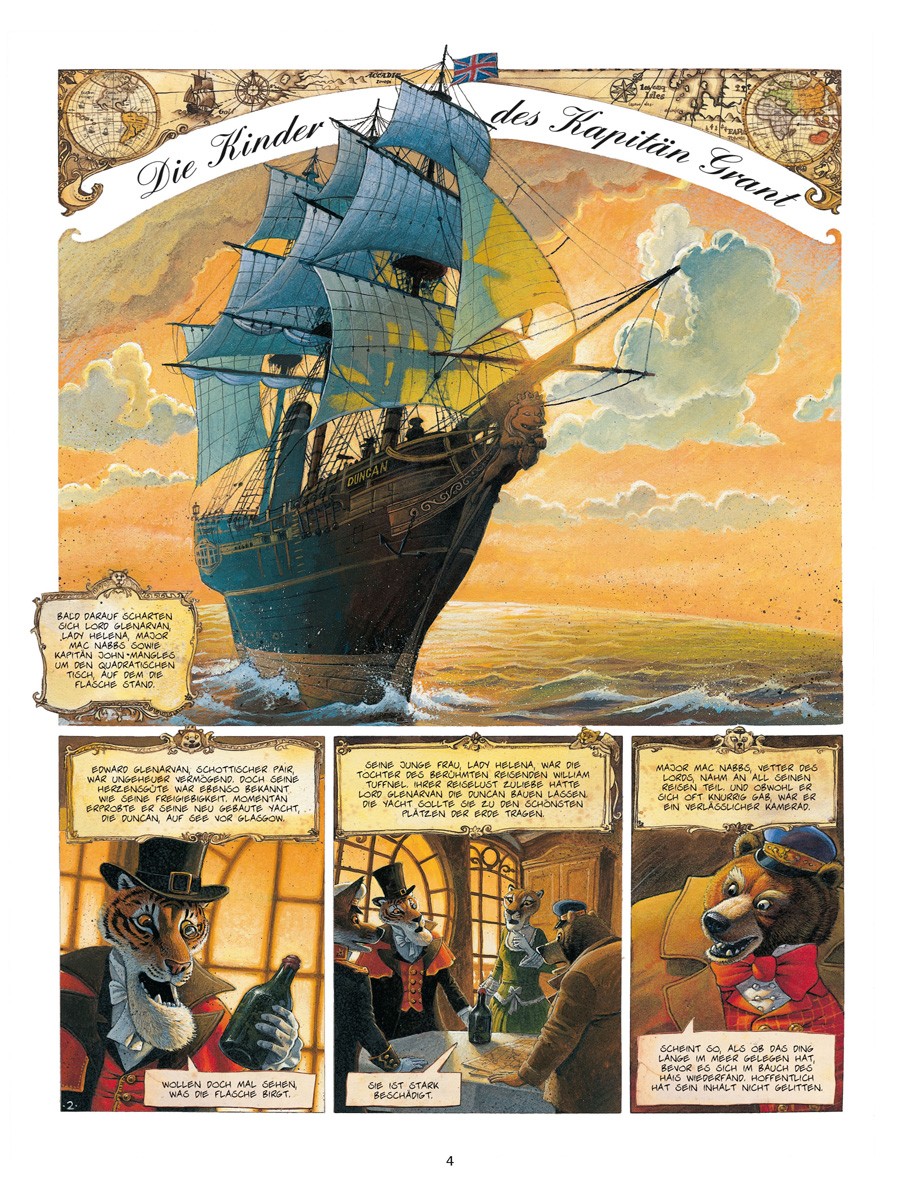 Bei einer Exkursion auf See finden Lord und Lady Glenarvan im Körper eines Hais eine Flaschenpost, deren Botschaft nahelegt, dass der verschollene Kapitän Grant und Teile seiner Besatzung noch leben. Sie beschließen, auf die Suche nach den Überlebenden zu gehen. Begleitet werden sie von Mary und Robert, den Kindern des verschwundenen Kapitäns, und von Paganel, einem verschrobenen Gelehrten. Dies ist der Beginn eines bewegenden Abenteuers, das sie in die abgelegensten Ecken der Welt führt.