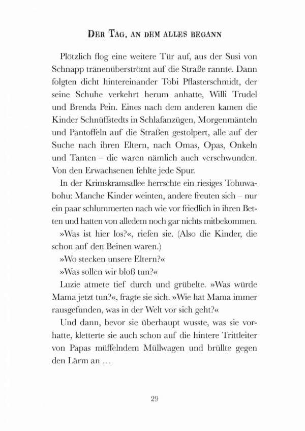 Lucys Stadt versinkt im Chaos, als die elternlosen Kinder allesamt über die Stränge schlagen. Es ist ein Tohuwabohu! Der reine Wahnsinn! Die meisten Kinder sind begeistert, aber Lucy will herausfinden, was geschehen ist.
