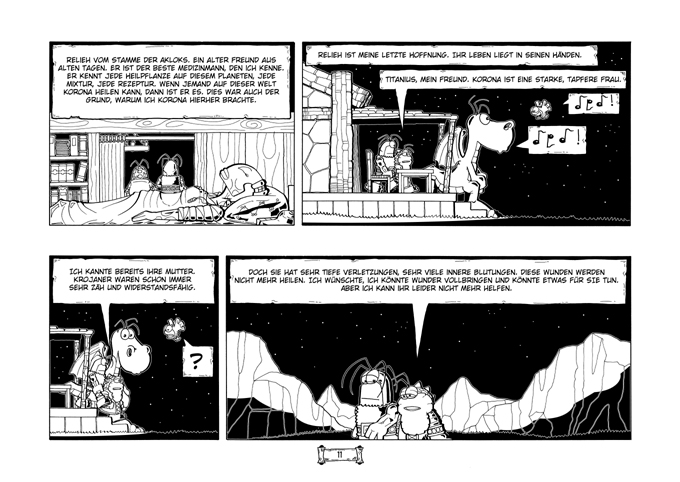 Korona ist schwer verletzt und liegt im Sterben. Titanius letzte Hoffnung ist Relieh, ein alter, weiser Medizinmann. Aber Relieh kann ihr nicht mehr helfen. Koronas Wunden sind zu tief. Doch ein letzter, kleiner Hoffnungsfunke bleibt: Elfenstaub. Die Heilblume der Götter. Hinter dem