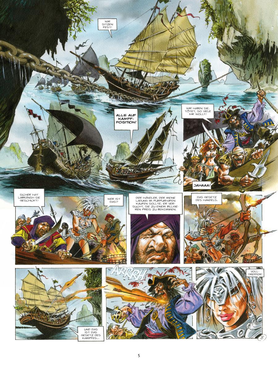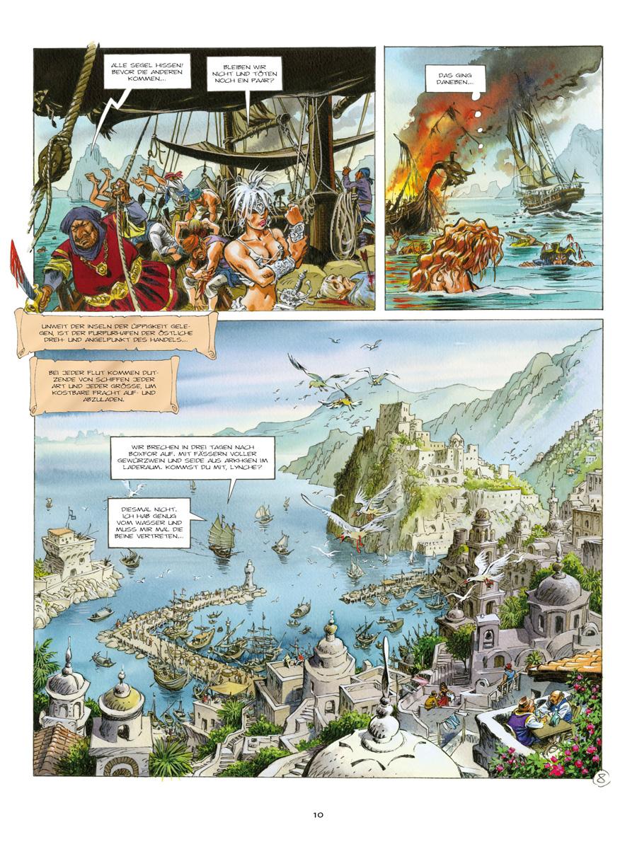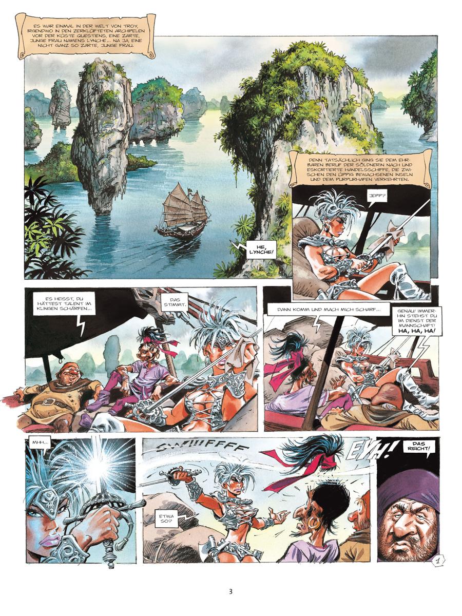 Von den Koggen im Purpurhafen bis zur großen Wüs-te von Delpont ist es für Lynche und Raya, zwei Söldnerinnen im Dienste der humanitären Karawane, ein langer Weg. Ihr Ziel ist es, die Wüstenbewohner vor einer Hungersnot zu retten. Während die rothaarige und beherzte Raya dem charismatischen Karawanenführer Yquem rückhaltlos folgt, so gilt dies nicht für die kompromisslose Lynche. Welche Verbindung gibt es zwischen den Zeichen, die sie auf ihrem Körper trägt, und den Anführern der Expedition? Bald darauf gesellt sich eine dritte Söldnerin, Yssam, zu den beiden Kriegerinnen, die ebenfalls ein mysteriöses Geheimnis zu umgeben scheint. Weit entfernt von ihren alltäglichen Kämpfen führt sie dieses Abenteuer auf den Wegen von Troy hin zu einer unerwarteten und furchtbaren Entdeckung.