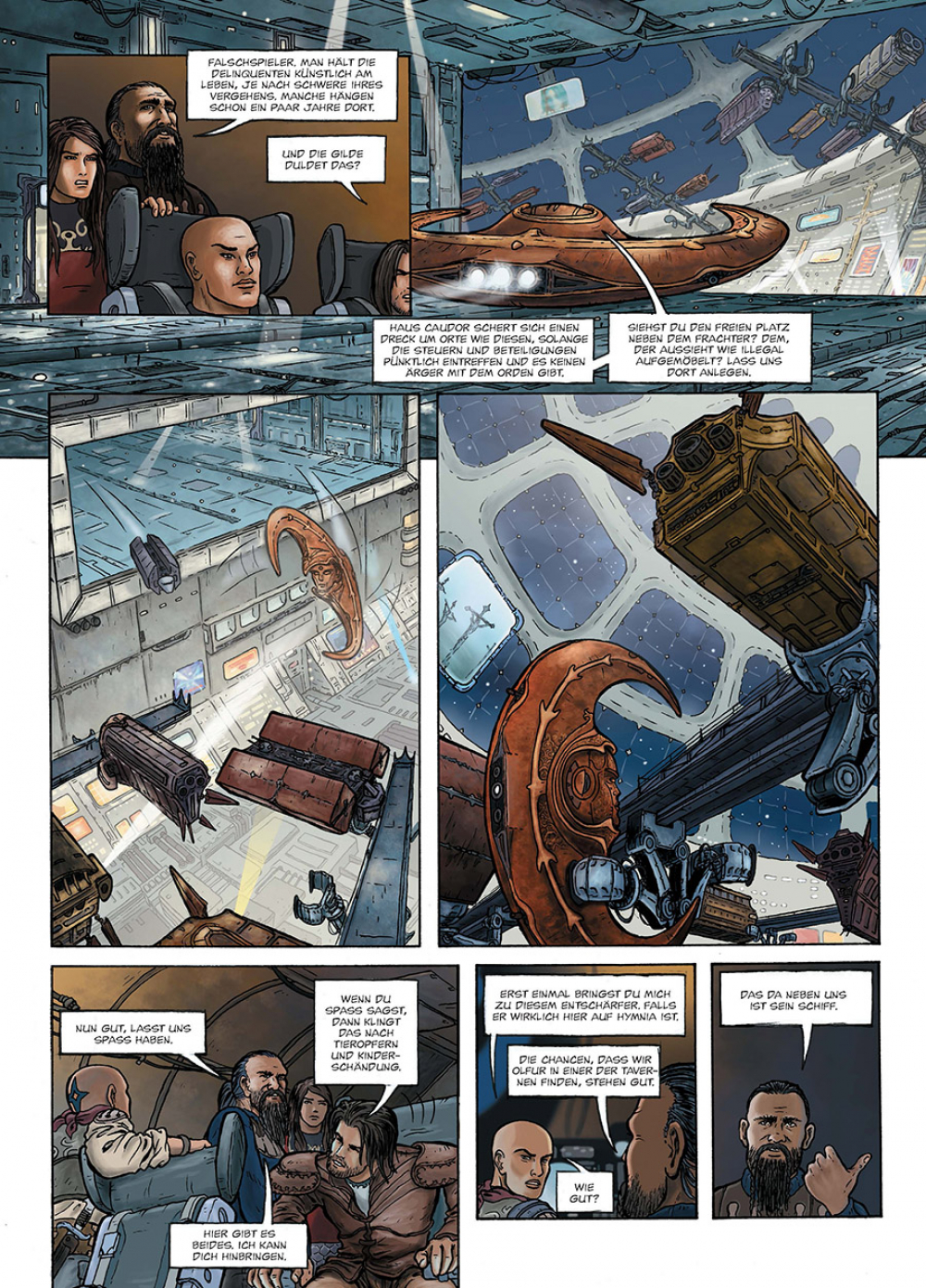 Auf der Raumstation Hymnia, einem Eldorado für Glücksspieler und zwielichtige Gestalten, suchen Kranit und ihre Crew ihren alten Freund Olfur auf, der Shara Bitterstern von ihrem Sprengkragen befreien soll. Während Olfur und seine Muse – ein Android in Gestalt einer jungen Frau – mit der Entschärfung des Halsrings beschäftigt sind, läuft der waffenstarrende Gildenkreuzer Caudor Terminus in den Hangar der Station ein. Er steht unter dem Kommando des Stillepriesters Hadrath Talantis – Inizas Onkel, der gekommen ist, um sie zurückzuholen. Die Besatzung der Nachtwärts sitzt in der Falle!