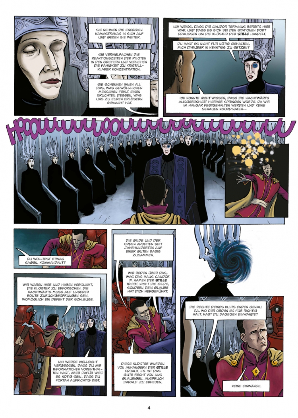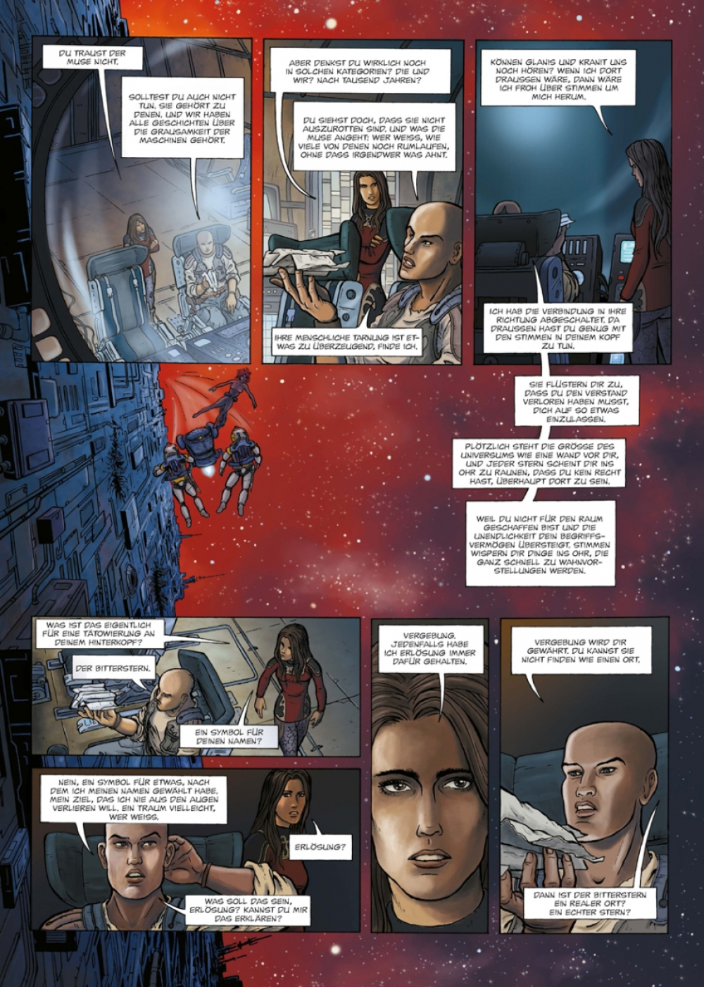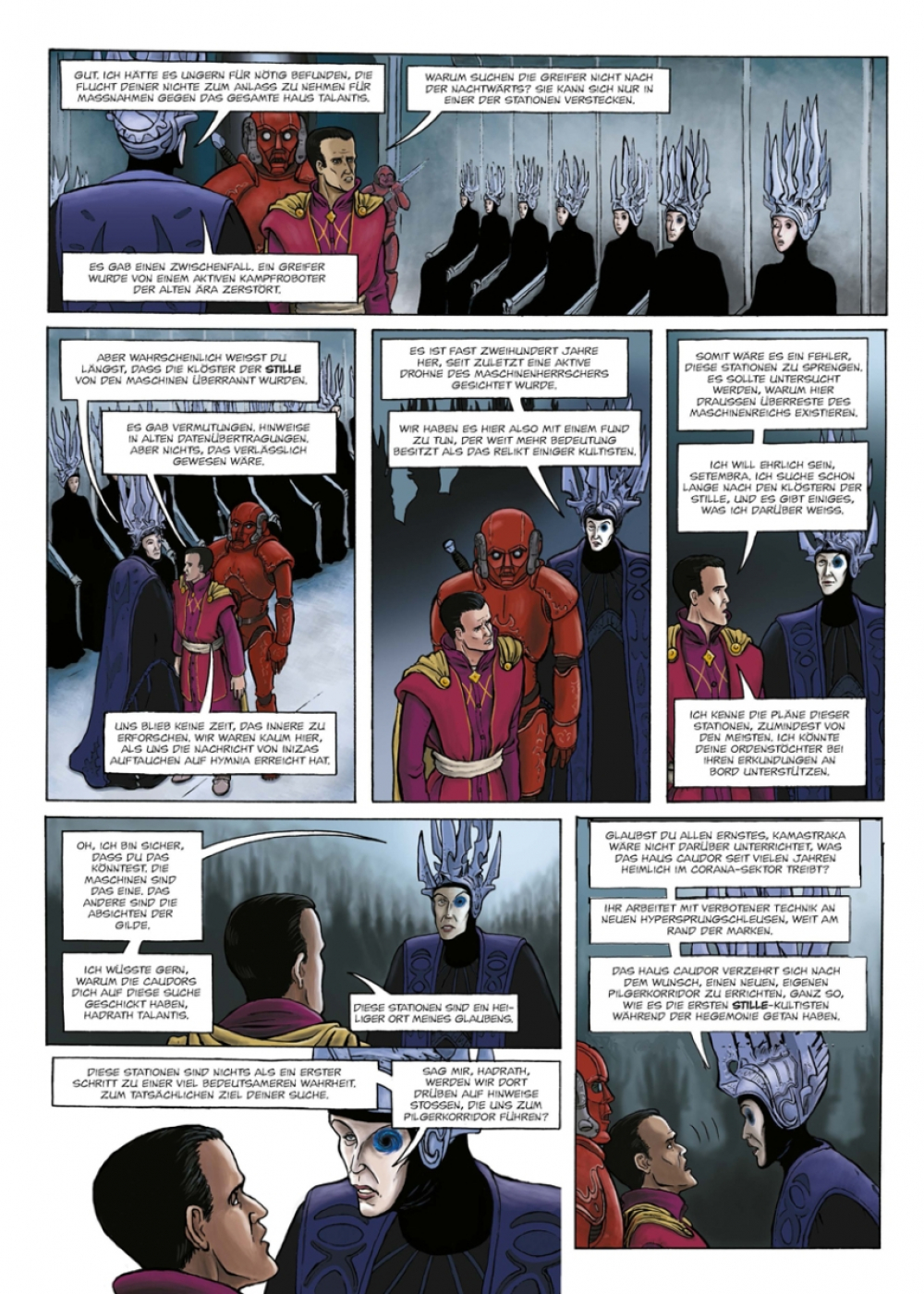 Auf der Flucht vor dem Hexenorden versteckt sich die Nachtwärts in den Klöstern der STILLE. Der einzige Weg in die Freiheit führt durch die Hypersprungschleuse, die in den uralten, menschenverlassenen Raumstationen verborgen ist. Doch um diese zu aktivieren ist die Besatzung auf die Hilfe der Muse und ihrer Freunde angewiesen - den wiedererwachten Kampfrobotern des Maschinenherrschers, die zu Hunderten in den Klöstern der STILLE lauern. Der in Ungnade gefallene STILLE-Priester Hadraht Talantis sitzt derweil mit seinem Schiff im Hangar der Weltraumkathedrale fest. Aber um seine eigenen Ziele zu erreichen, schreckt Inizas Onkel auch nicht davor zurück, sich endgültig mit dem Hexen zu überwerfen.