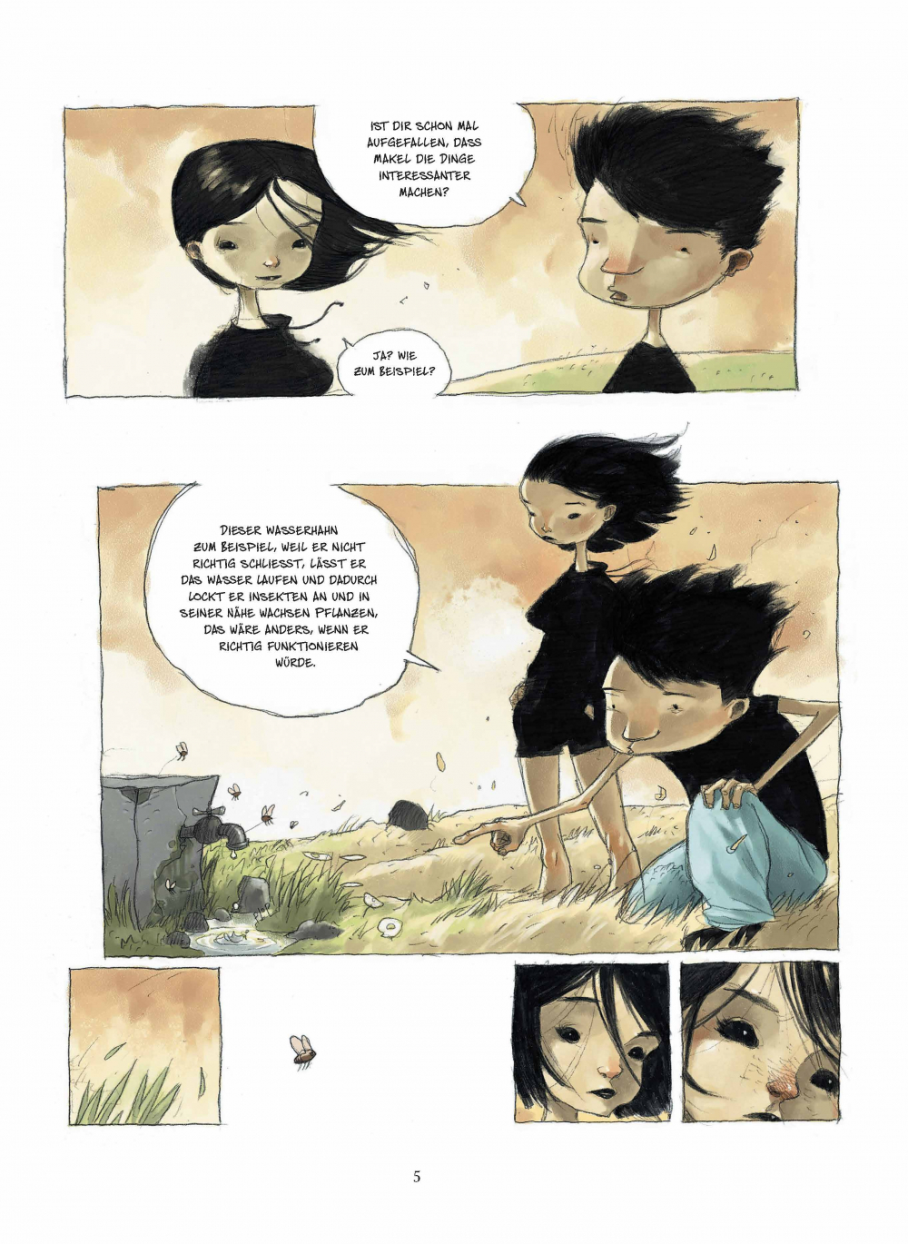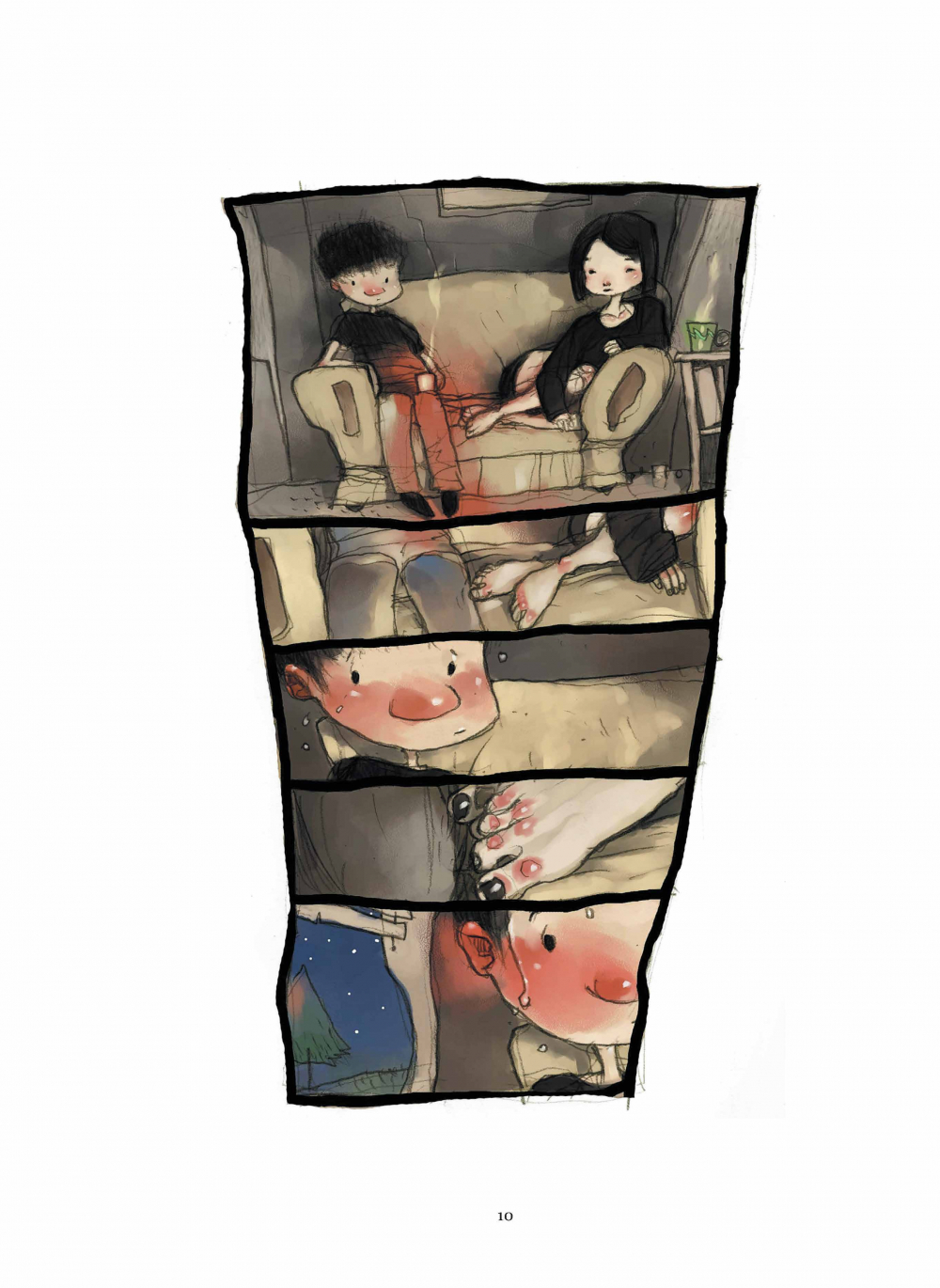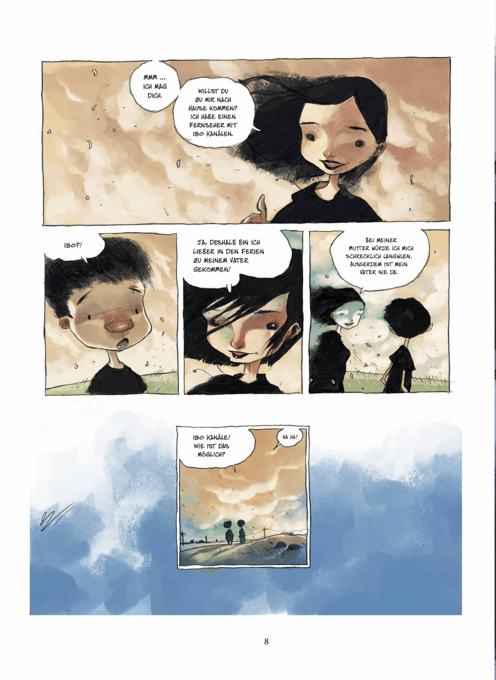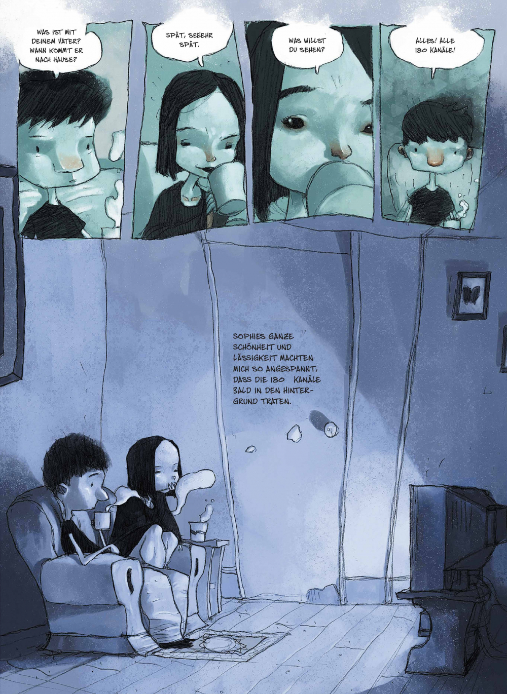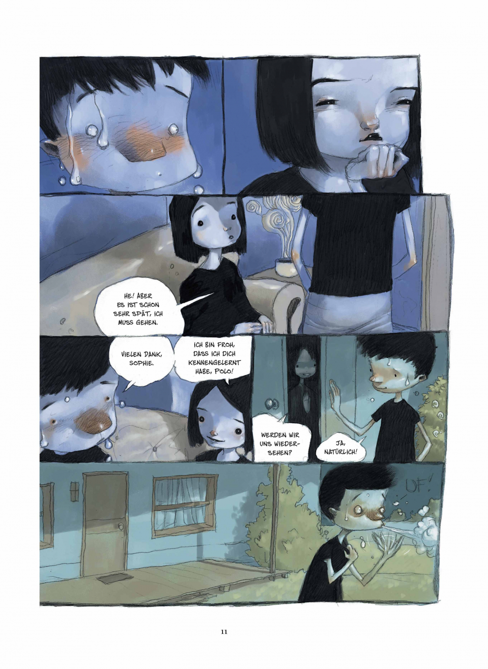 Tony Sandoval (DOOMBOY, WASSERSCHLANGEN) erweist sich mit gefühlvoller Hand einmal mehr als Meister des Makabren, das sich in eine Story mit poetischem Tiefgang kleidet. In DIE LEICHE UND DAS SOFA entspinnt sich für zwei Jugendliche ein zärtliches Netz von Vergänglichkeit, Unsicherheit, Angst und Liebe.