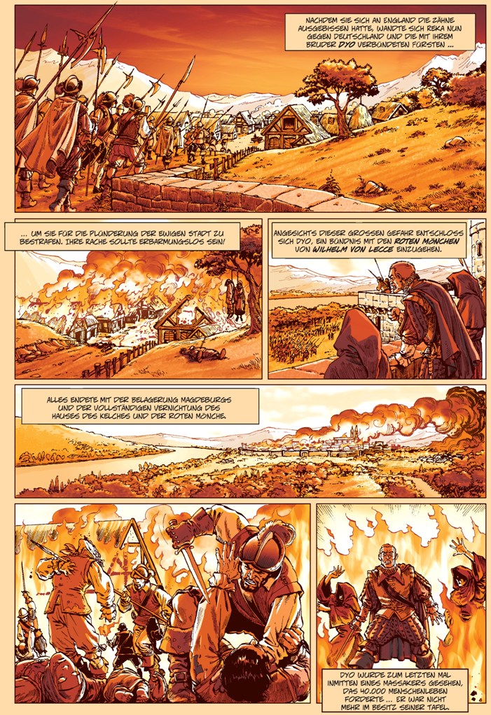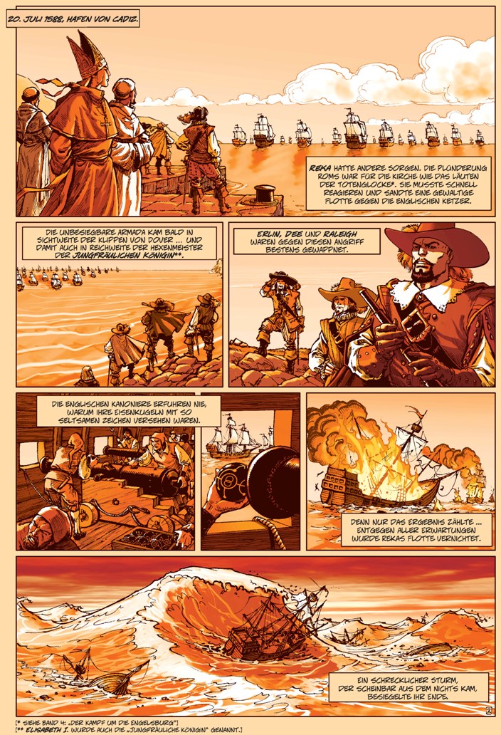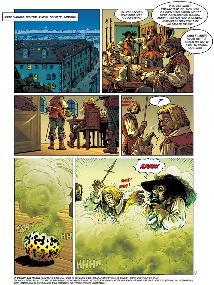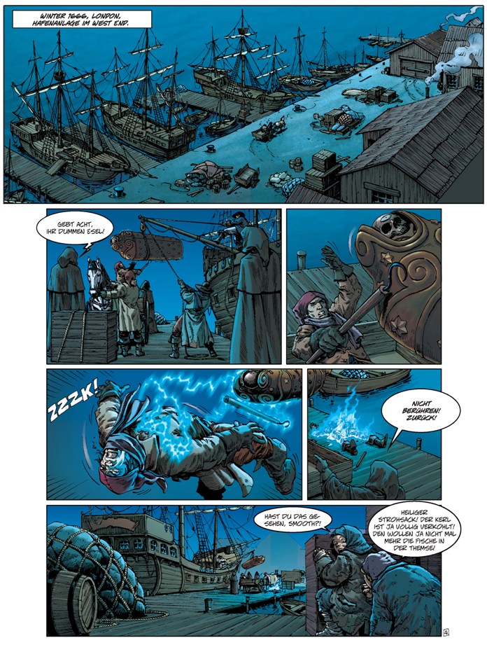 War noch im letzten Album der Schauplatz Italien handelt diese Geschichte nun zum großen Teil in London. Und zwar zur Zeit als das Regime von Oliver Cromwell gerade beendet wurde. Das europäische Festland leidet noch immer unter der Auswirkungen des vor 18 Jahren beendeten 30-jährigen Krieges. London selbst lebt langsam wieder auf, doch unheimliche Kreaturen treiben ihr Unwesen in der Hauptstadt Englands. Dort treffen wir den Archonten Erlin, den Hüter vom Haus des Schildes, und andere Persönlichkeiten dieser Zeit wie Isaac Newton. Aber nicht nur Erlin und seine Wegbegleiter sind an der Aufklärung der unheimlichen Vorgänge interessiert...