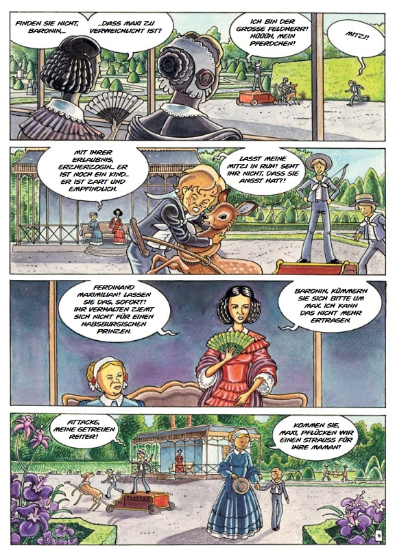 Die fünfbändige Graphic Novel Die Mexikaner entspinnt in einem breiten epischen Bogen die Geschichte dieser absurden Expedition, die mit dem Tod Tausender Soldaten und Zivilisten sowie des Kaisers selbst enden sollte. Ihre einzelnen Stationen – von der intriganten Anbahnung des „Geschäfts“ über die Rekrutierung der Freiwilligen, die Ankunft in Mexiko, die verschiedenen Kämpfe bis hin zum tragischen Ende – folgen den historischen Ereignissen. Diese aber bieten den Vorwand für eine böse Abenteuergeschichte, in der ein von seinen Leidenschaften getriebener Desperado die Hauptrolle spielt und die bisher noch nicht erzählt wurde. Die Mexikaner sind eine historisch fundierte Erzählung vom Scheitern des größenwahnsinnigen europäischen Expansionismus, aber auch eine Erzählung vom Scheitern der Flucht vor persönlicher Schuld.