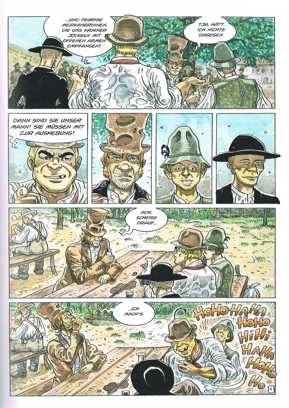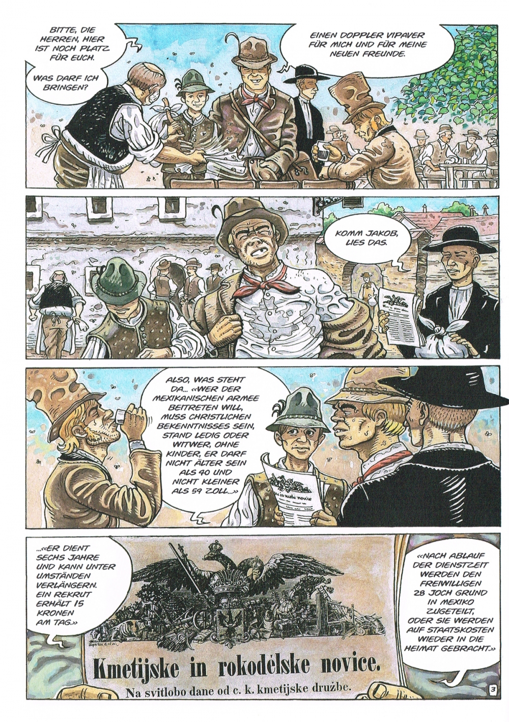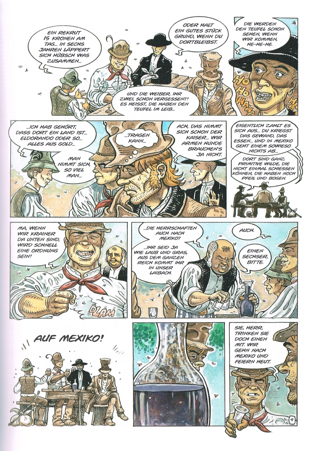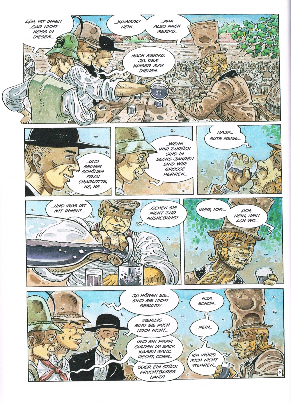 Die fünfbändige Graphic Novel Die Mexikaner entspinnt in einem breiten epischen Bogen die Geschichte dieser absurden Expedition, die mit dem Tod Tausender Soldaten und Zivilisten sowie des Kaisers selbst enden sollte. Ihre einzelnen Stationen – von der intriganten Anbahnung des „Geschäfts“ über die Rekrutierung der Freiwilligen, die Ankunft in Mexiko, die verschiedenen Kämpfe bis hin zum tragischen Ende – folgen den historischen Ereignissen. Diese aber bieten den Vorwand für eine böse Abenteuergeschichte, in der ein von seinen Leidenschaften getriebener Desperado die Hauptrolle spielt und die bisher noch nicht erzählt wurde. Die Mexikaner sind eine historisch fundierte Erzählung vom Scheitern des größenwahnsinnigen europäischen Expansionismus, aber auch eine Erzählung vom Scheitern der Flucht vor persönlicher Schuld.
