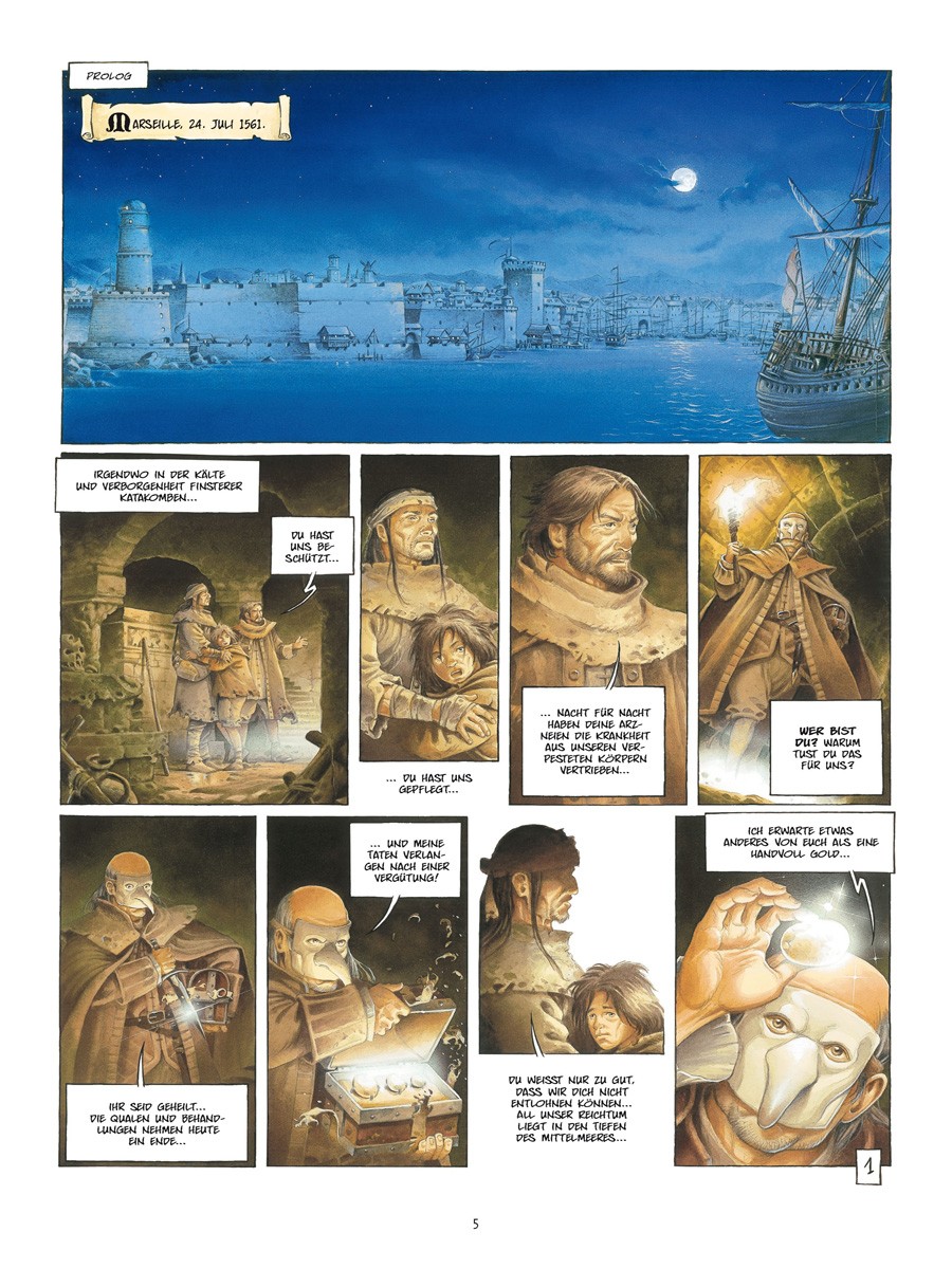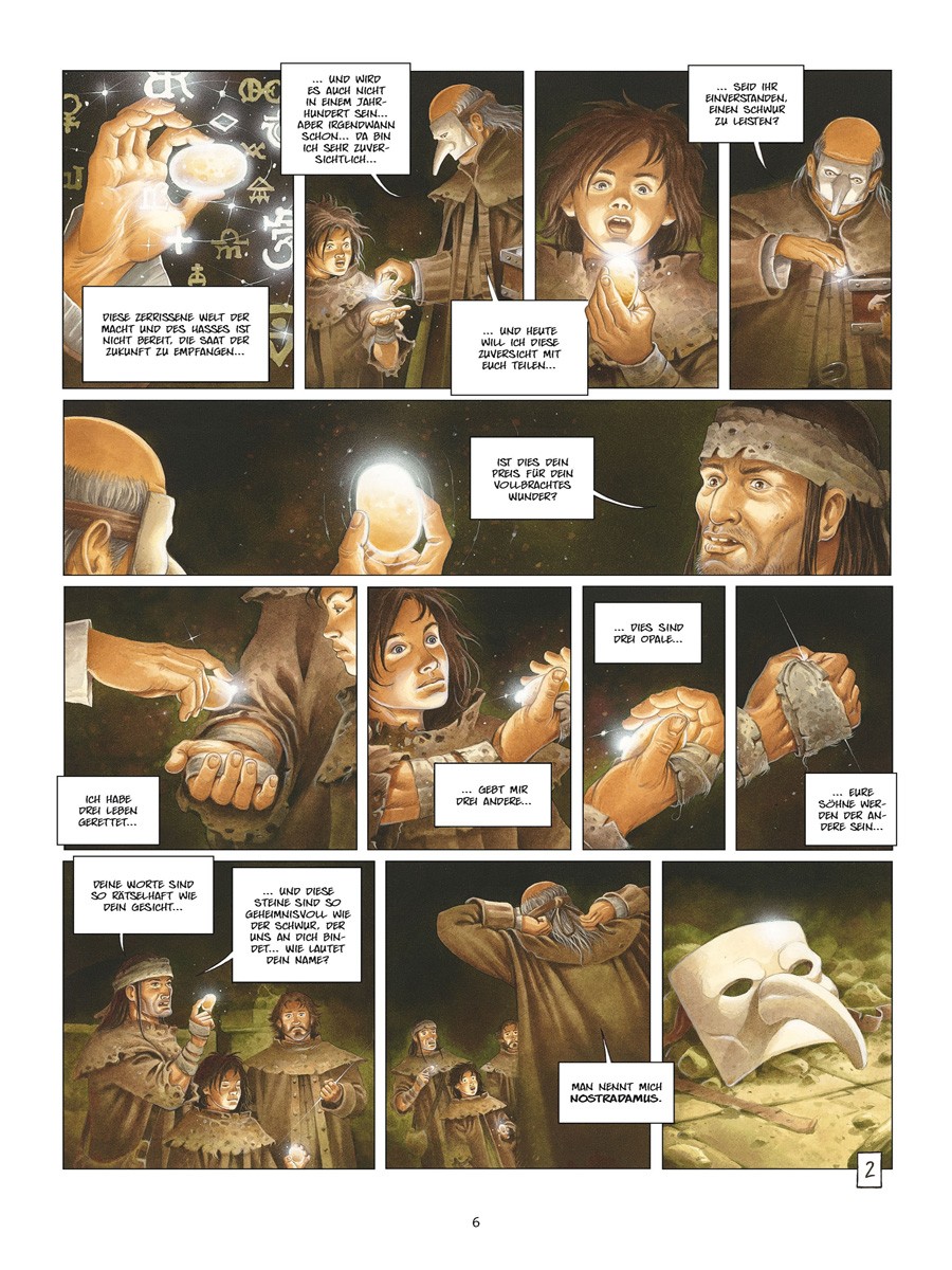 Marseille 1561. Ein gewisser Michel de Nostredame, besser bekannt als Nostradamus, rettet drei Schiffbrüchige und heilt sie von der Pest. Dafür verlangt er von ihnen, einen Eid zu leisten: "Ich rette eure drei Leben, gebt mir dafür drei andere. Hier habt ihr drei Opale; eure Kinder werden die Anderen sein."